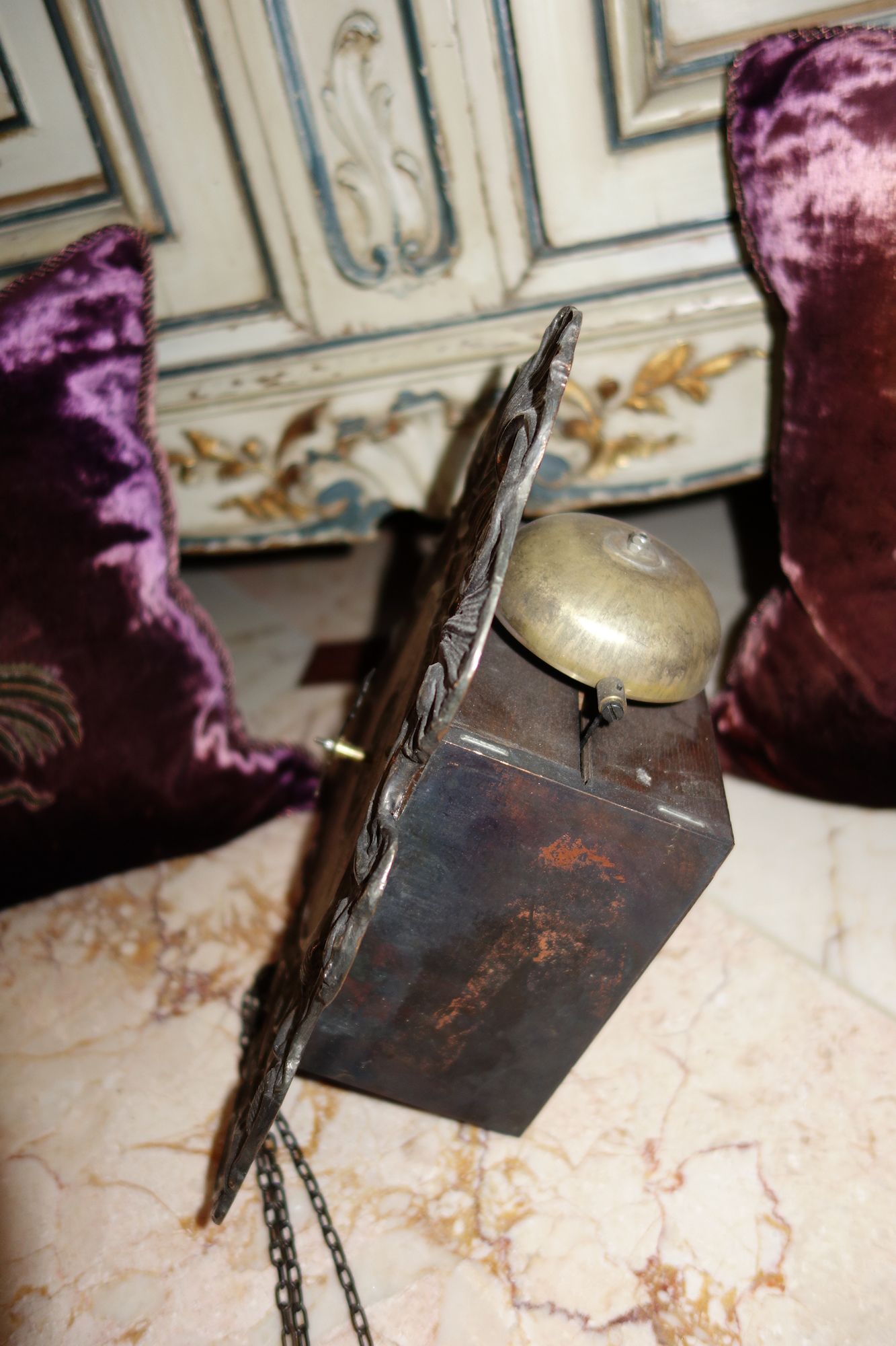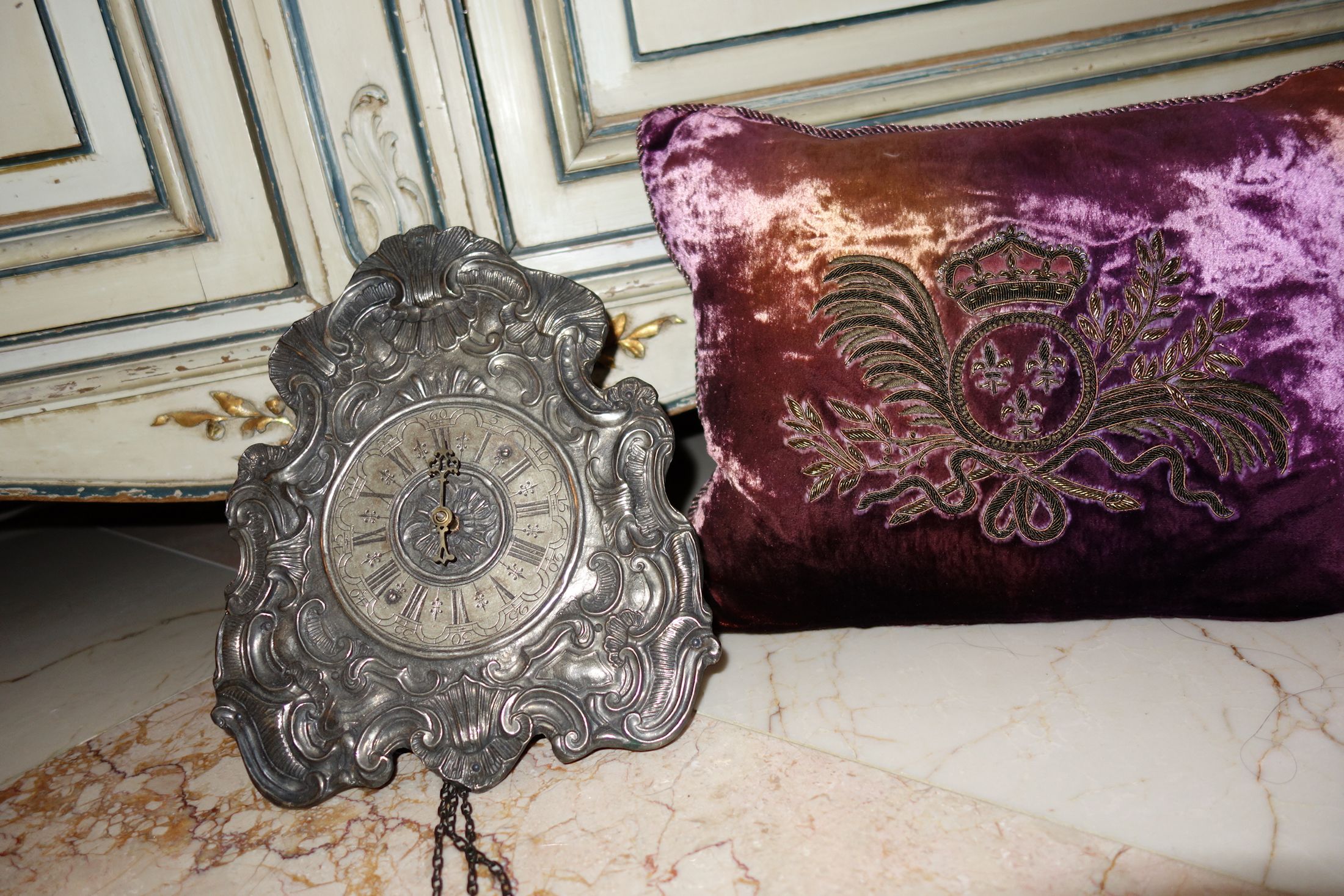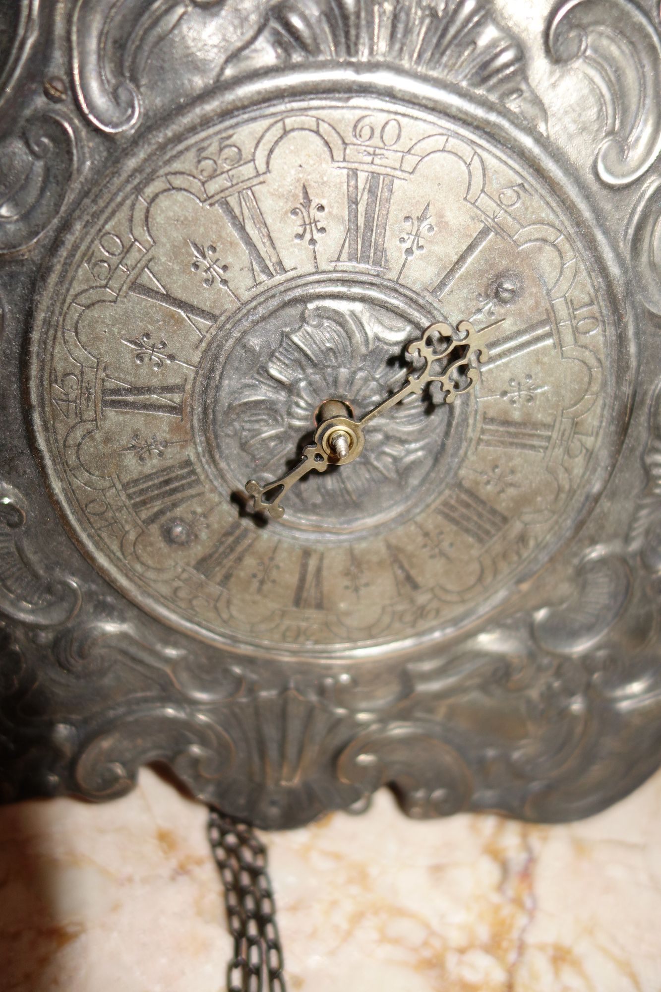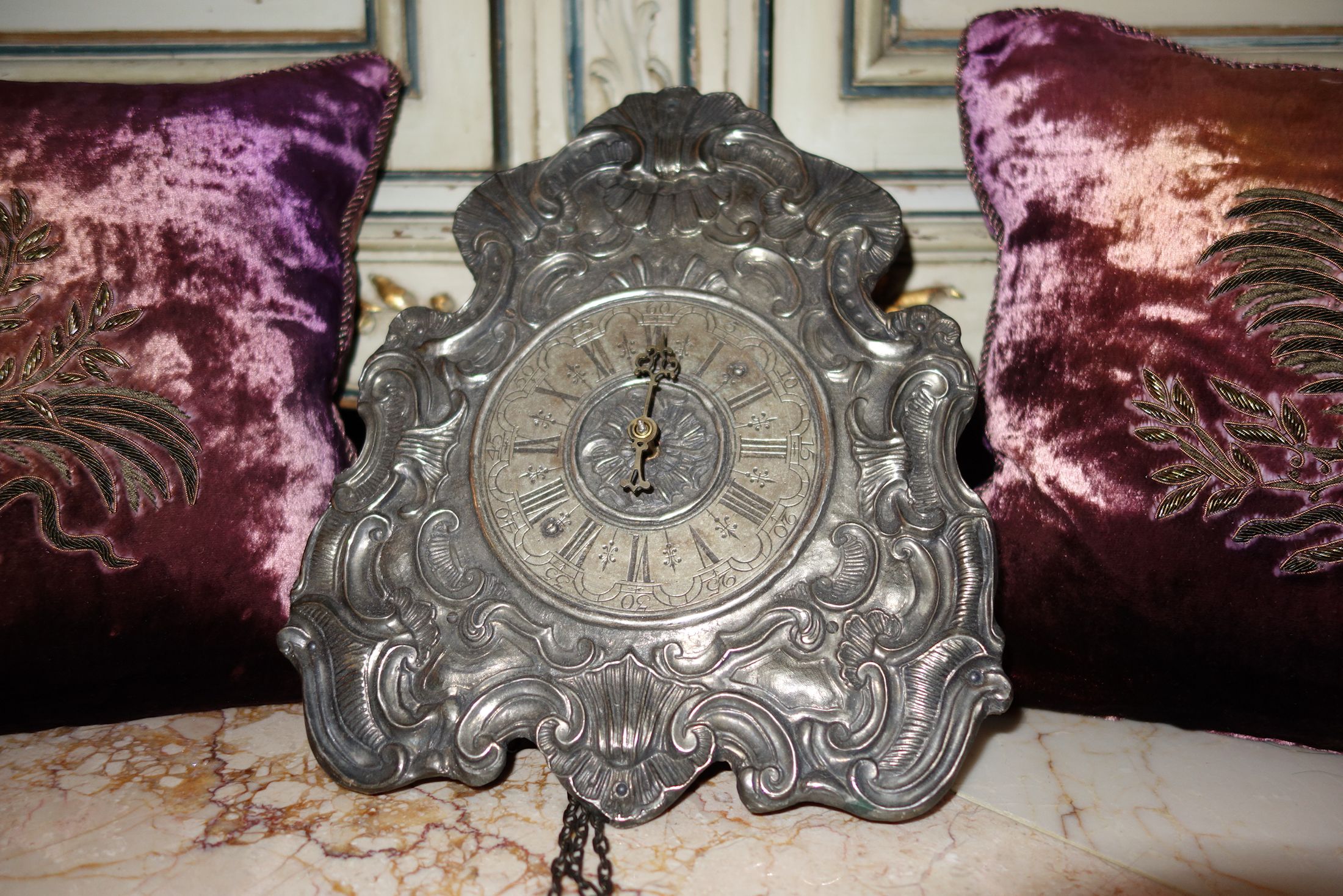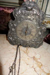 Silver/Clock. Vintage Ornate European Wall Clock. This is a beautiful Vintage clock in addition to all the ornate silver colored metal used in the making. It has the long chains attached to hold the weights and the bell which is shown on top. I have no weights or pendulum to it however can be purchased on ebay at a low price. I noticed the thin silver covered metal is wrapped around the front part hard substance. I don't know if its actually silver per say or just appears to be but it is metal. I hope I explained this well as I am not a clock person per say--selling as is. This works with weights and a Pendulum which are both missing. Its also a nice size for many walls and still makes a nice appearance.