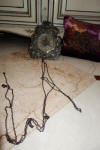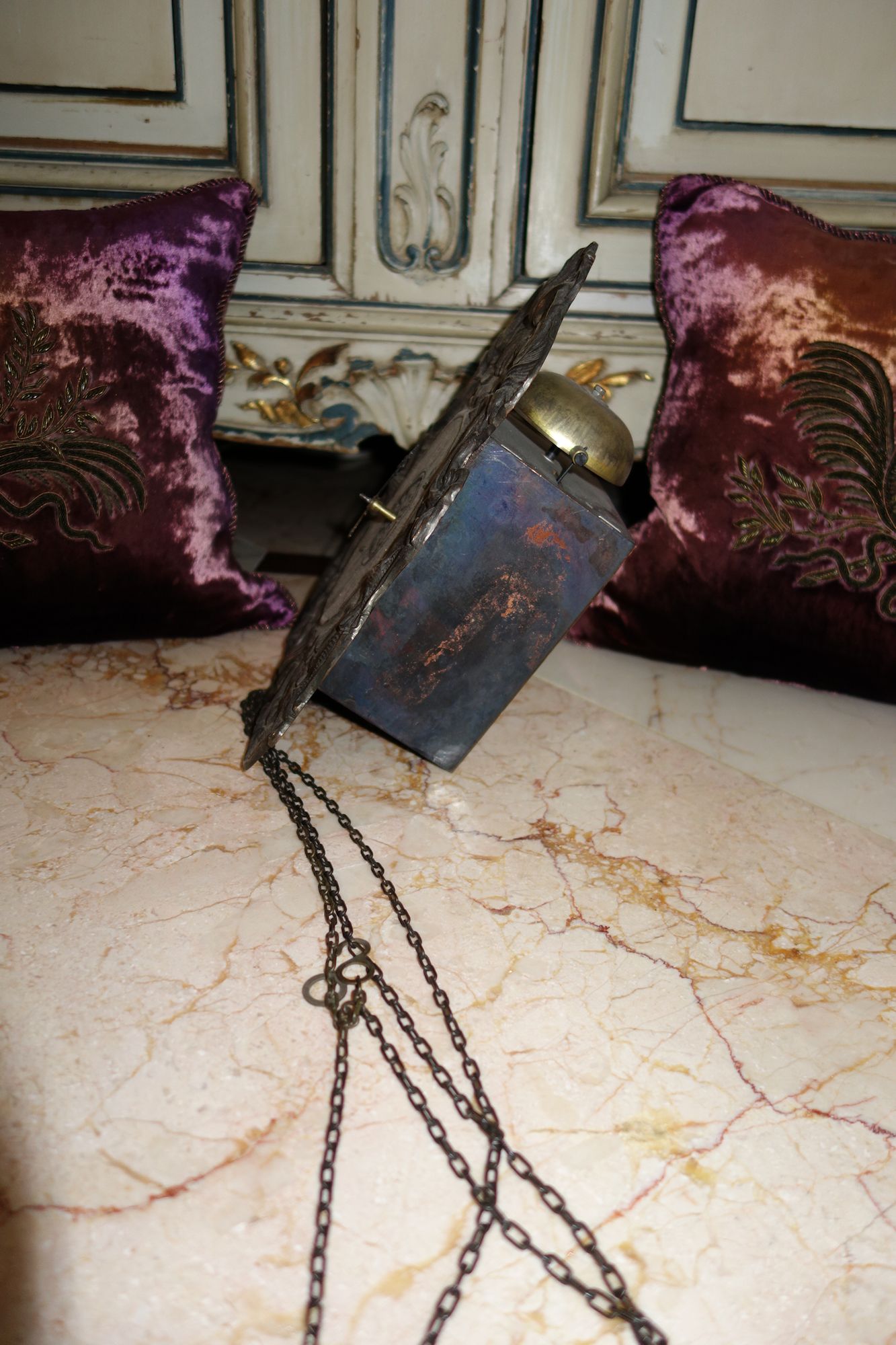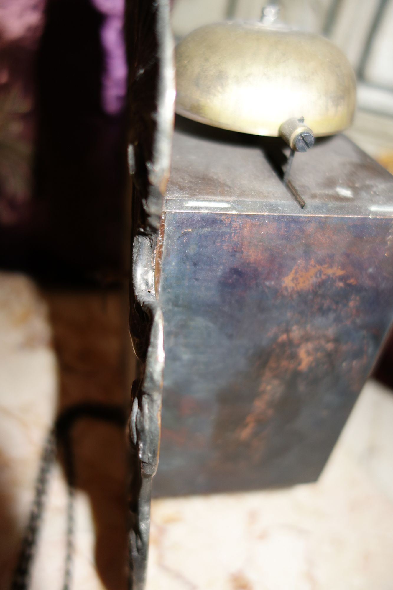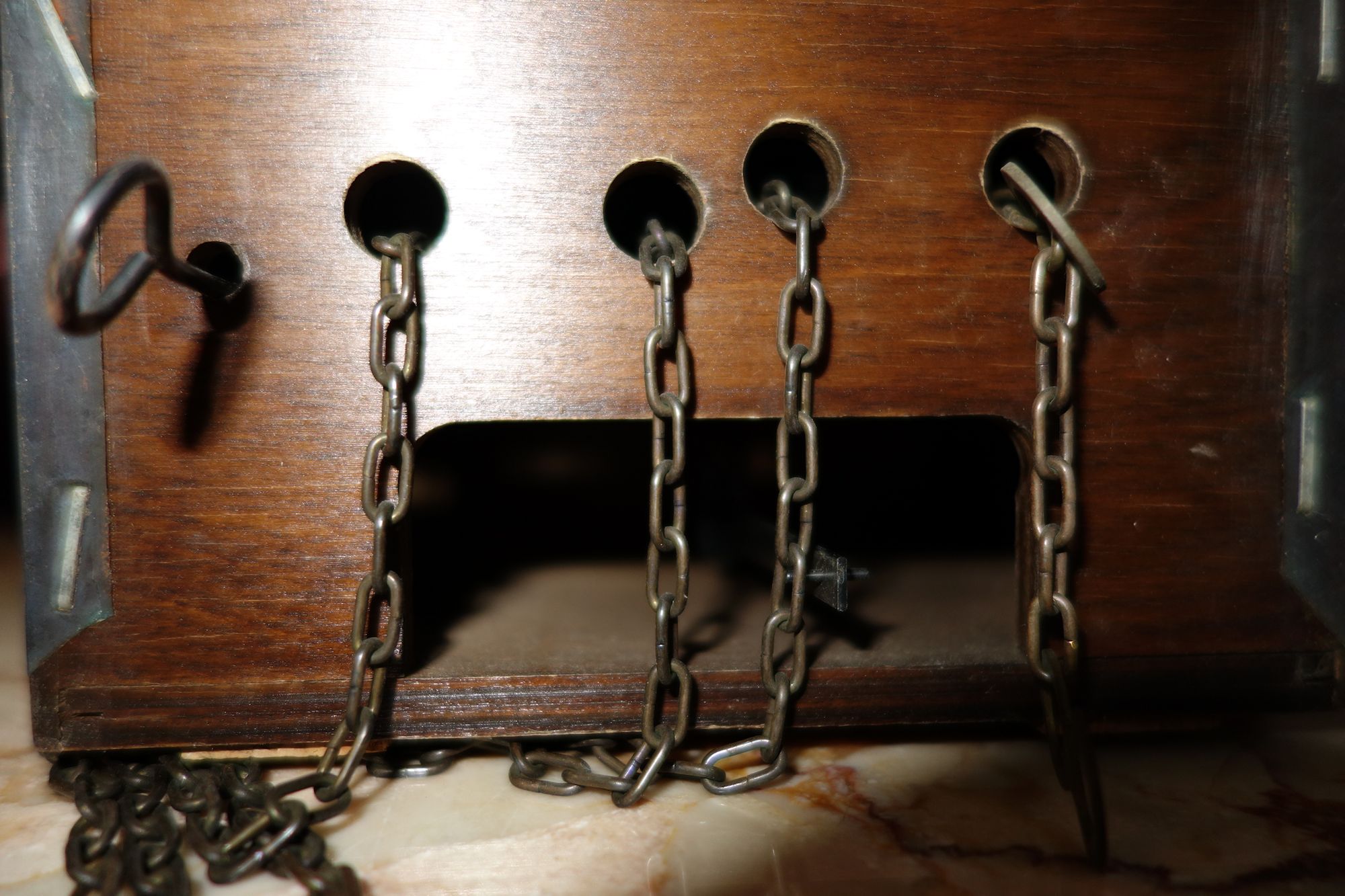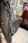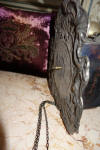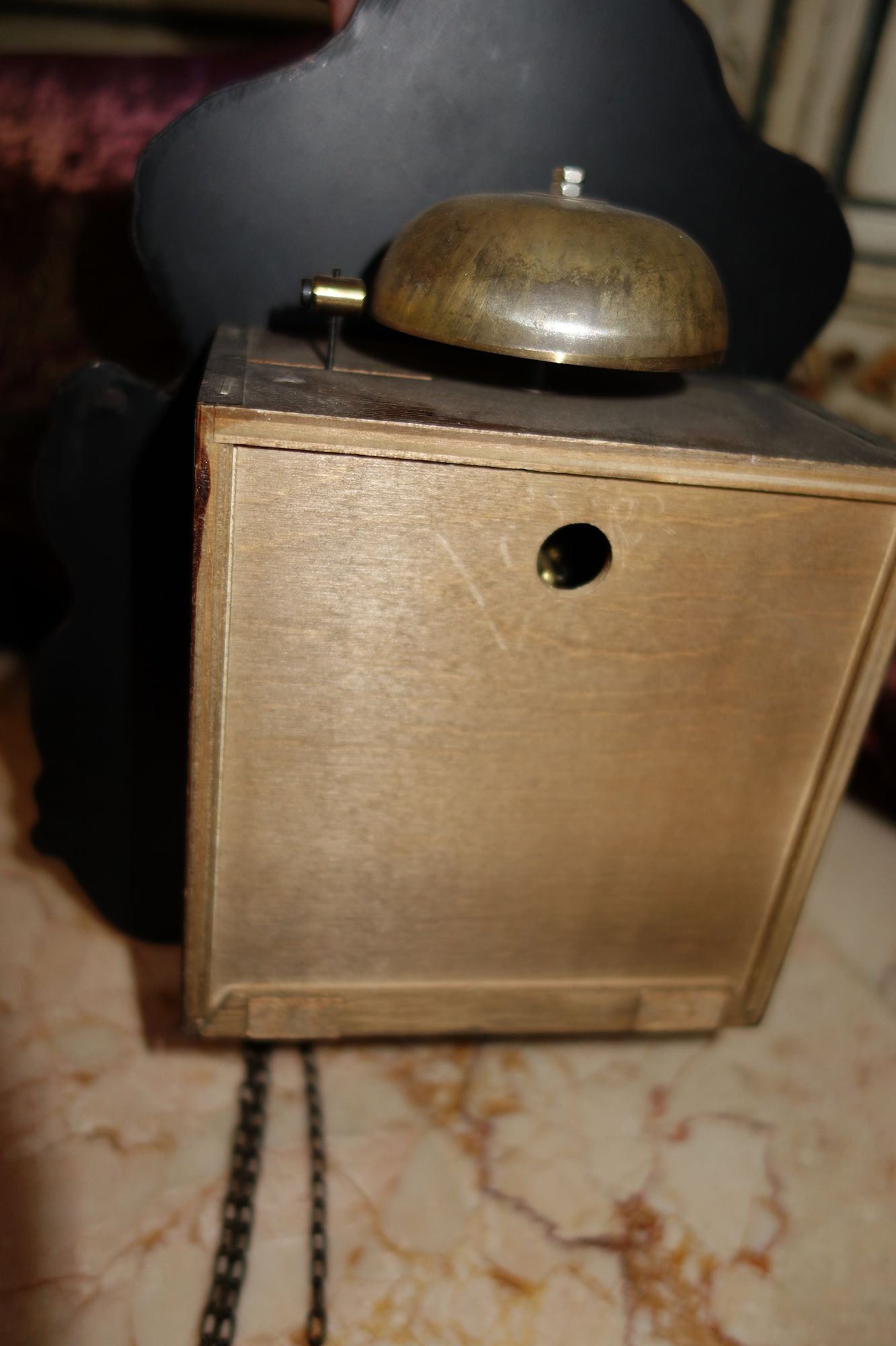 Silver/Clock. Vintage Ornate European Wall Clock. This is a beautiful Vintage clock in addition to all the ornate silver colored metal used in the making. It has the long chains attached to hold the weights and the bell which is shown on top. I have no weights or pendulum to it however can be purchased on ebay at a low price. I noticed the thin silver covered metal is wrapped around the front part hard substance. I don't know if its actually silver per say or just appears to be but it is metal. I hope I explained this well as I am not a clock person per say--selling as is. This works with weights and a Pendulum which are both missing. Its also a nice size for many walls and still makes a nice appearance.