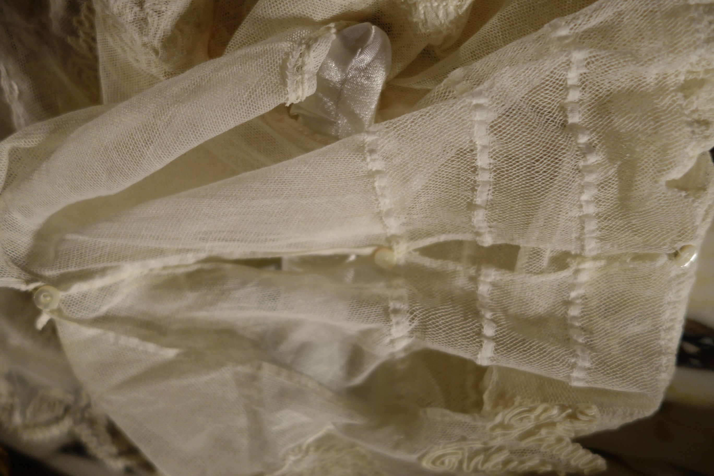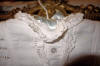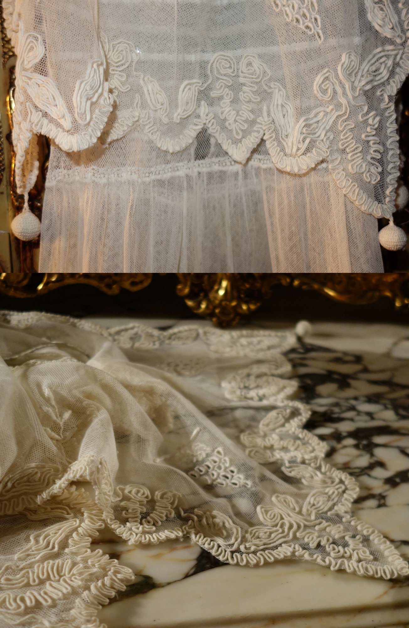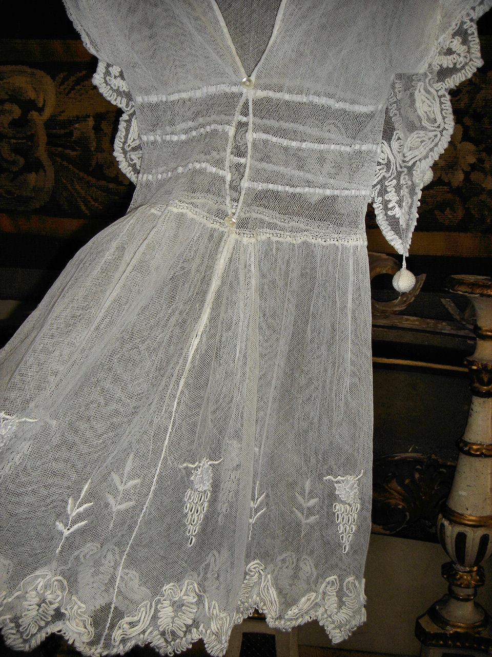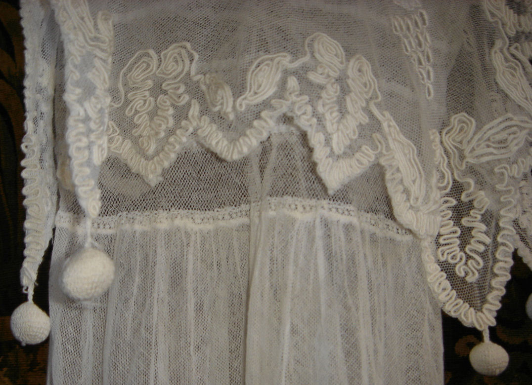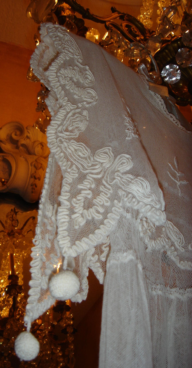 The lace you see hanging has come undo and also would need to be re-stitched along the lower section following the pattern which is easy yet with a little time. This is a piece from the past which has been well taken care of other then what was mentioned above. You will not be disappointed if you are a collector or merely wish to use this spectacular French Antique Cape for personal use.