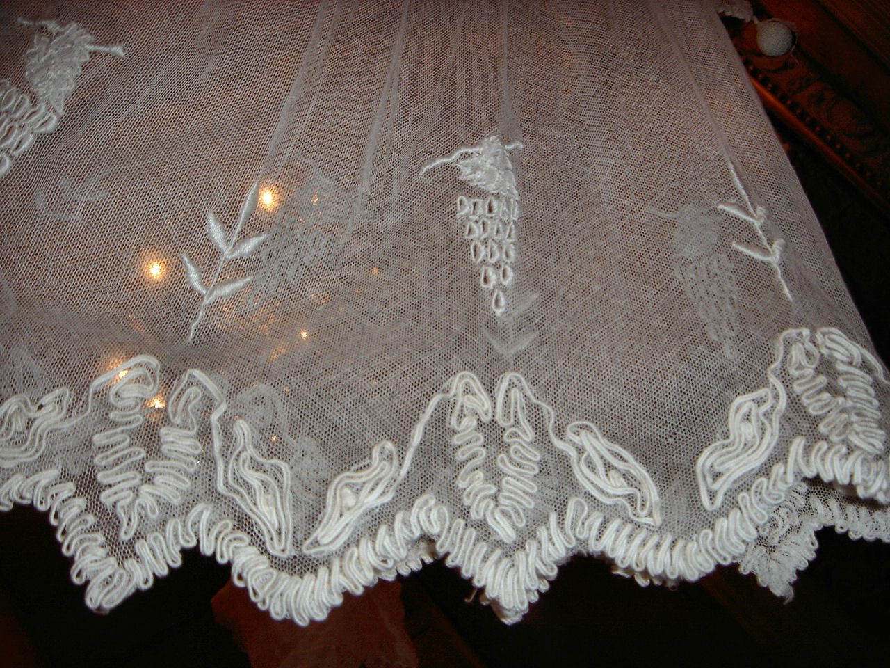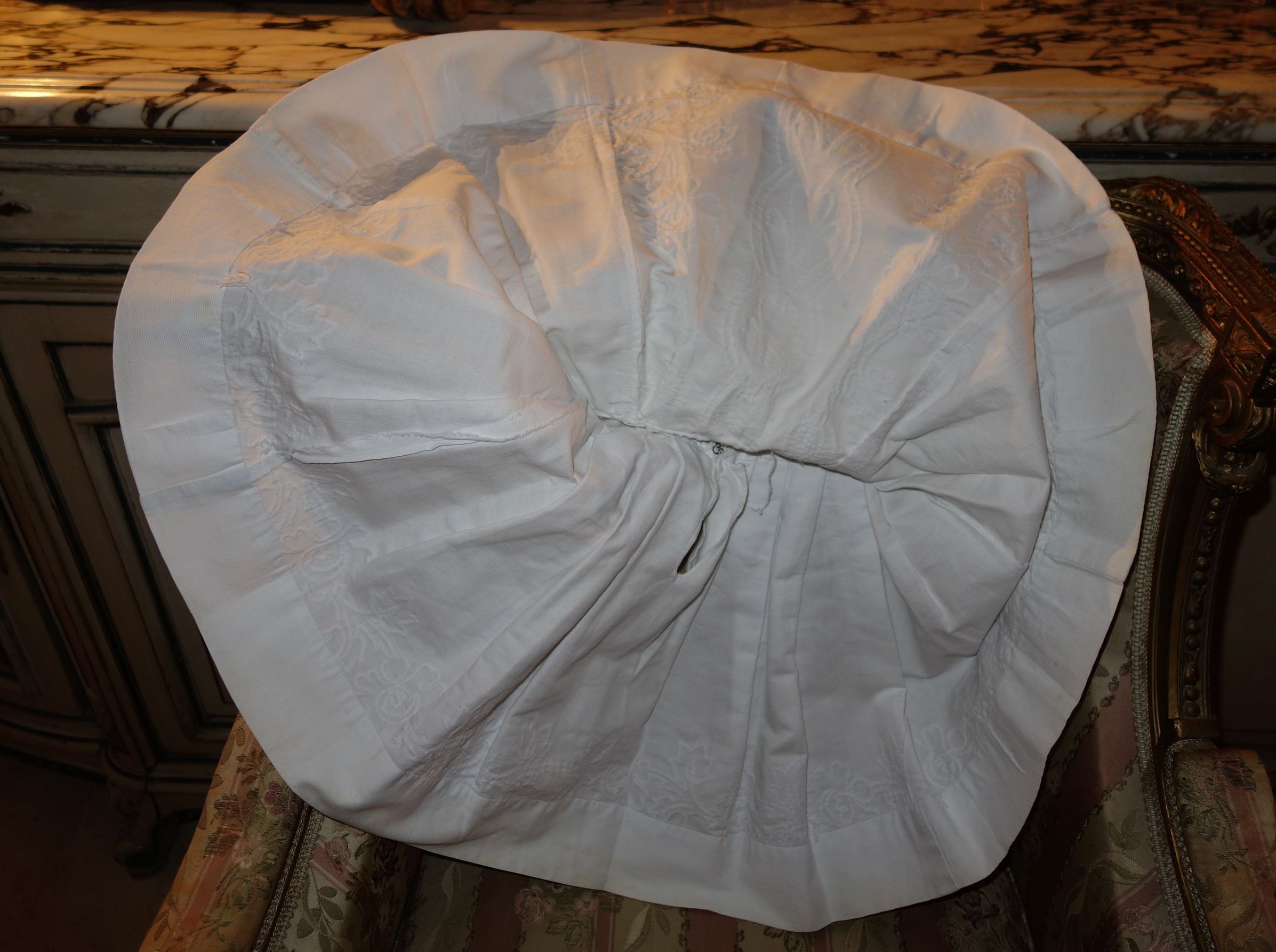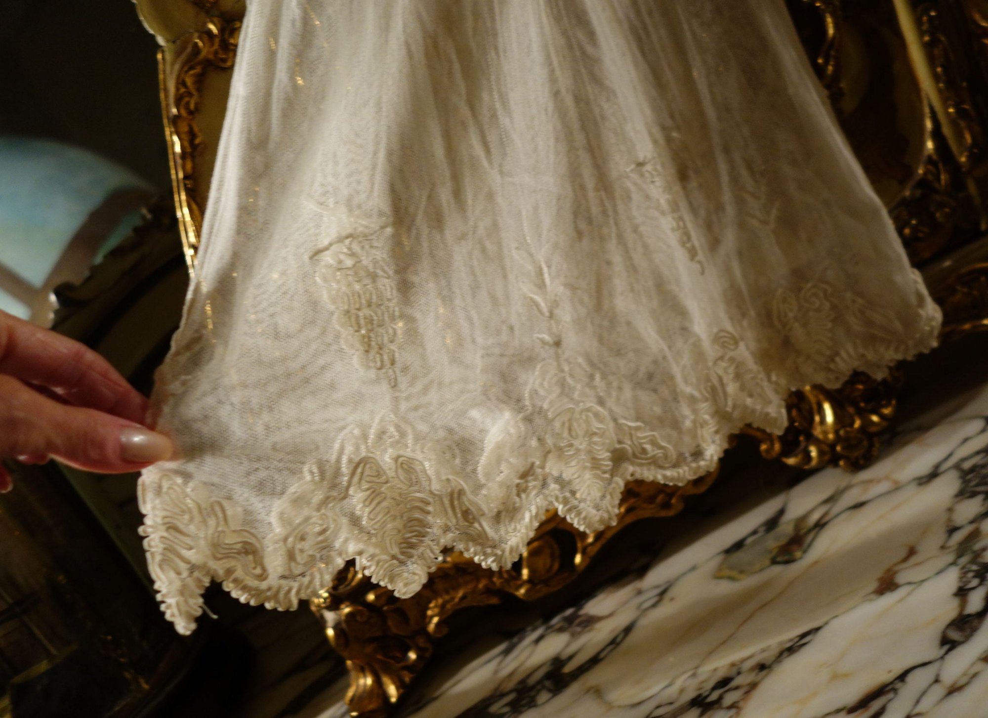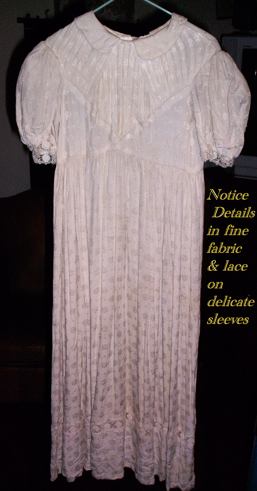 The lace you see hanging has come undo and also would need to be re-stitched along the lower section following the pattern which is easy yet with a little time. This is a piece from the past which has been well taken care of other then what was mentioned above. You will not be disappointed if you are a collector or merely wish to use this spectacular French Antique Cape for personal use.