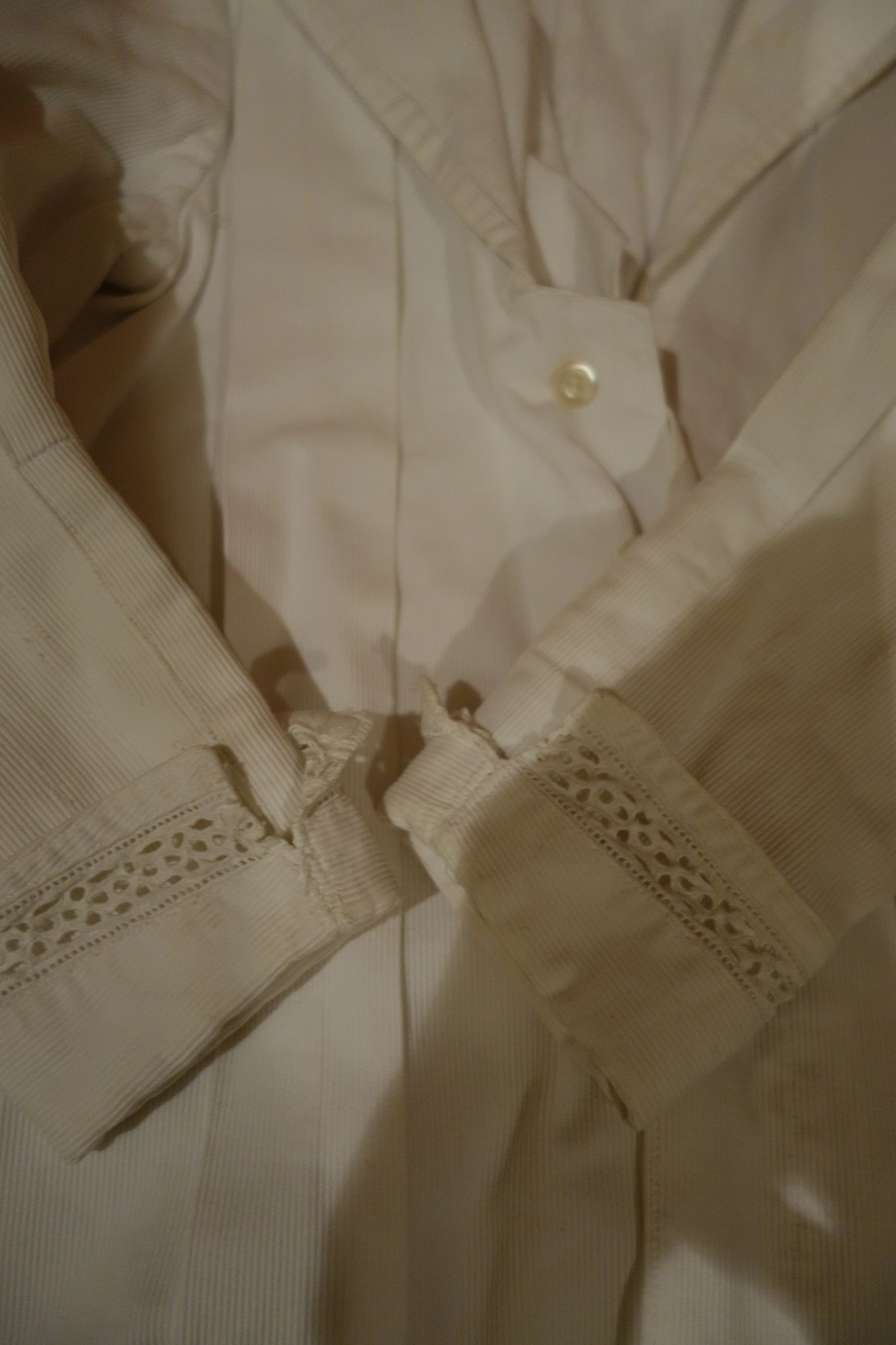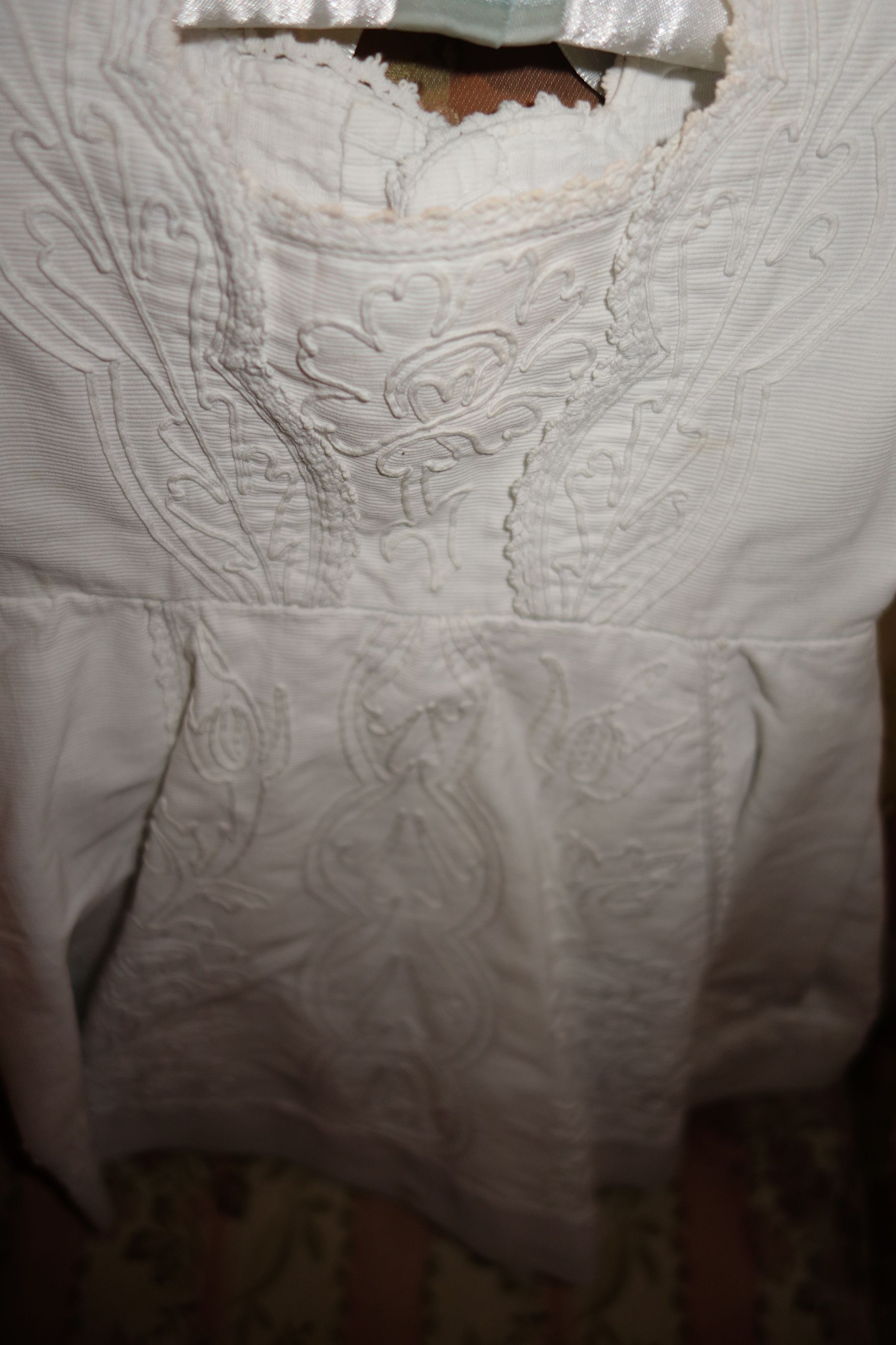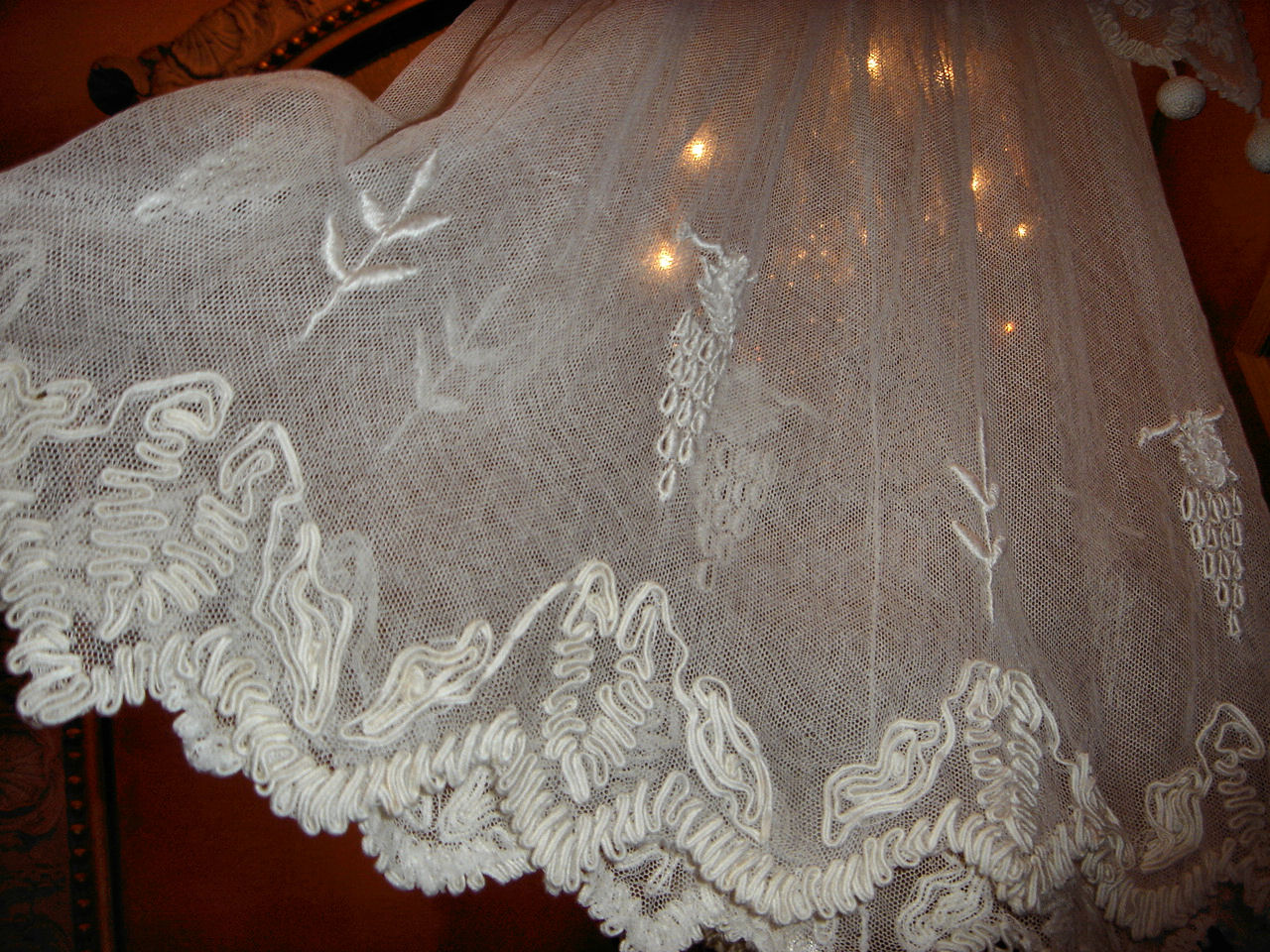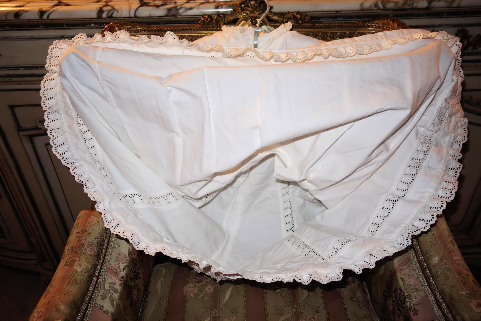 The lace you see hanging has come undo and also would need to be re-stitched along the lower section following the pattern which is easy yet with a little time. This is a piece from the past which has been well taken care of other then what was mentioned above. You will not be disappointed if you are a collector or merely wish to use this spectacular French Antique Cape for personal use.