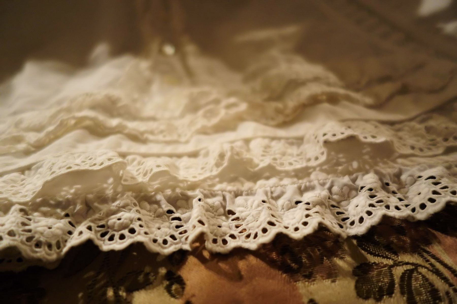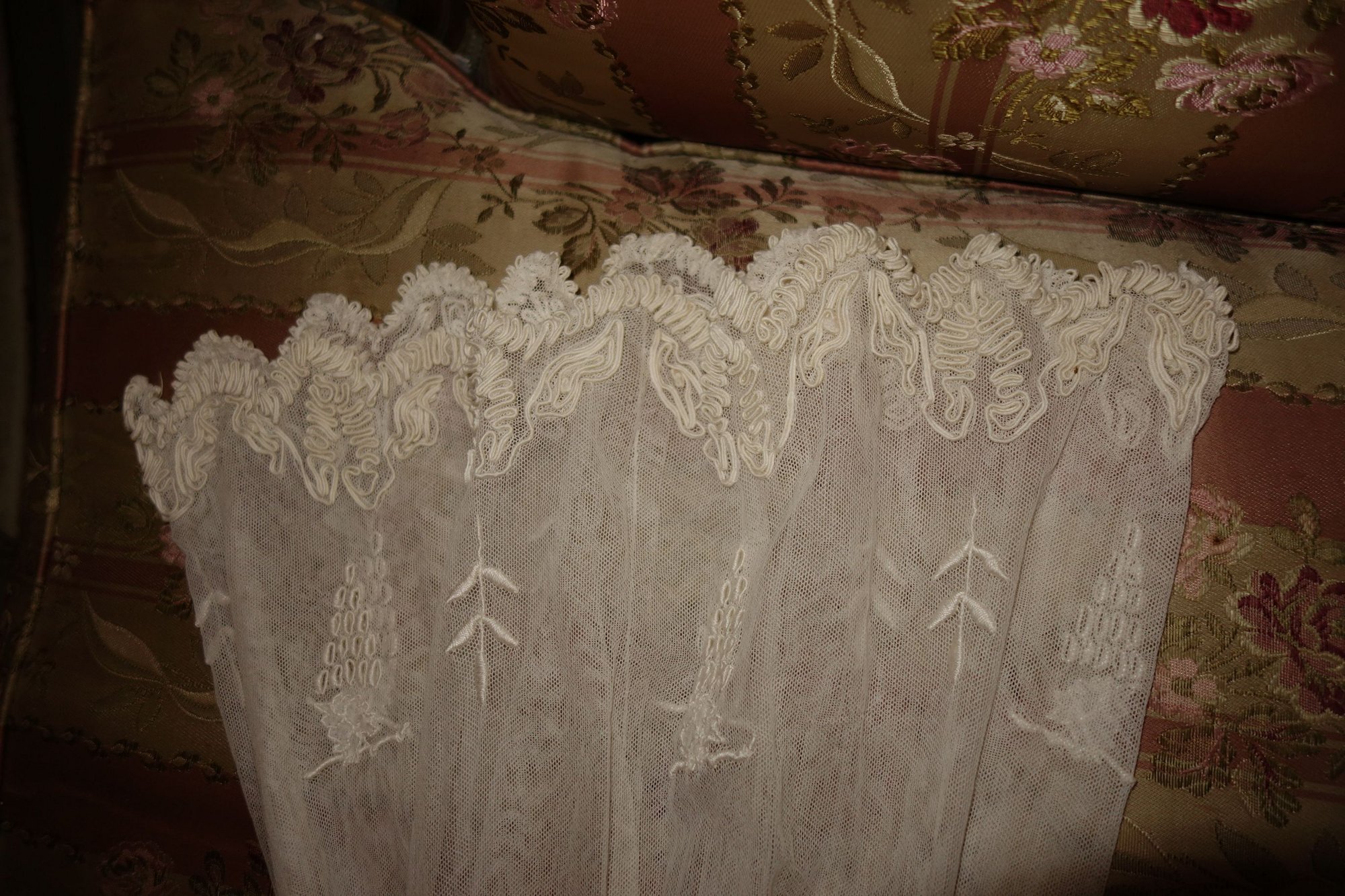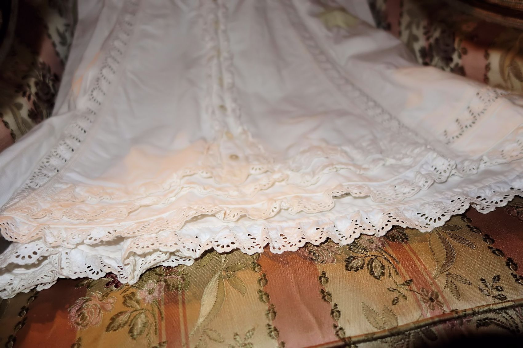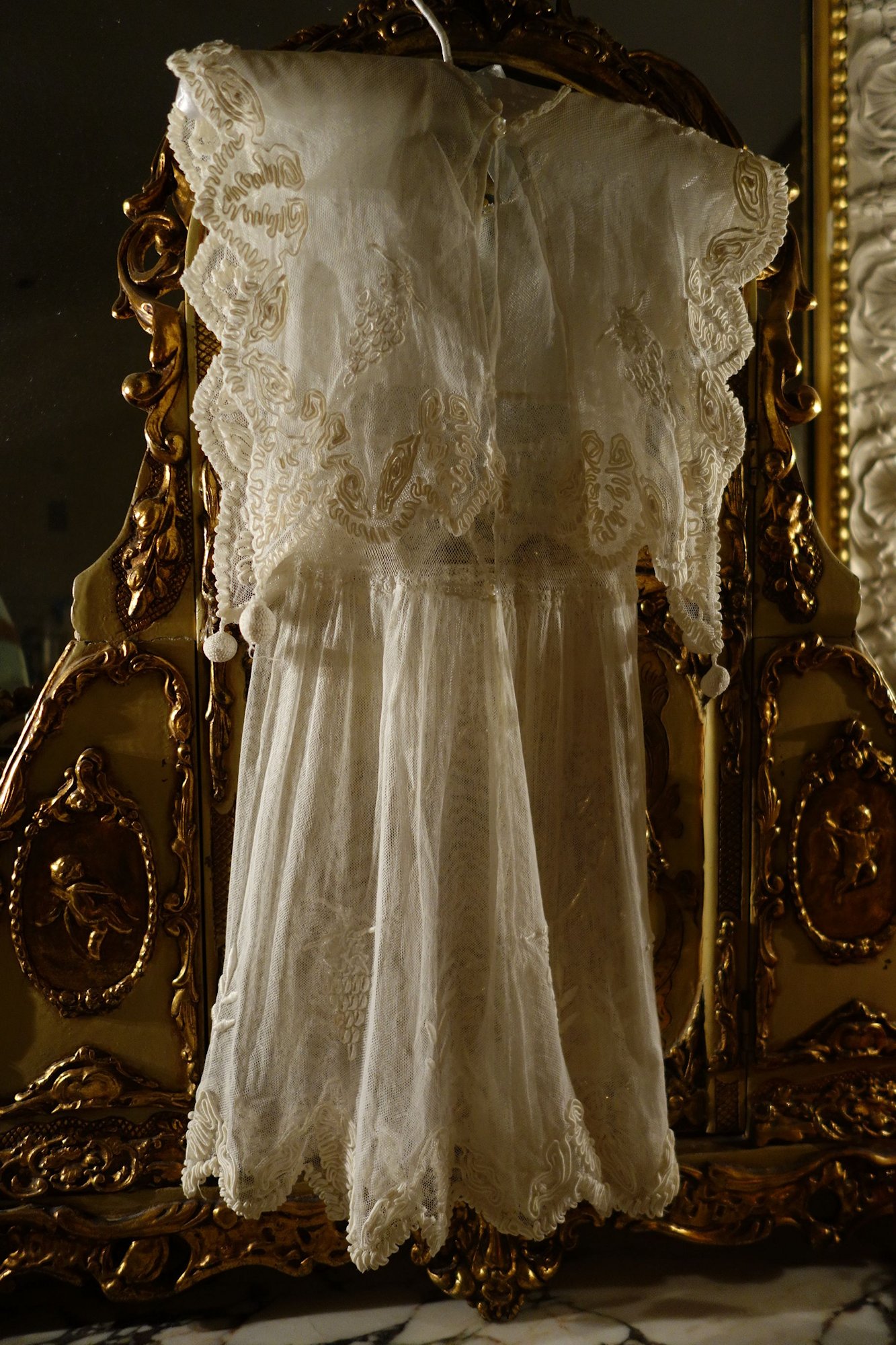 The lace you see hanging has come undo and also would need to be re-stitched along the lower section following the pattern which is easy yet with a little time. This is a piece from the past which has been well taken care of other then what was mentioned above. You will not be disappointed if you are a collector or merely wish to use this spectacular French Antique Cape for personal use.