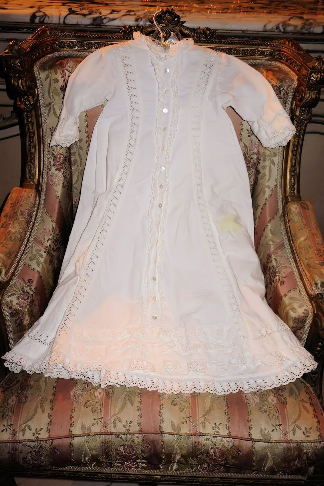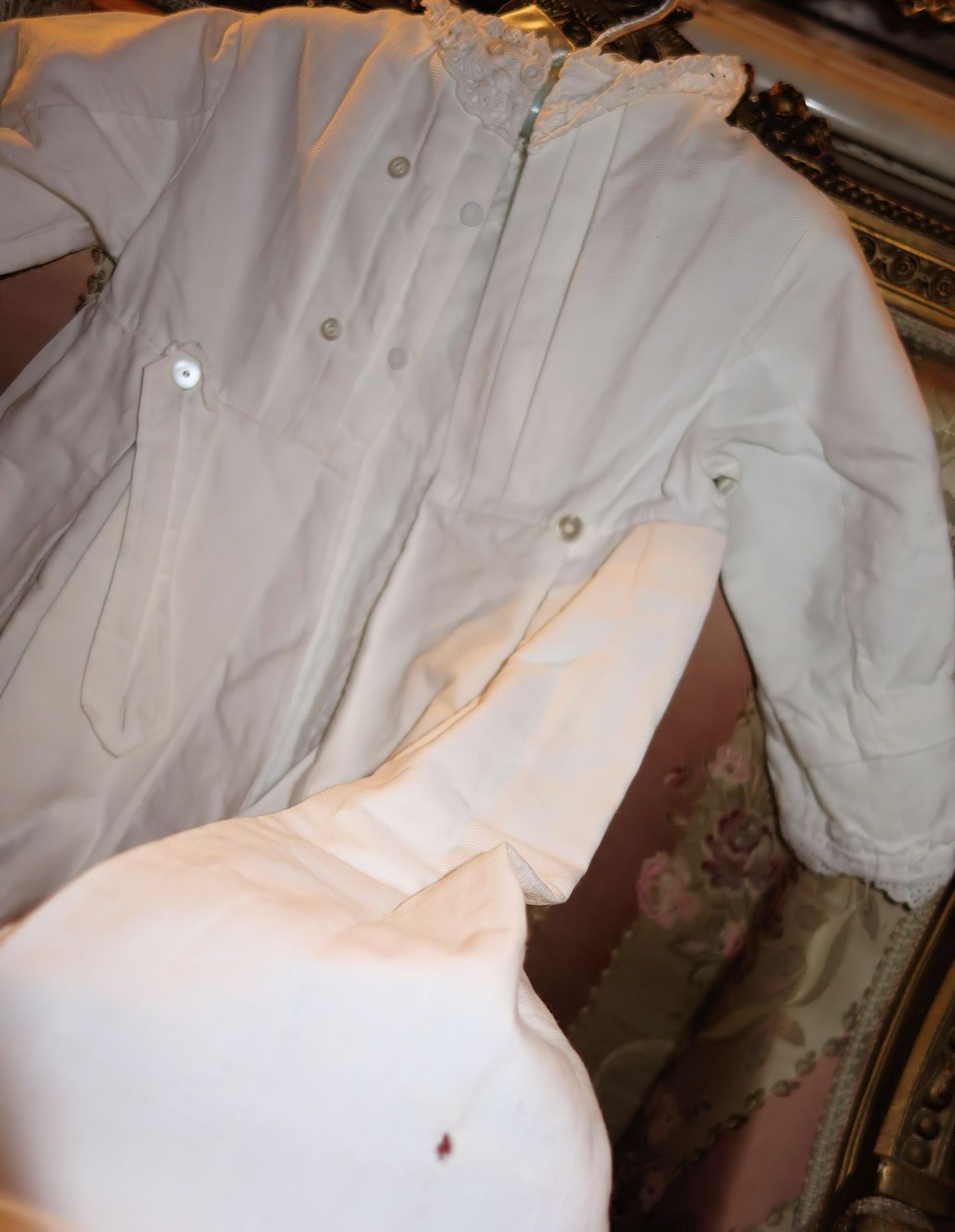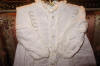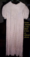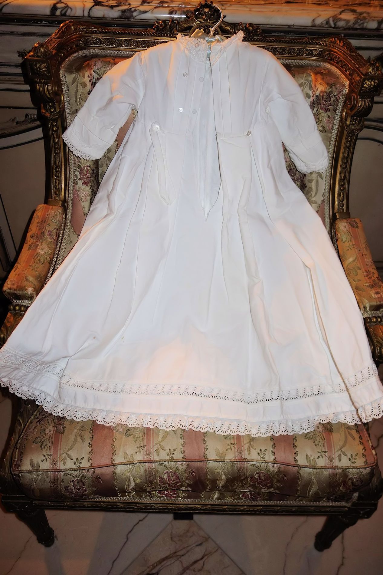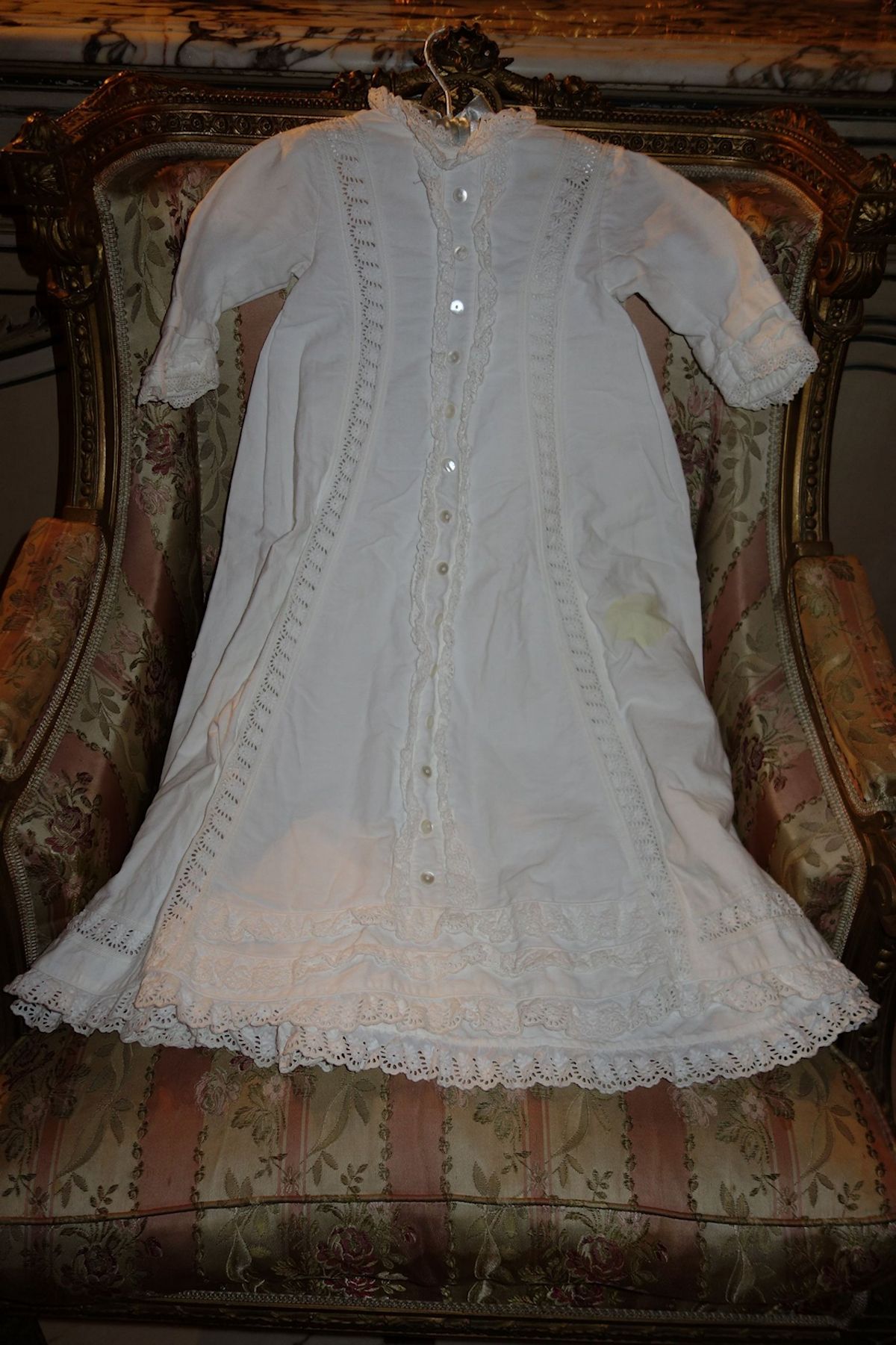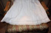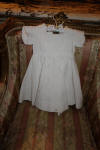 #ChildsDressWhiteCotton3: Beautiful Antique French Antique Childs Baptismal dress. Wonderful for your Antique Bisque doll for display or for a wall display or Baptismal baby dress. Brought back directly from France on one of my trips several years ago and made of Cotton having a intricate smaller lace collar and much more lace at base along with surrounding on dress as shown. A small belt buttons at back. There is a tiny hole on right side the size of a pencil eraser. There a minor stain markings also about three at base and looks like they could be easily taken off-they appear like tiny lines-4 total. The dress is filled with lace and pressed and clean.