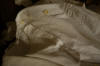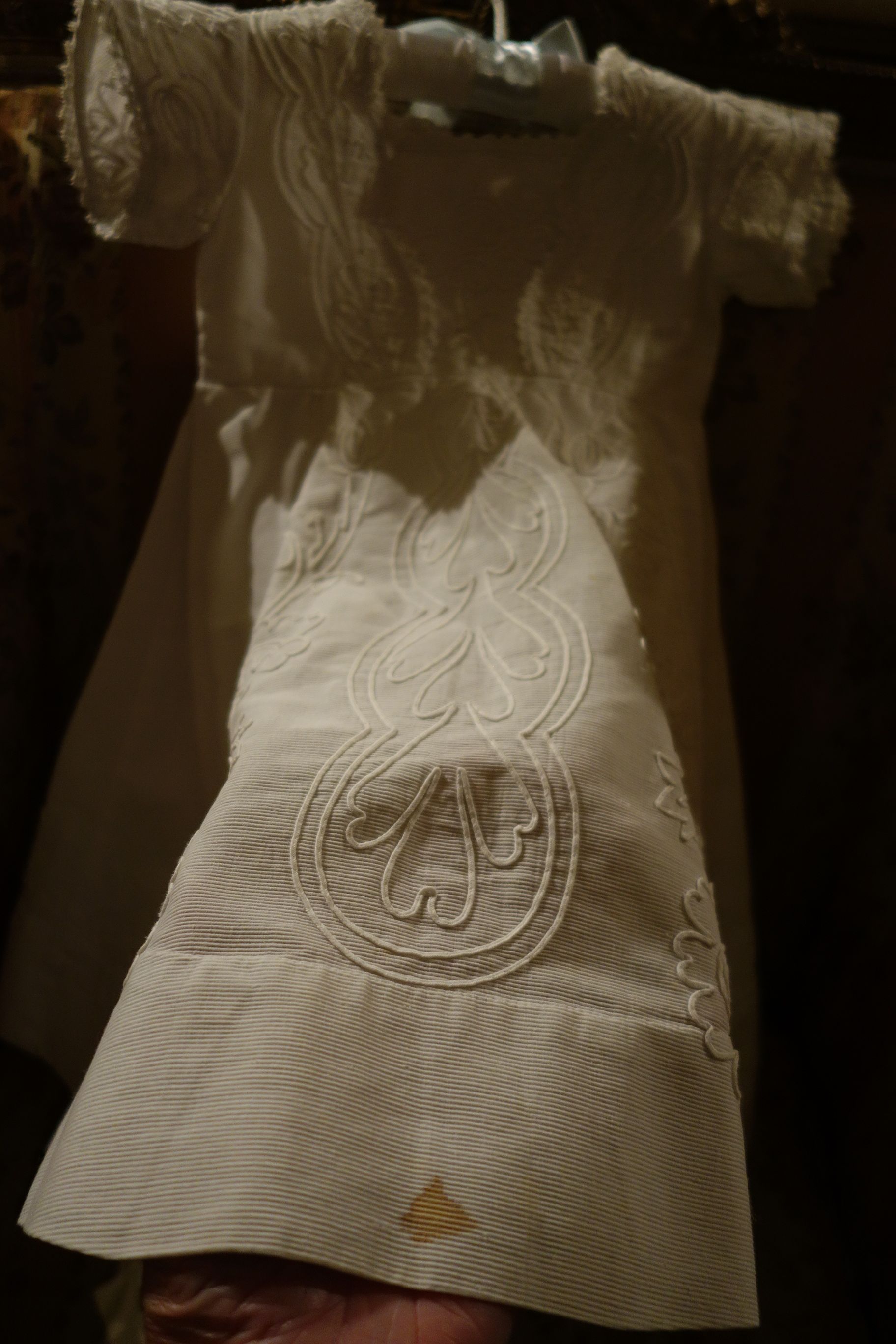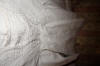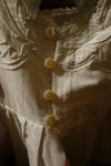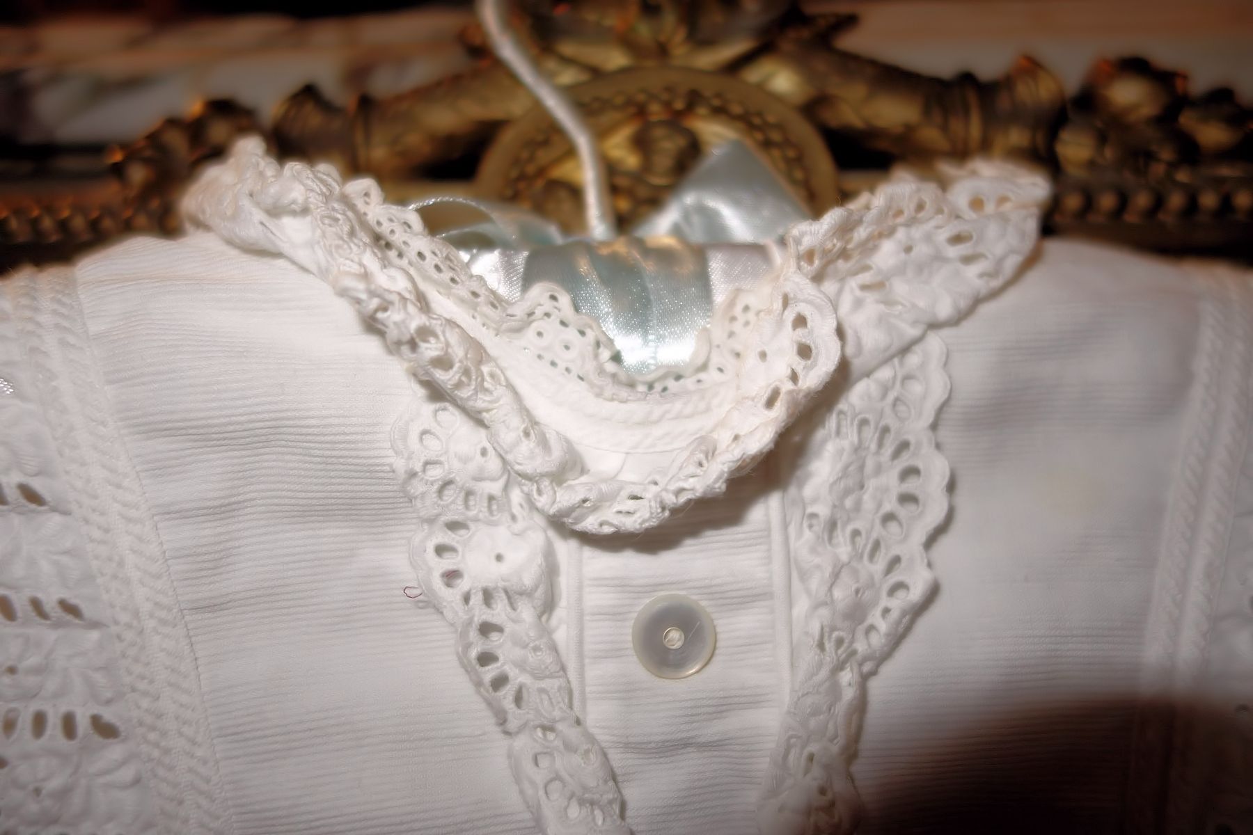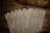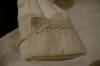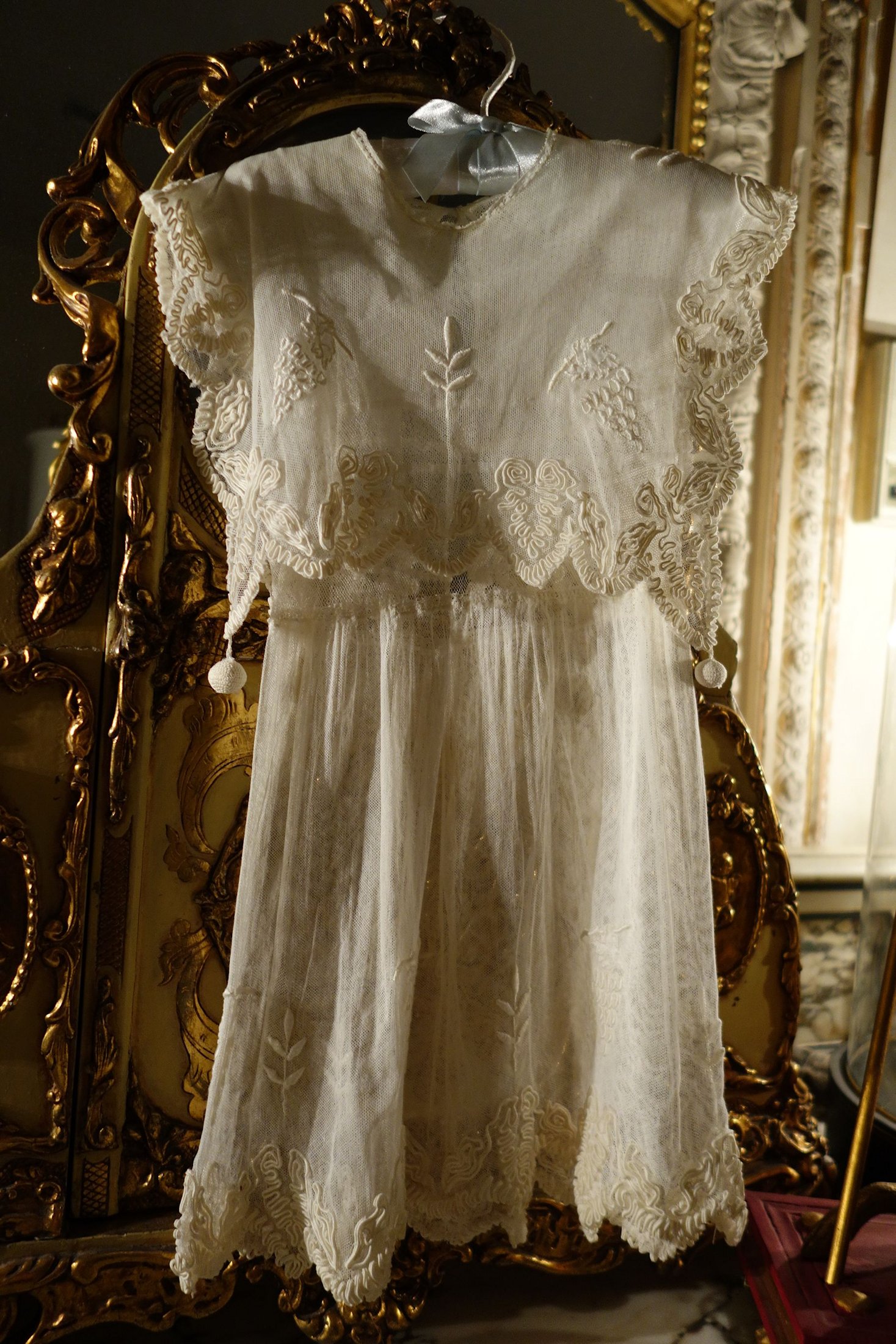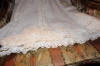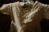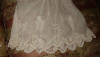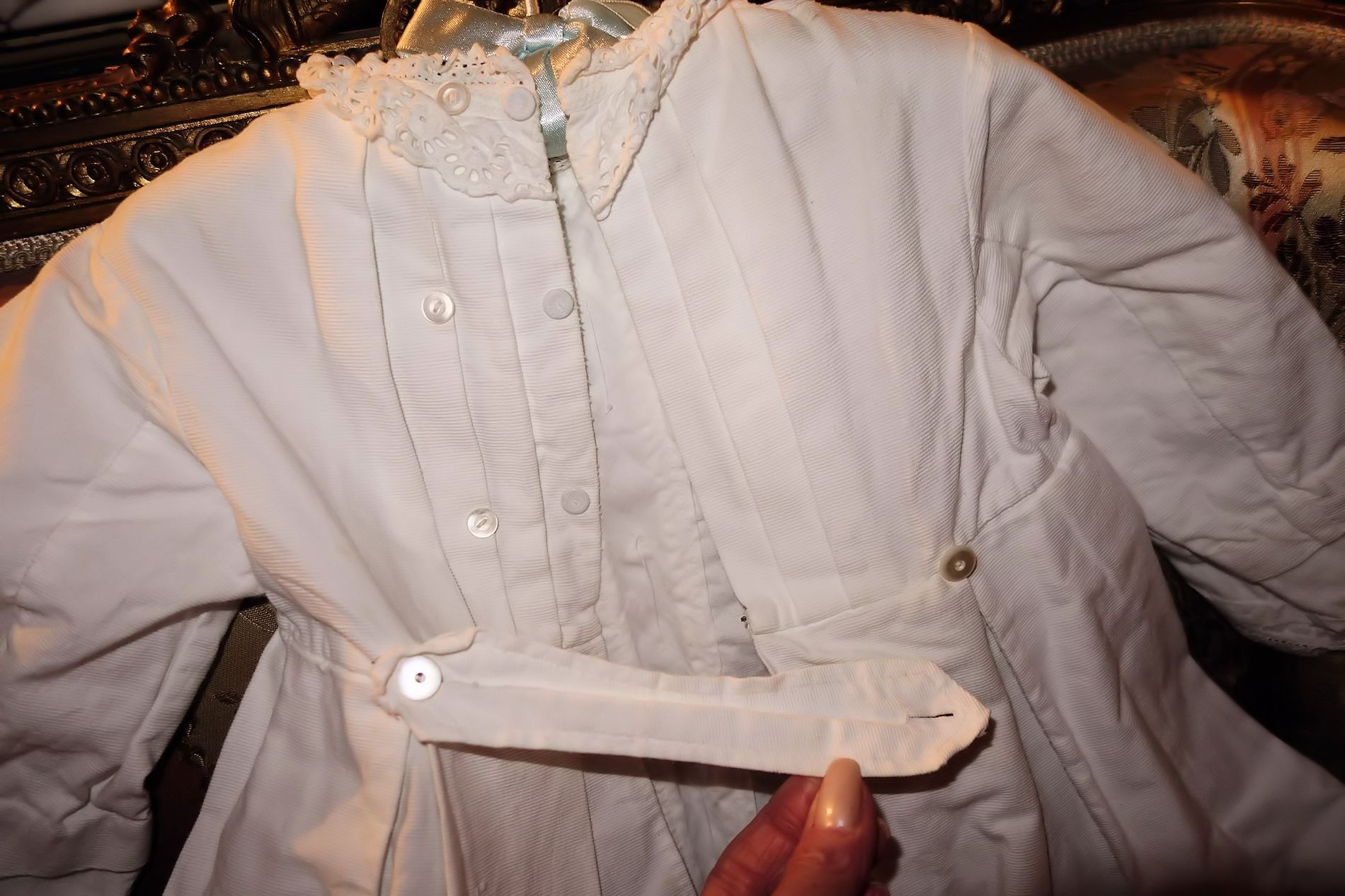 #ChildsDressWhiteCotton3: Beautiful Antique French Antique Childs Baptismal dress. Wonderful for your Antique Bisque doll for display or for a wall display or Baptismal baby dress. Brought back directly from France on one of my trips several years ago and made of Cotton having a intricate smaller lace collar and much more lace at base along with surrounding on dress as shown. A small belt buttons at back. There is a tiny hole on right side the size of a pencil eraser. There a minor stain markings also about three at base and looks like they could be easily taken off-they appear like tiny lines-4 total. The dress is filled with lace and pressed and clean.