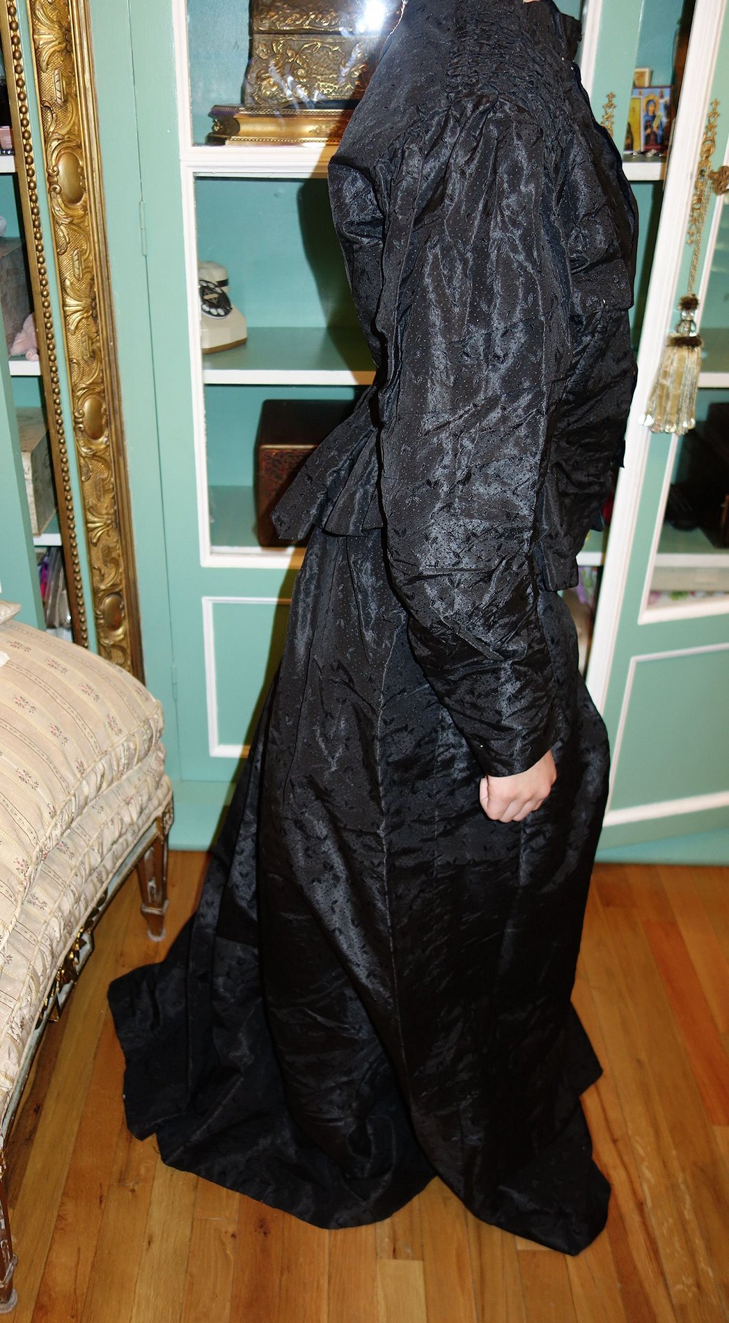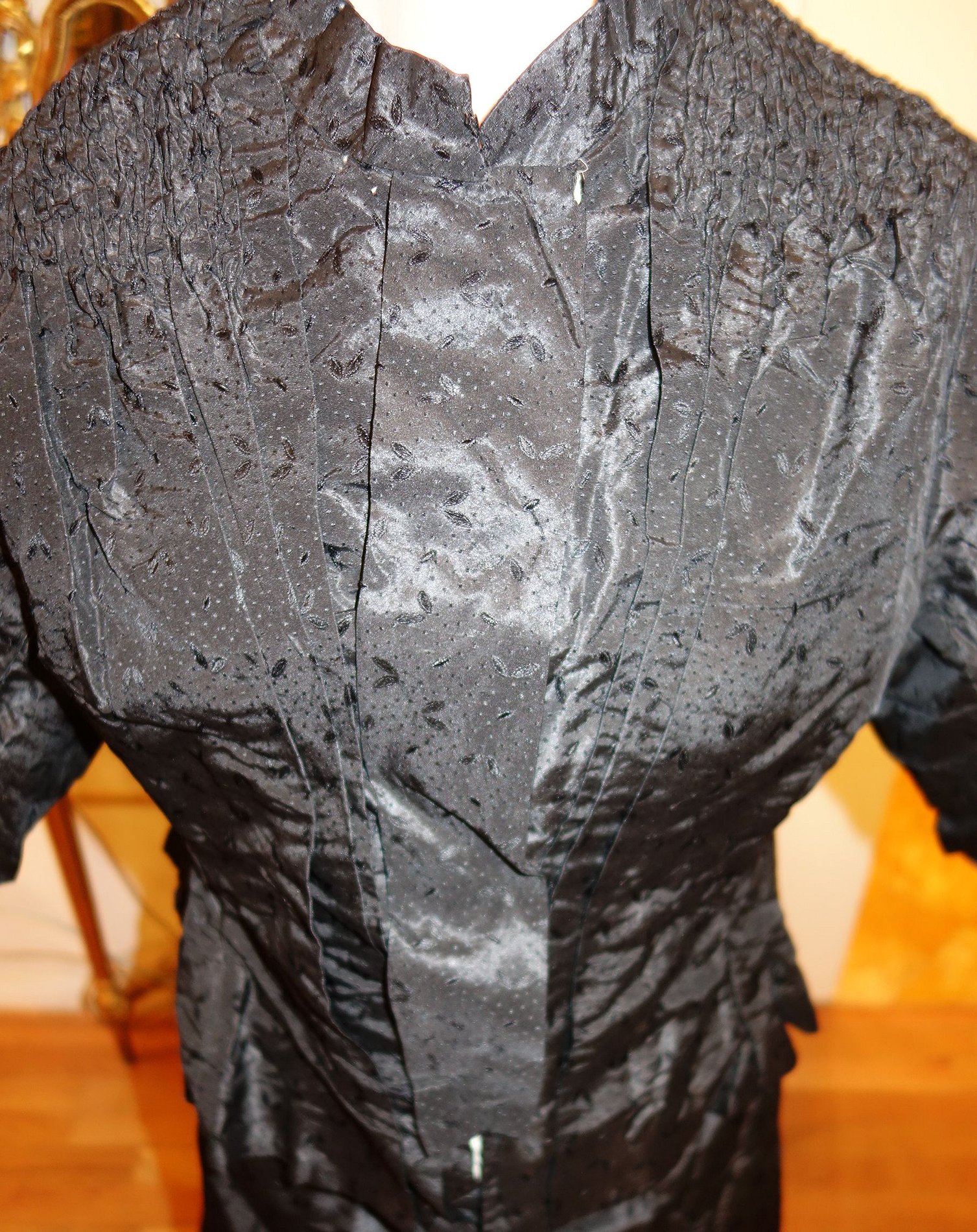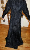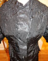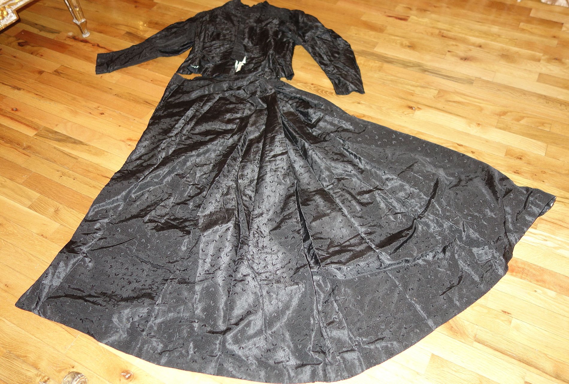 BlkAntique2pc.Dress/Outfit. Antique French Silk Skirt & Top Outfit 2 pcs. Lovely Black Silk French Skirt & Matching top circa late 1800's and directly from France. It comes in two pieces as shown having stays in the upper top area inside and a cretin in the skirt area only about half way as shown with soiled markings. The upper top has small holes due to age. If you are a collector of such -- you must wish to add this special piece to your collection. The upper top also has extra padding for the bust area as shown-- as many wore these back then. Selling as is due to holes in fabric and soils plus rusty areas on the interior top as well. Beautiful Gathering at shoulders as shown. Price: $275.