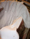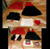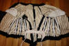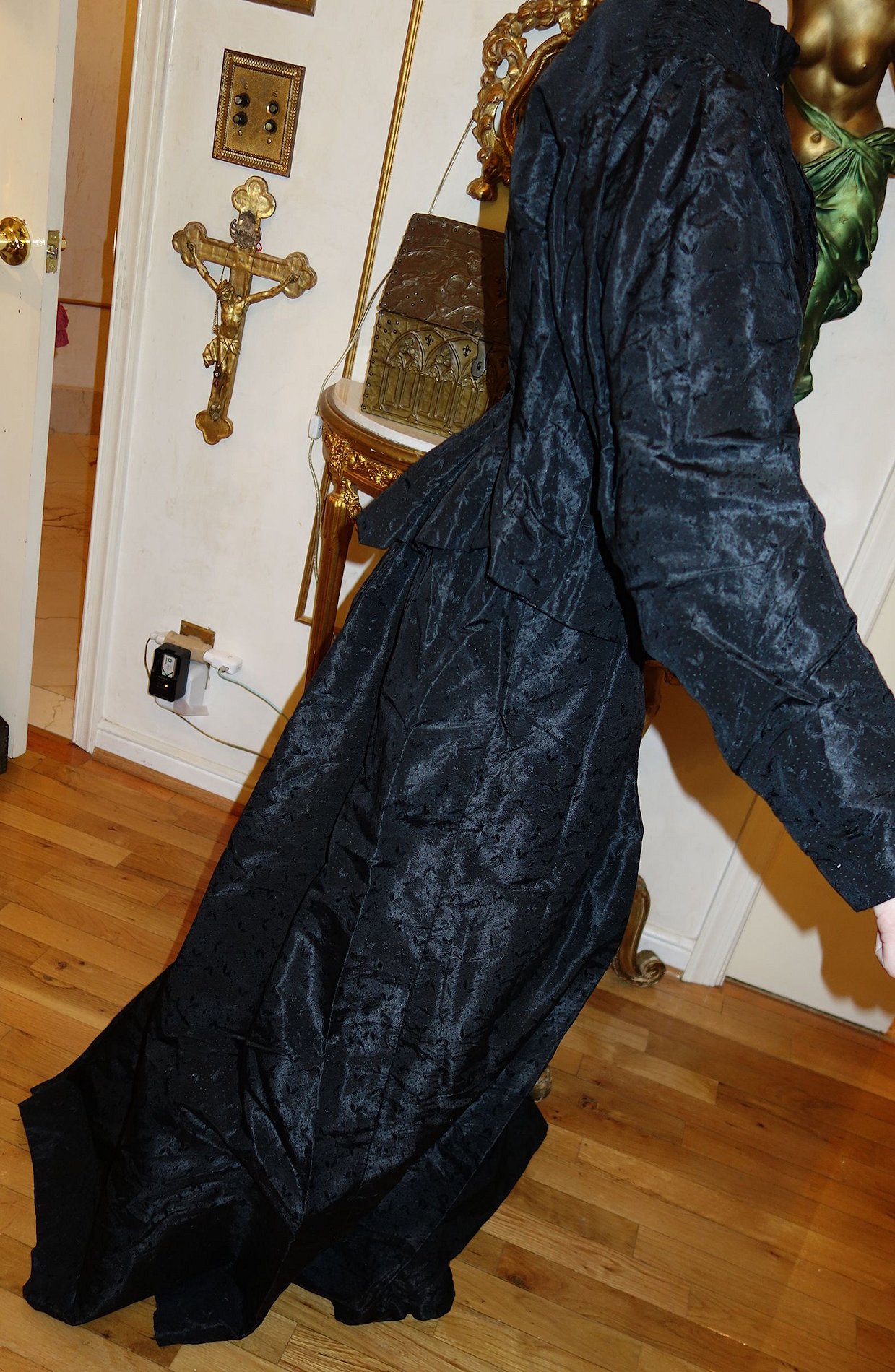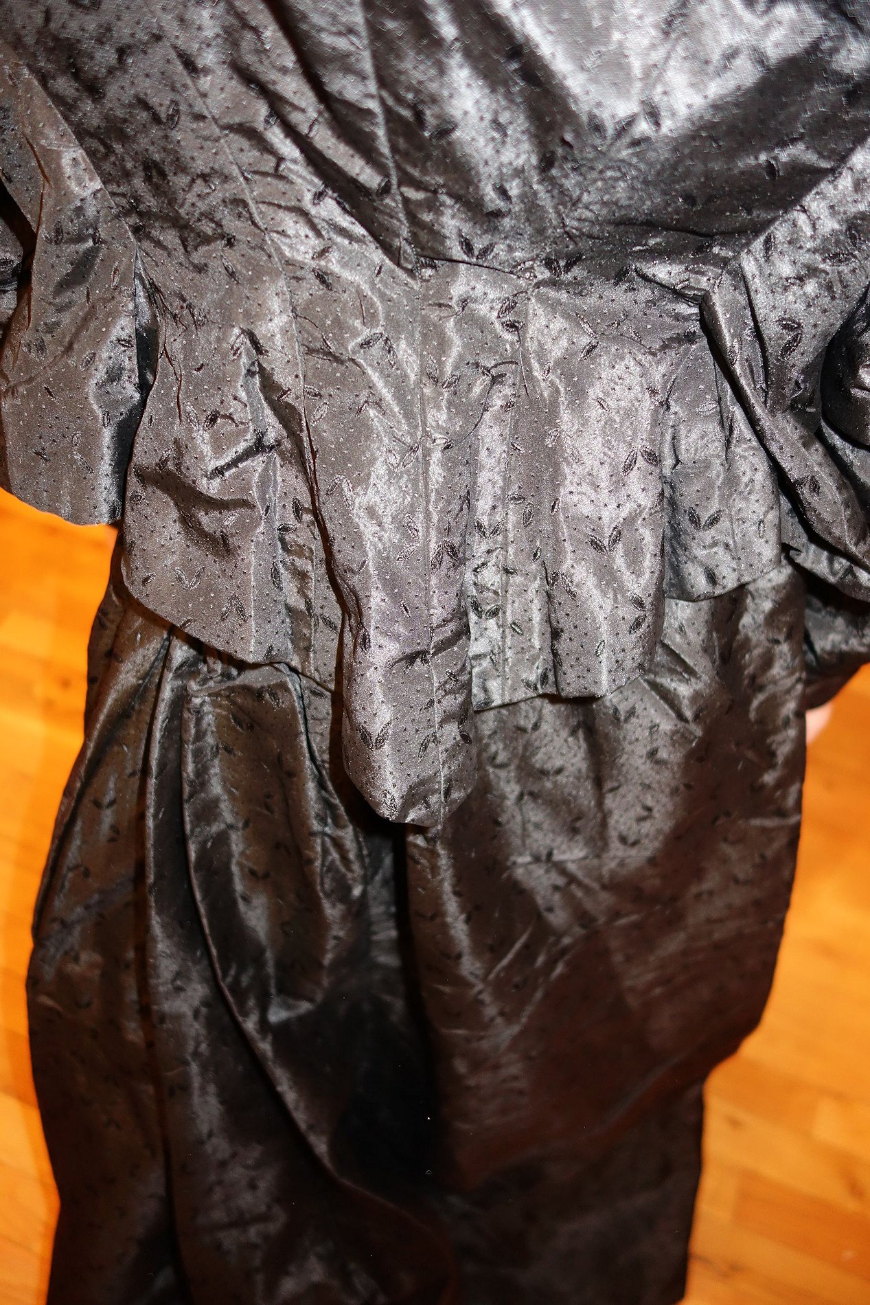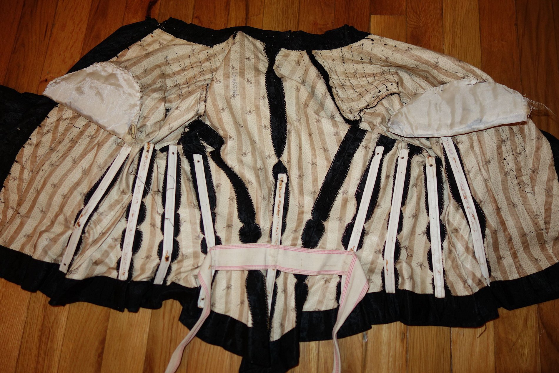 BlkAntique2pc.Dress/Outfit. Antique French Silk Skirt & Top Outfit 2 pcs. Lovely Black Silk French Skirt & Matching top circa late 1800's and directly from France. It comes in two pieces as shown having stays in the upper top area inside and a cretin in the skirt area only about half way as shown with soiled markings. The upper top has small holes due to age. If you are a collector of such -- you must wish to add this special piece to your collection. The upper top also has extra padding for the bust area as shown-- as many wore these back then. Selling as is due to holes in fabric and soils plus rusty areas on the interior top as well. Beautiful Gathering at shoulders as shown. Price: $275.