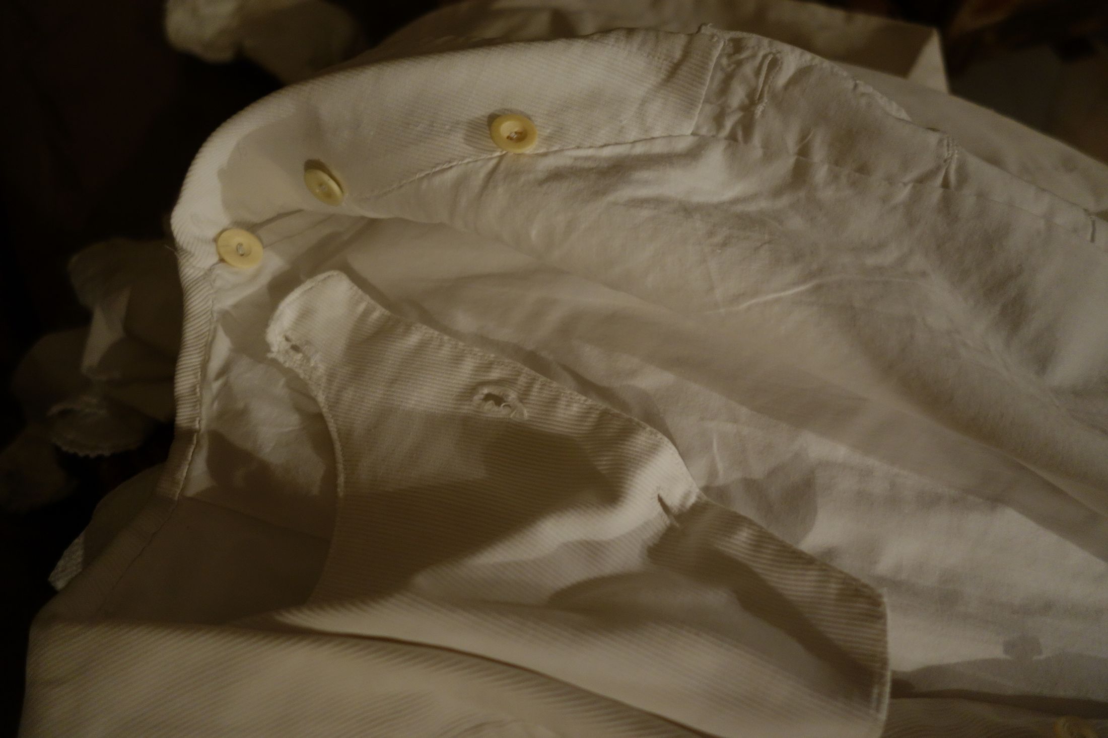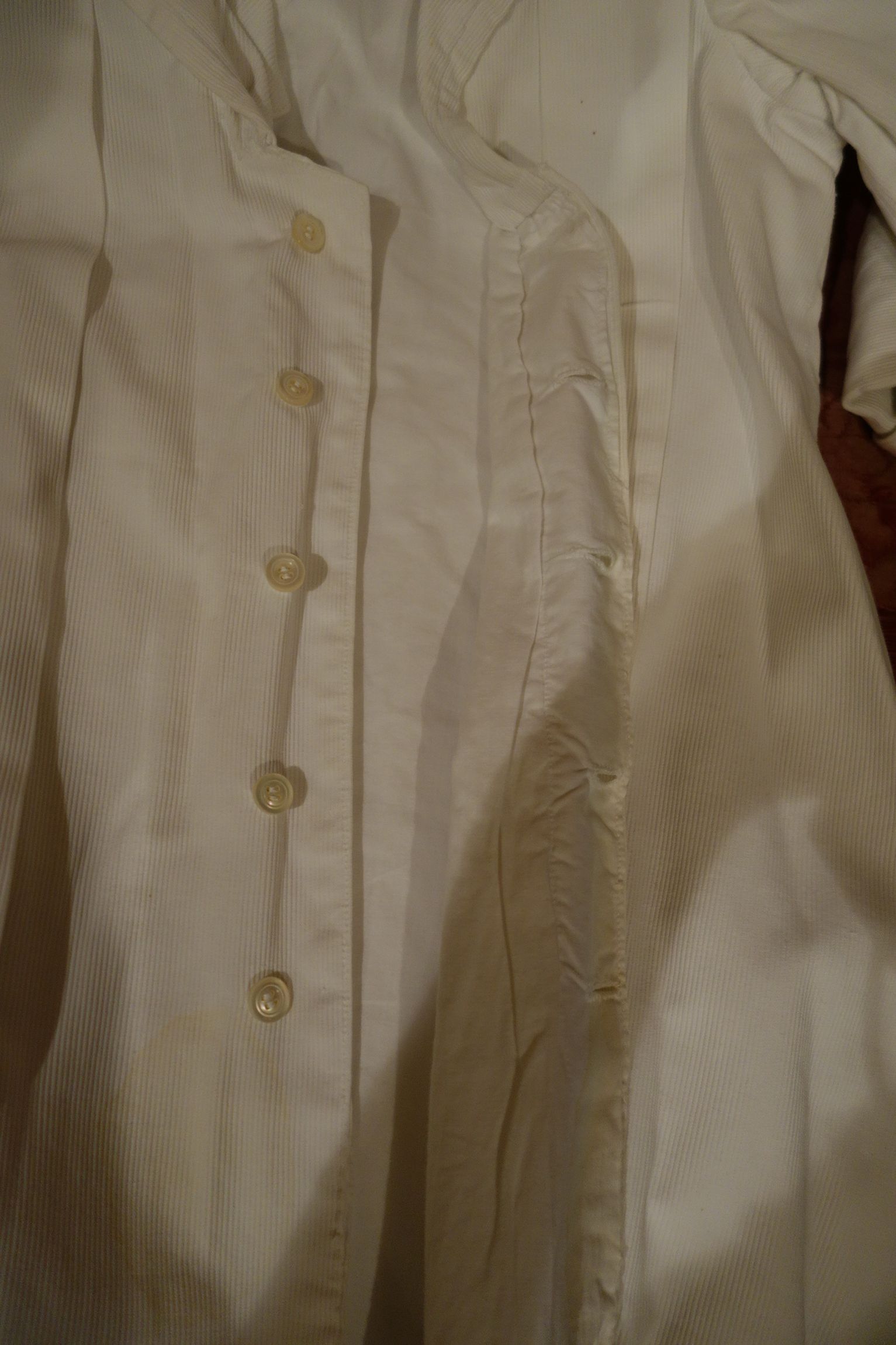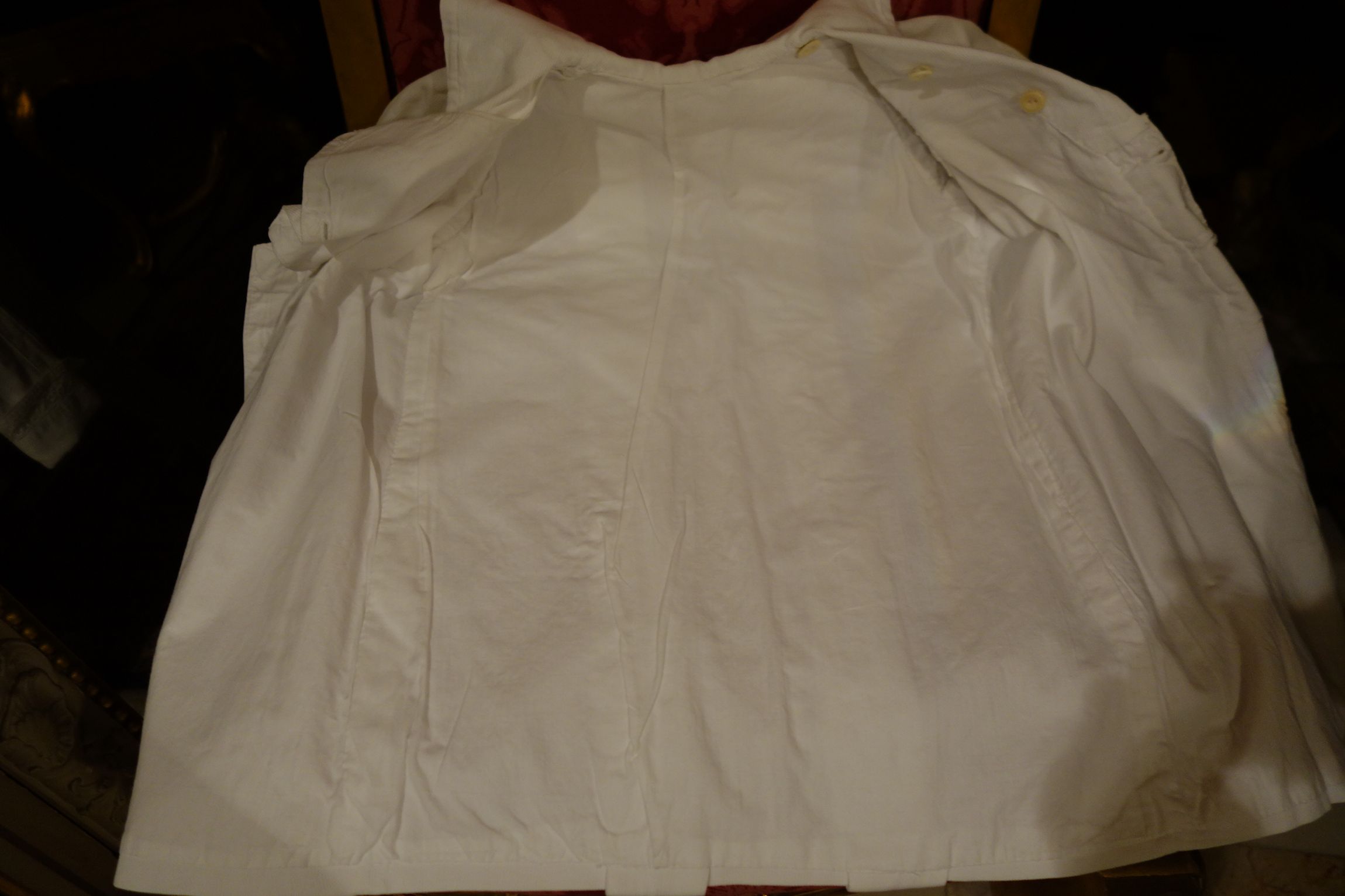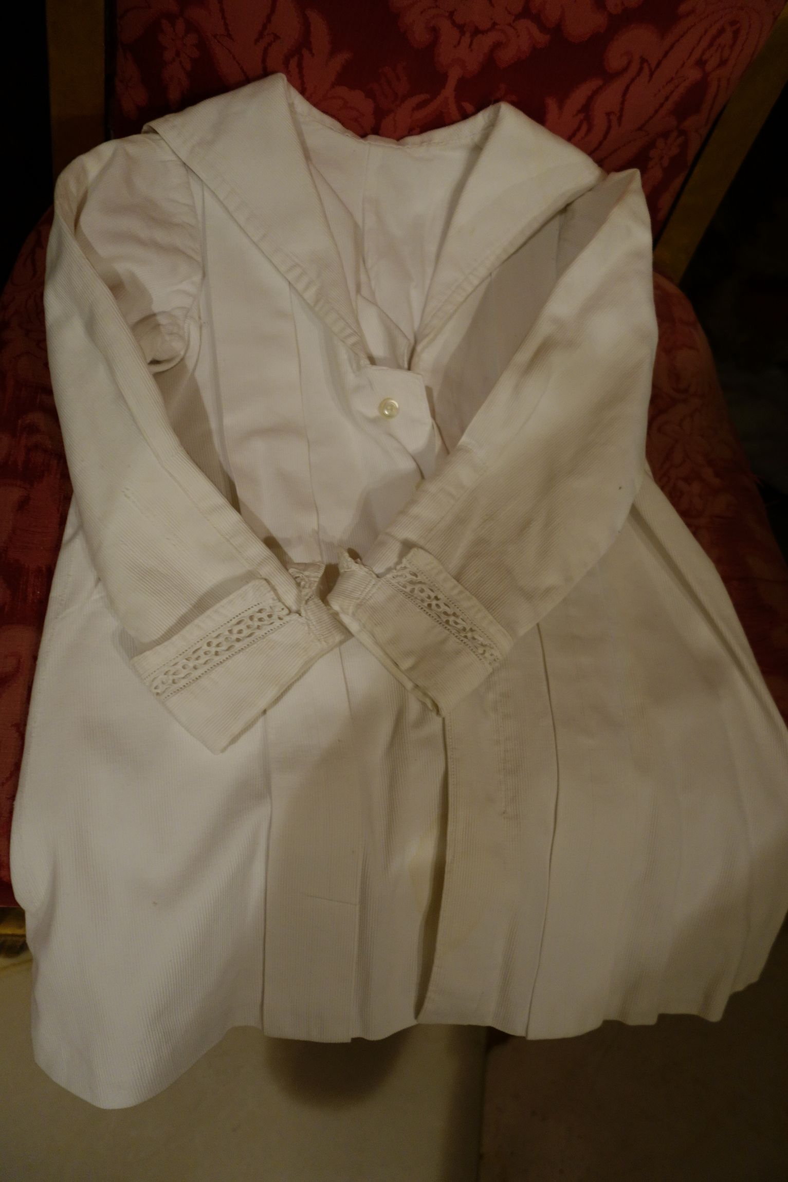 #ClothingChildsCoatWh. Precious Antique French Childs Coat or Dress made of thick cotton with longer sleeves & cuffed at the bottom. Beautiful well kept and ready to display or use for a Bisque Antique doll or treasure to your likings. A wider bib lays at the back of its smaller neckline near the front as shown in photos and the front having buttons. Circa early part of the 1900's and brought back directly from France during one of my trips awhile ago. Truly a Darling little Precious Antique for anyone to treasure and admire or use on one of your antique dolls.