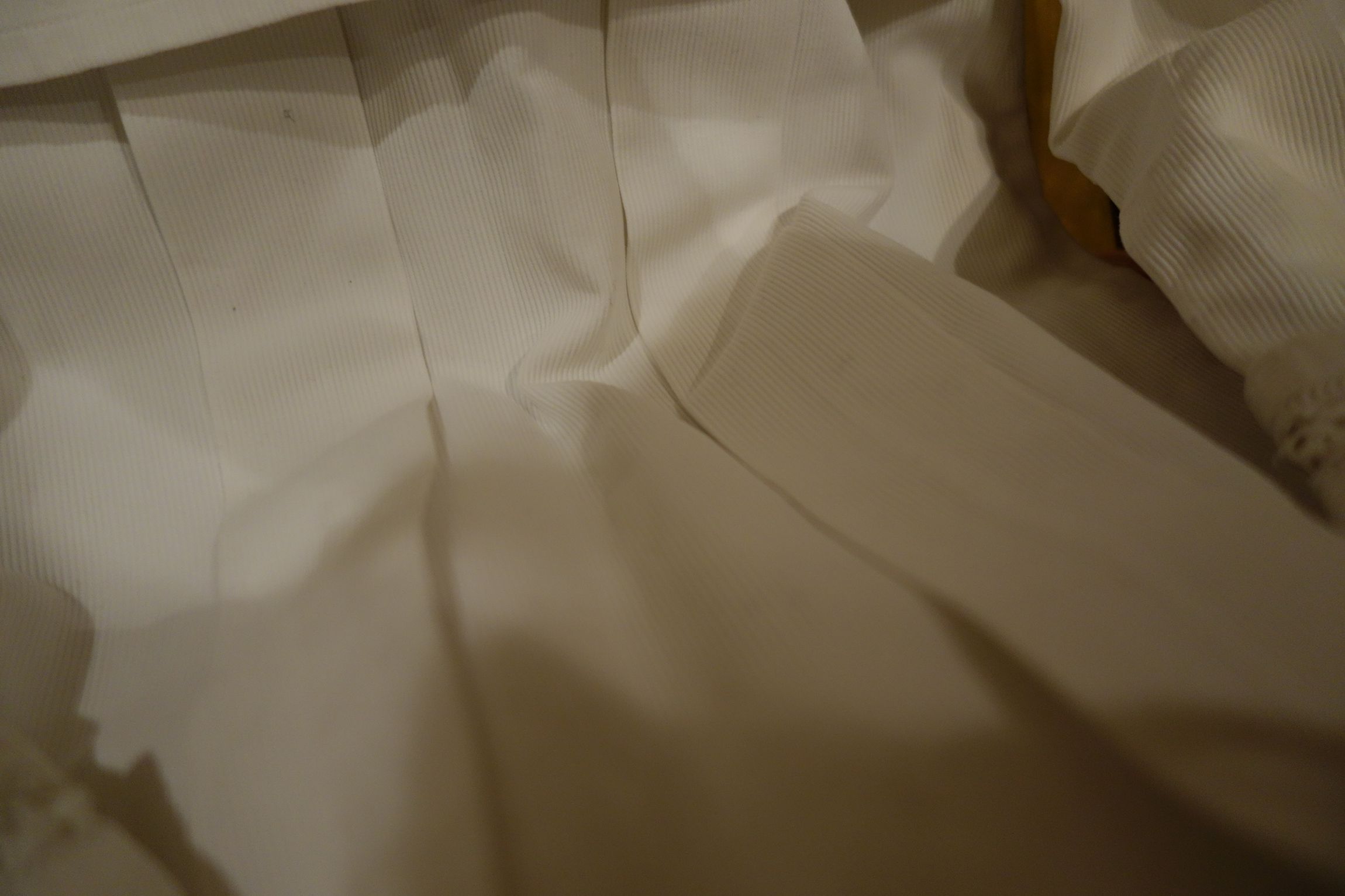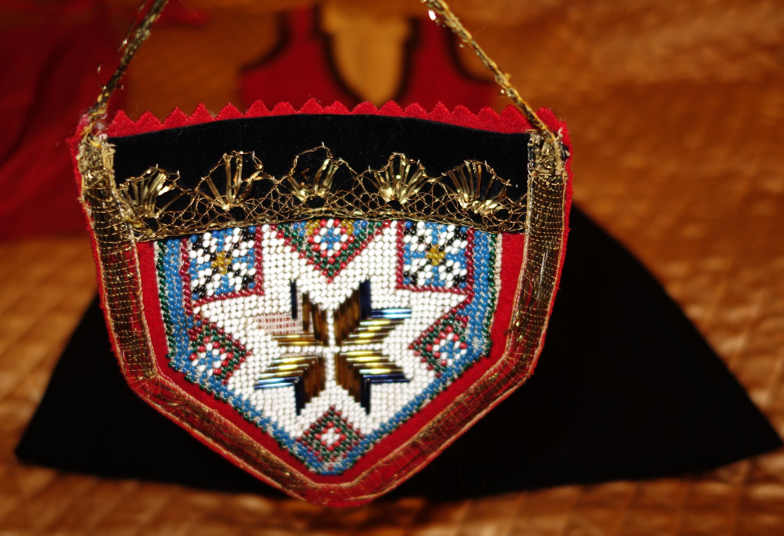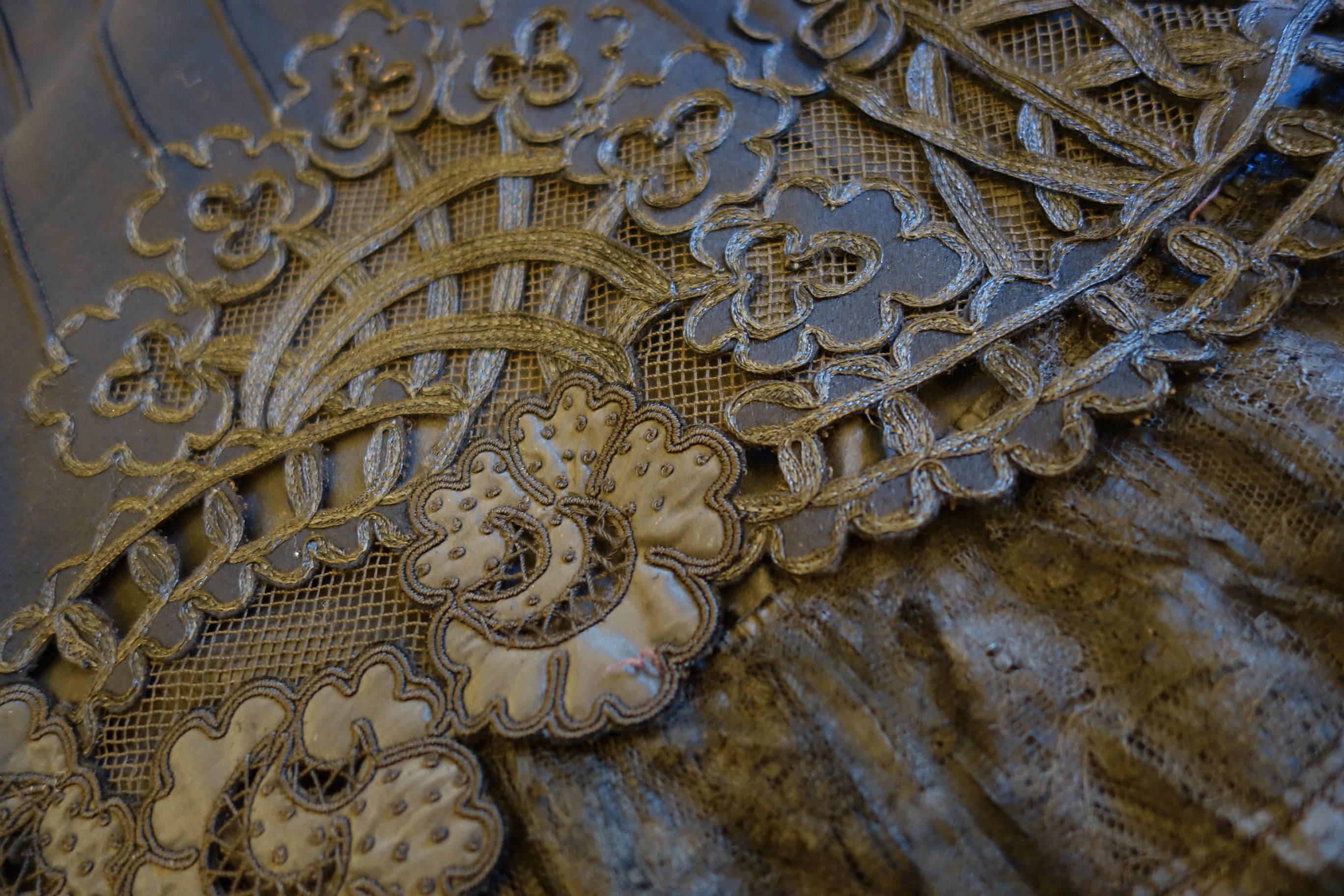 The center section is wool and remains in beautiful condition due to its age. Each section is stitched from upper to lower giving a fan like effect to the center area when wearing or displayed.