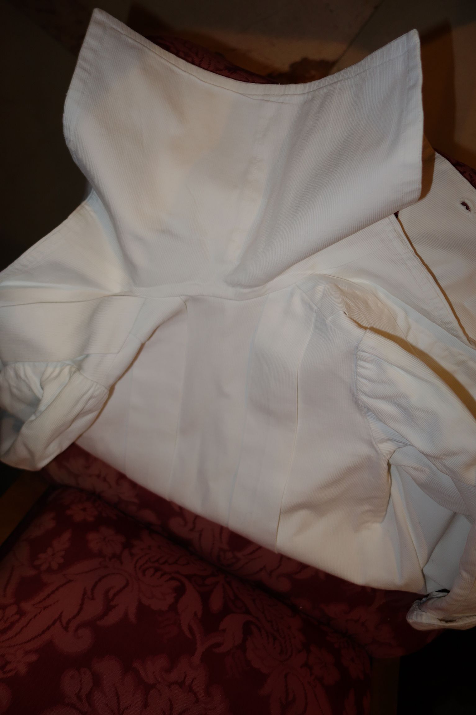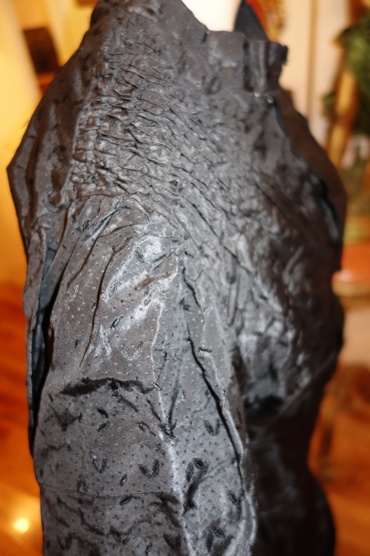 The Silk Taffeta interior section remains lovely other then the upper neck area having openings along neck & shoulder. It would need to be stitched along the neck area on the inside. The interior at lower has a gathered effect giving this added hand workmanship additional quality to this piece.
