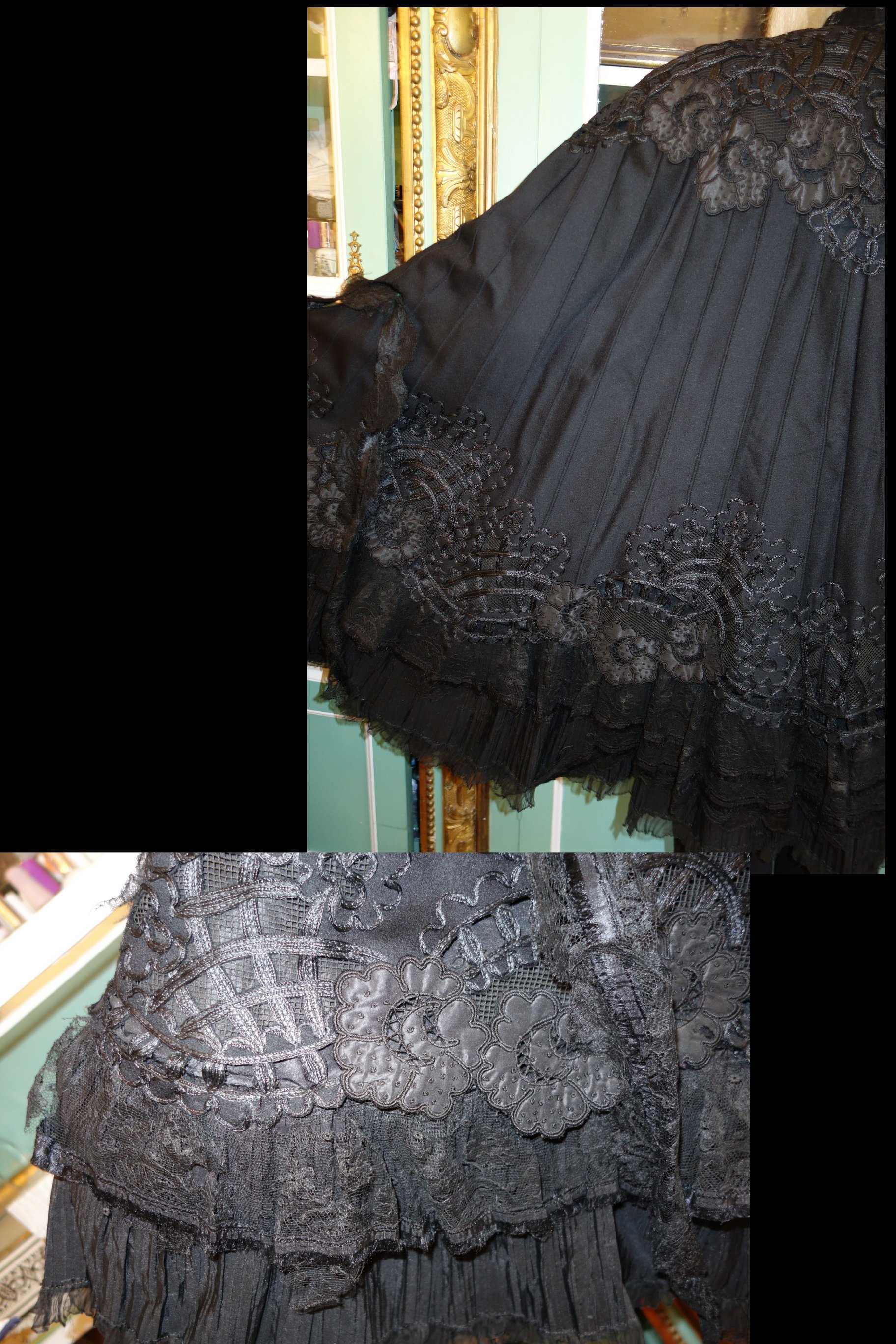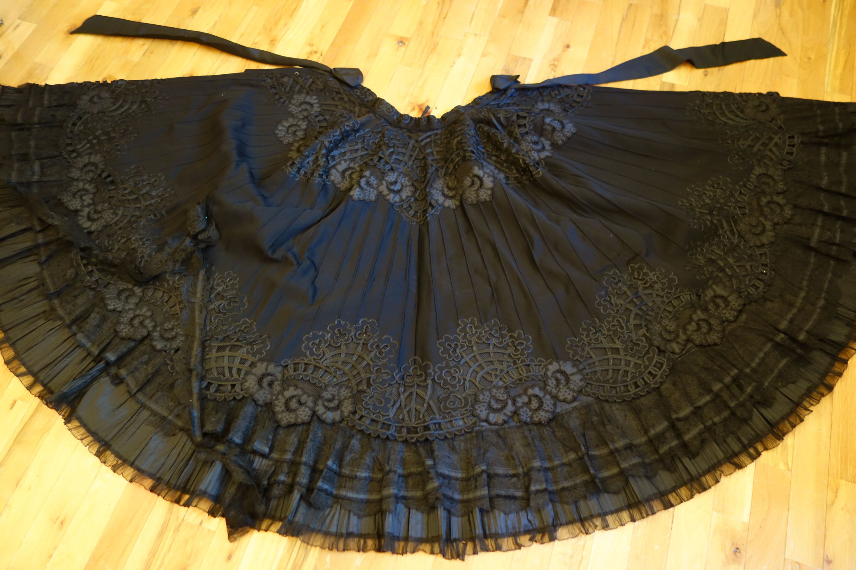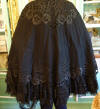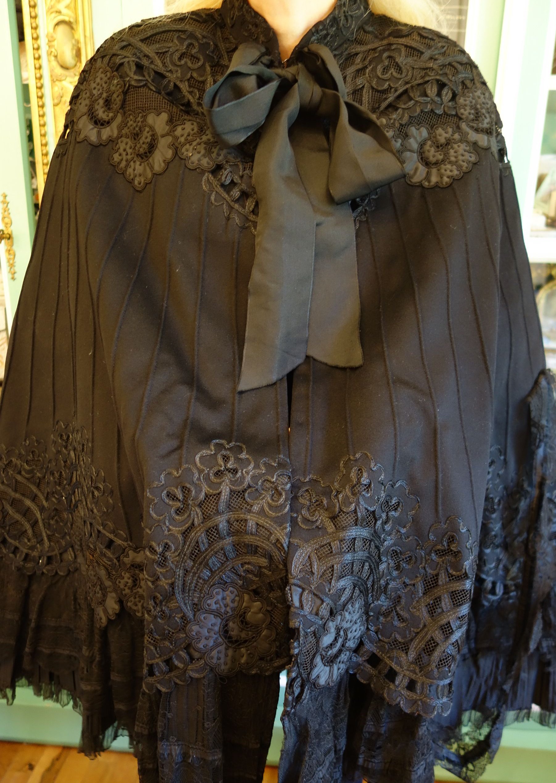 Clothing/BlkFr.Cape. Circa late 1800's Outstanding Antique French Cape which is adorned with stunning intricate lace and Crewel throughout. This French Antique Cape comes from Toulouse France and awaits a new owner to treasure, admire and perhaps to be worn on those special occasions or mounded as a piece of Art. At upper it closes with four hooks in addition to the silk ribbon for wrapping in bow like effect. At interior neck line area/shoulder are holes in this area-- a few in area where the hooks are also.