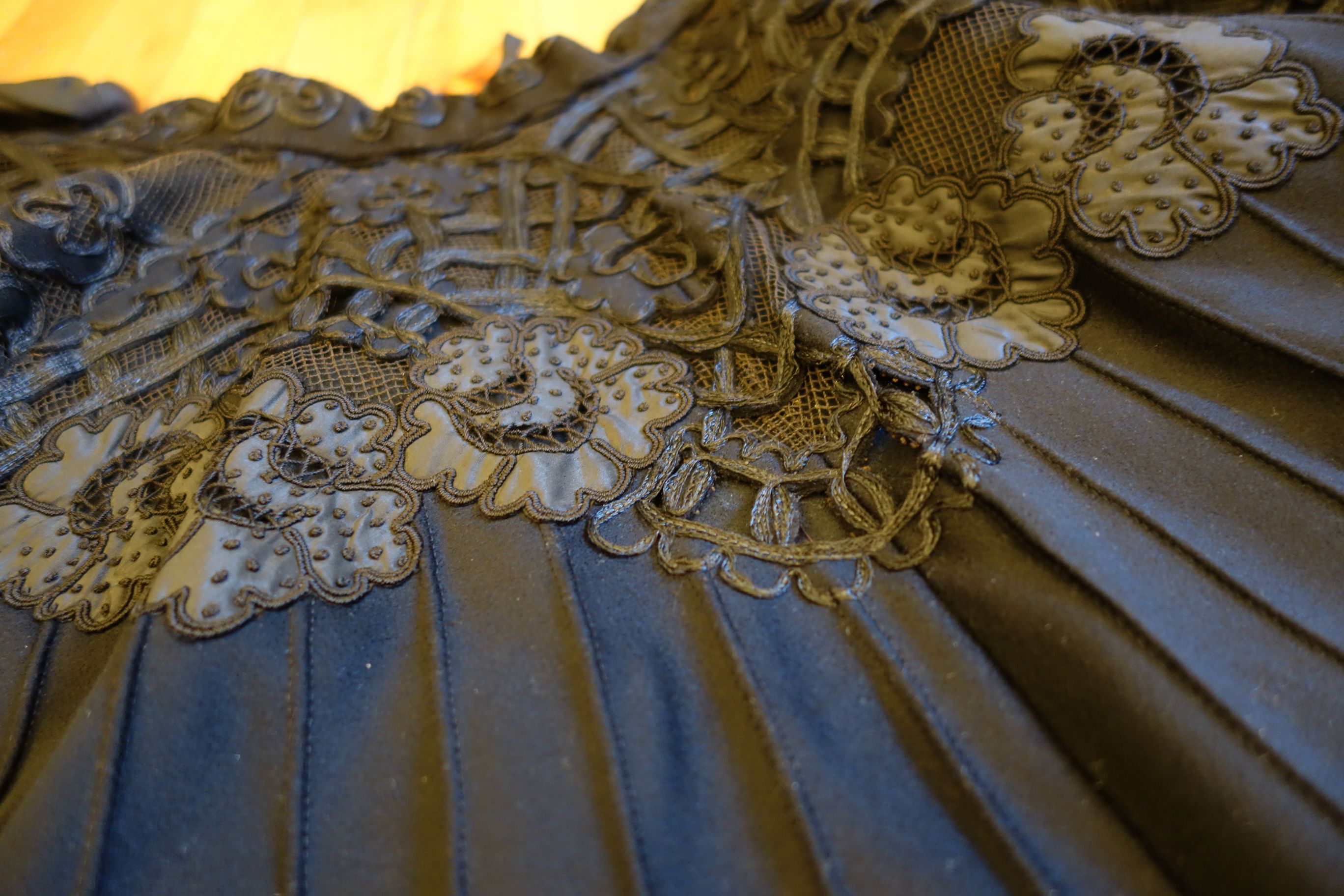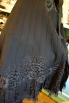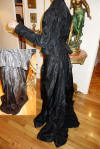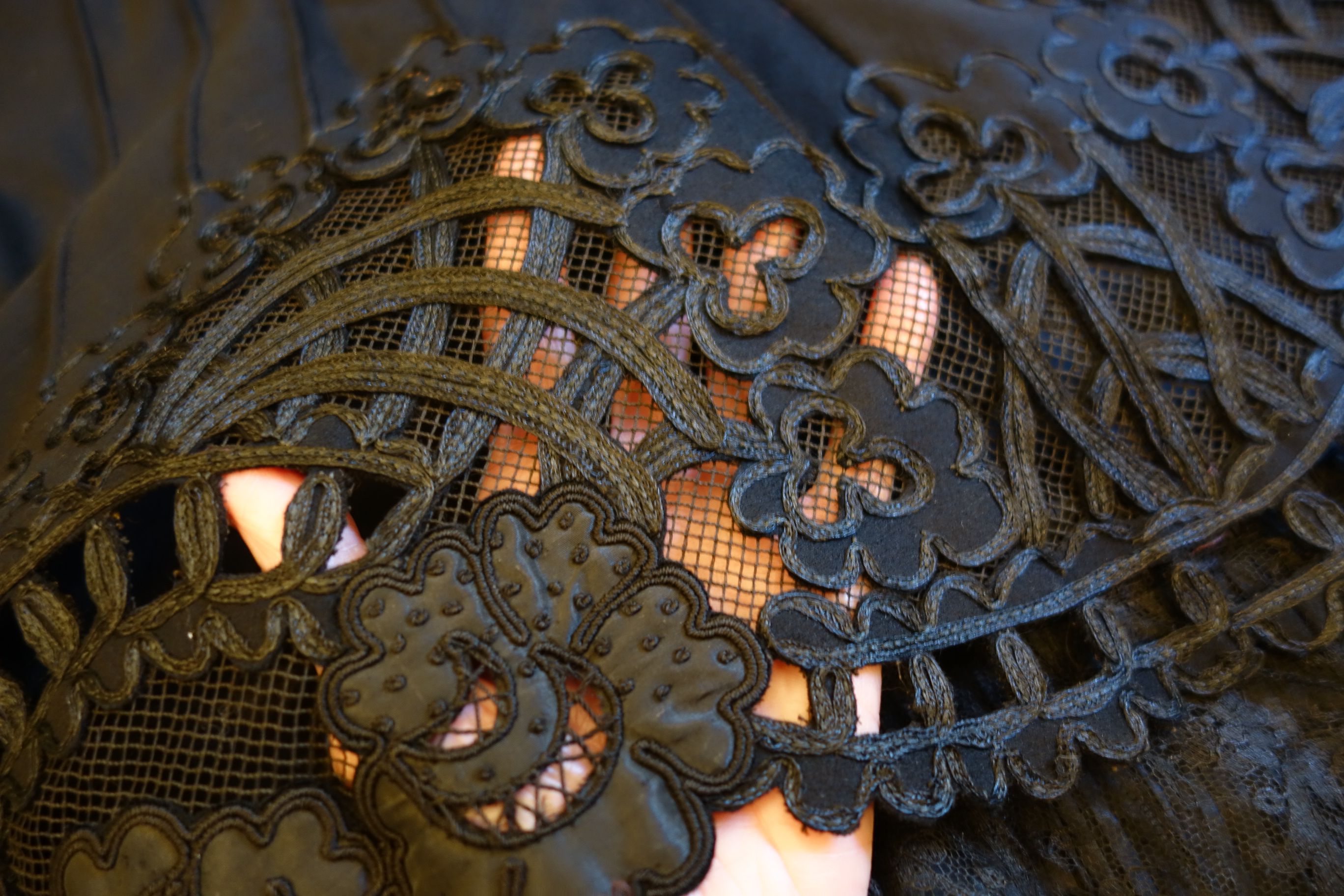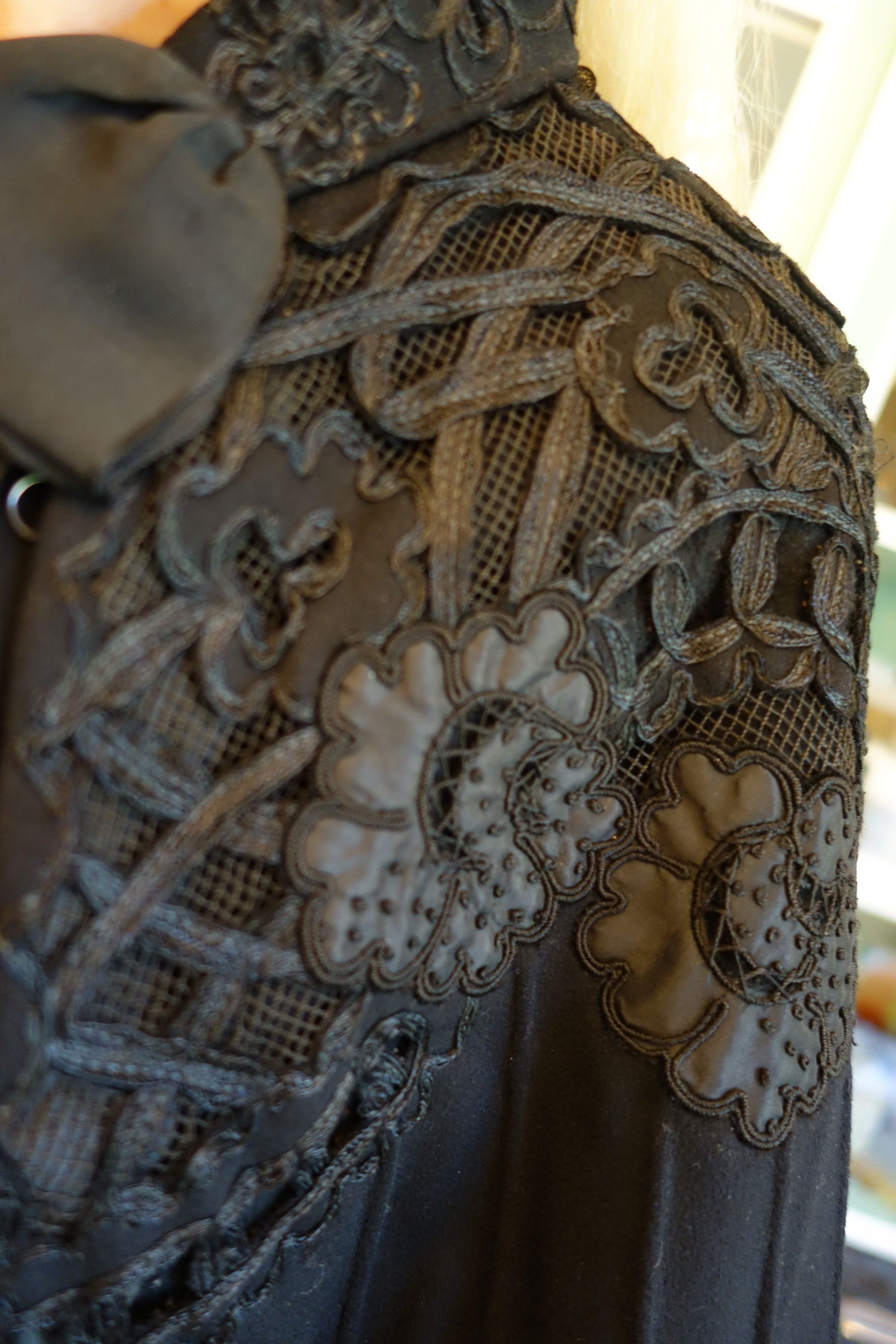 Clothing/BlkFr.Cape. Circa late 1800's Outstanding Antique French Cape which is adorned with stunning intricate lace and Crewel throughout. This French Antique Cape comes from Toulouse France and awaits a new owner to treasure, admire and perhaps to be worn on those special occasions or mounded as a piece of Art. At upper it closes with four hooks in addition to the silk ribbon for wrapping in bow like effect. At interior neck line area/shoulder are holes in this area-- a few in area where the hooks are also.