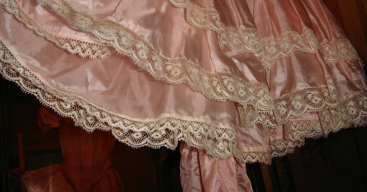 #Clothing/PkSilkChildsDress. . Exquisite Museum Quality --Childs Antique Silk & Lace Dress which came from a very affluent French family. The feel of the silk is unbelievable in addition to the workmanship & of made with the finest of quality. . The colour of the silk is a precious delicate pink and trimmed with the finest French antique lace. Circa 1880 and truly made for a little princess. You can also use this beauty for one of your favorite Antique dolls or have this framed and placed on one of your walls for a Exquisite Appearance and to be admired by all who enter your home. It does have issues due to age as it is brown in areas which I tried to show in many photos. Some being larger then others and due from age and storage. Please write me for questions as I am more then happy to answer them all. I also noticed one small tiny hole however all of these issues are minor to the uniqueness of this dress if you are a collector. It is truly a very fine piece of workmanship from the past and a fine treasure. The silk belt is removable and is long to accompany a nice size bow -- a tiny stitch keeps the belt attached to the dress. This stunning dress is made from the finest silk when touched and truly a treasure. Price: $425.00