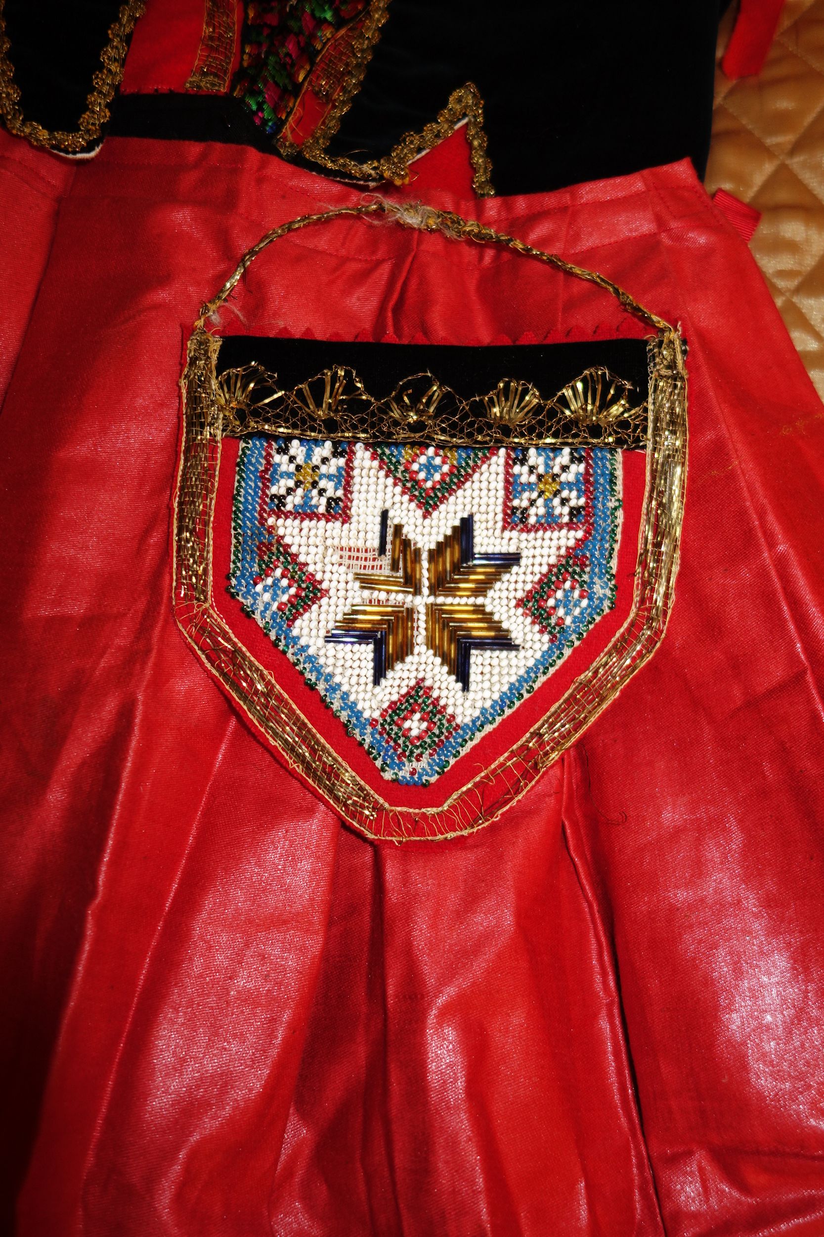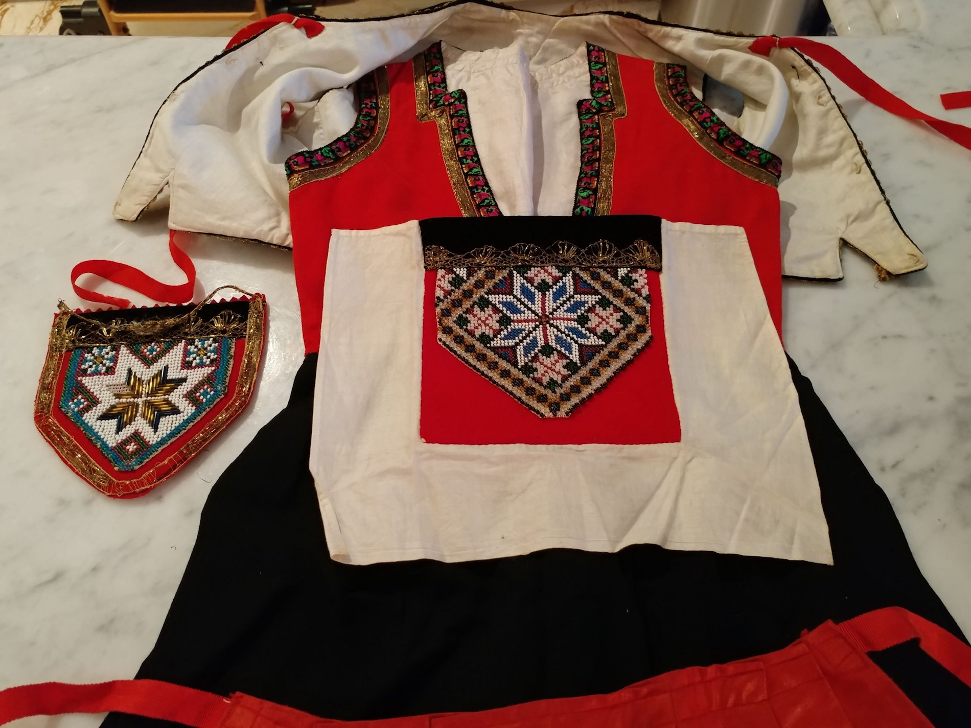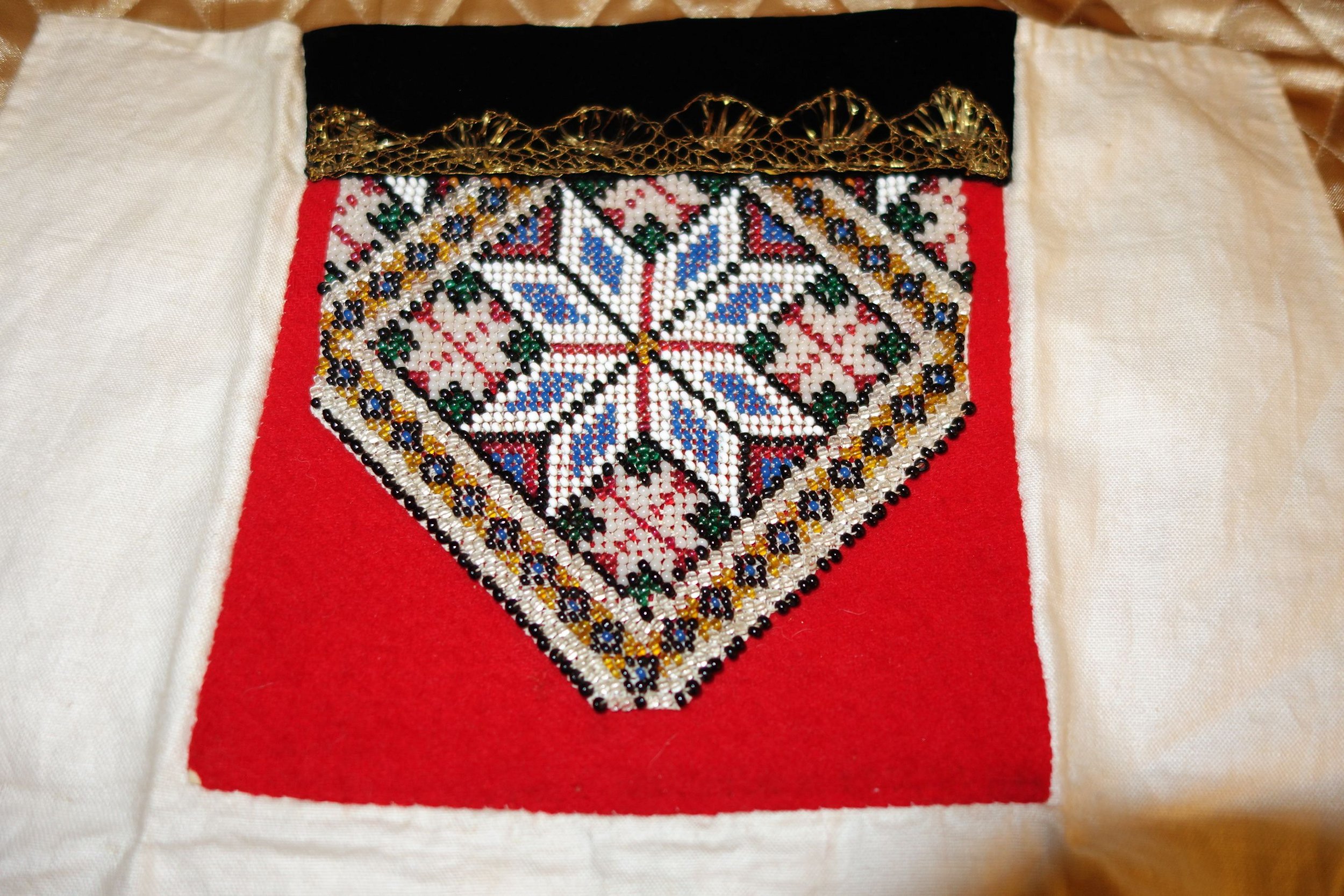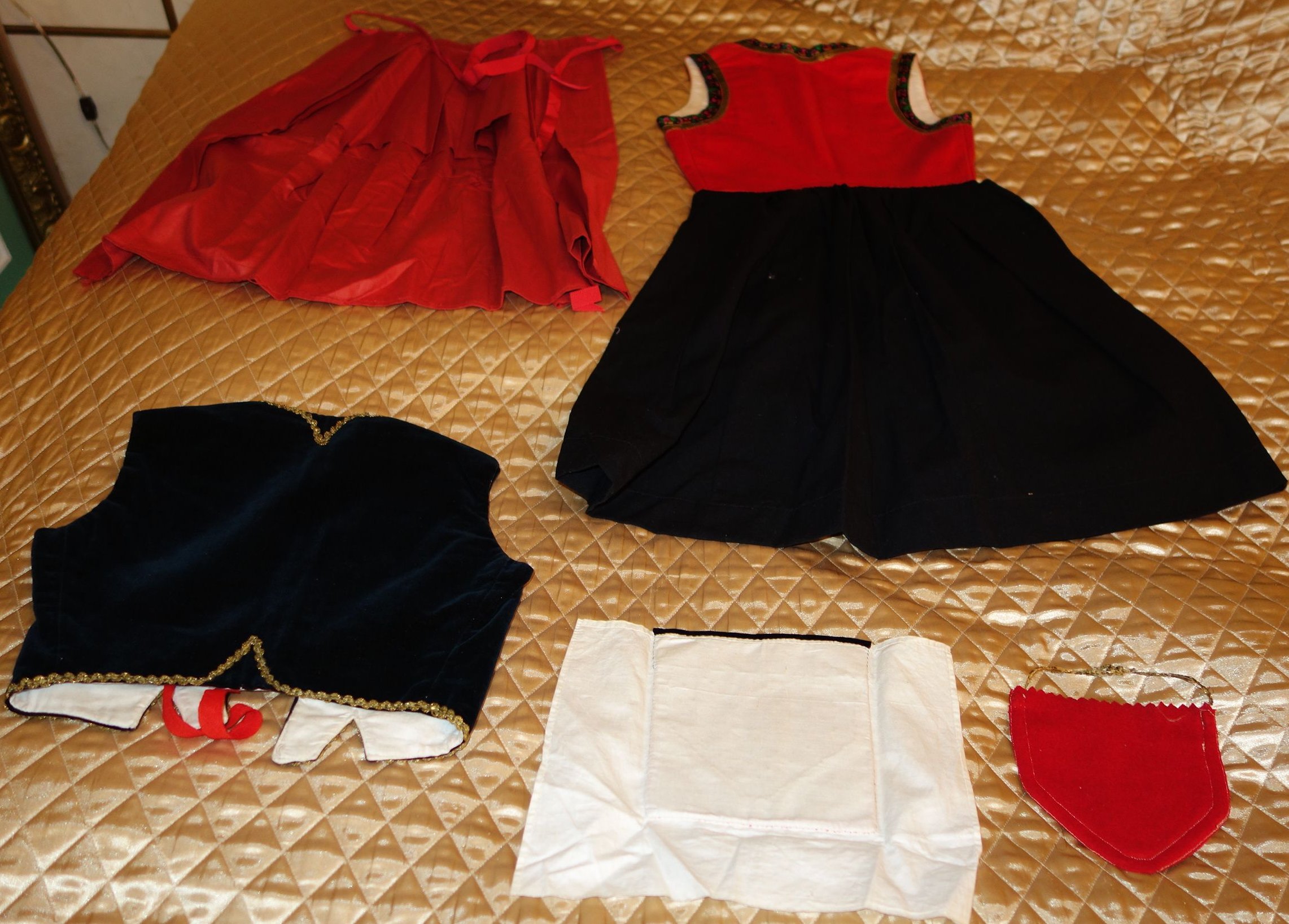 Apron: The apron is removable with wonderful long ribbon for ties and made out of a wonderful feel in coated like cotton. On the hem of the apron at ends at base some of the stitching was never stitched. Purse: The hand made beaded and gold bouillon purse opens and has a oval stamping inside with the name Martha Hagen. On the purse some hand beading never was finished in the center. (very small area) The purse also having gold bullion for its handle along with some surrounding the purse. Vest: The vest is made of rich velvet and lined having gold buillon surroundings. Dress: The dress is Worsted Wool and surrounded at upper with wonderful trimmings. There are minor stains on the interior lining as shown however, it remains a quality made and detailed dress during the making. Bib/extra piece: The extra beaded piece which remains on the white cloth as shown --again I am not sure exactly what this is for.