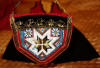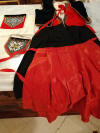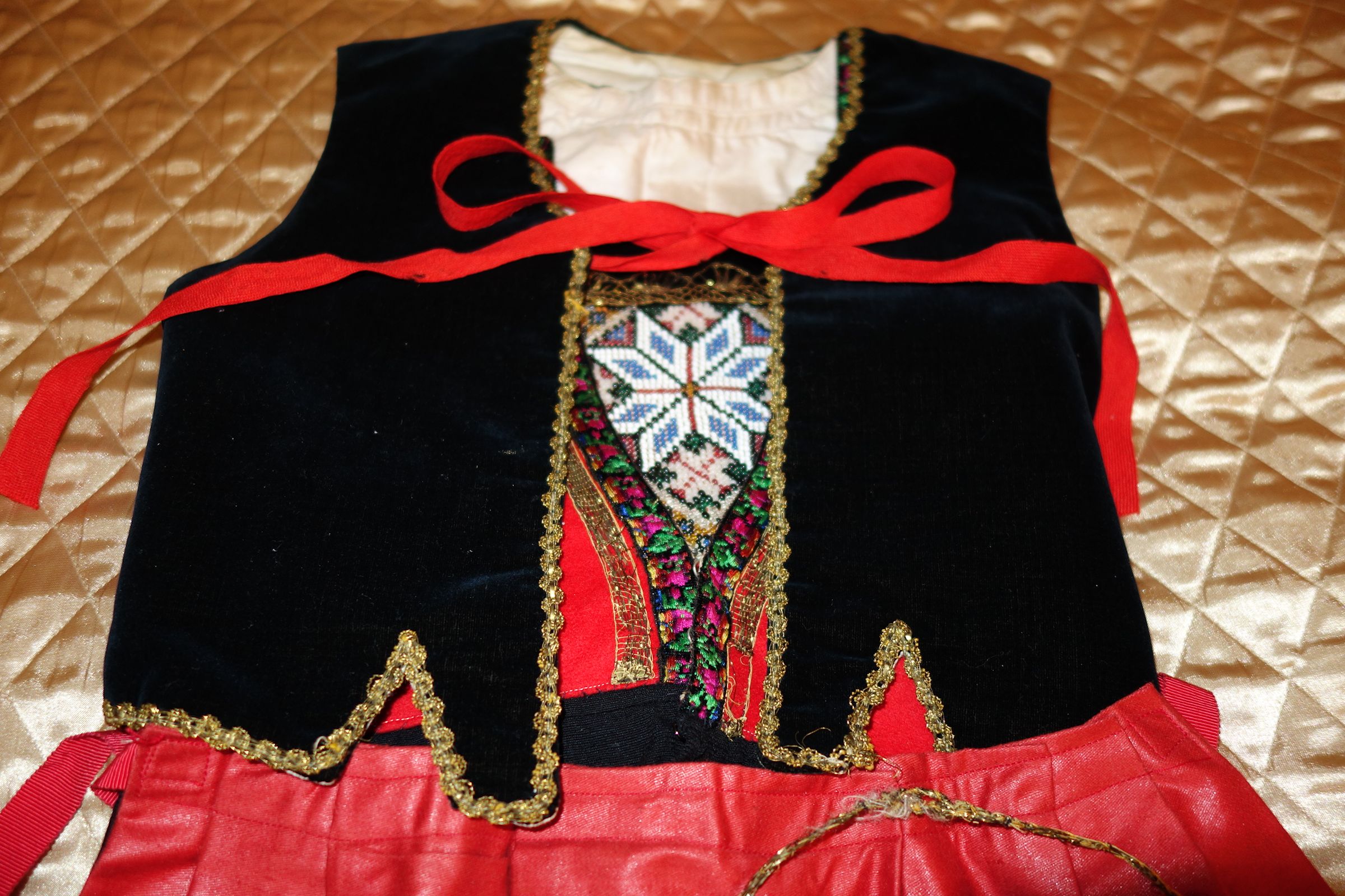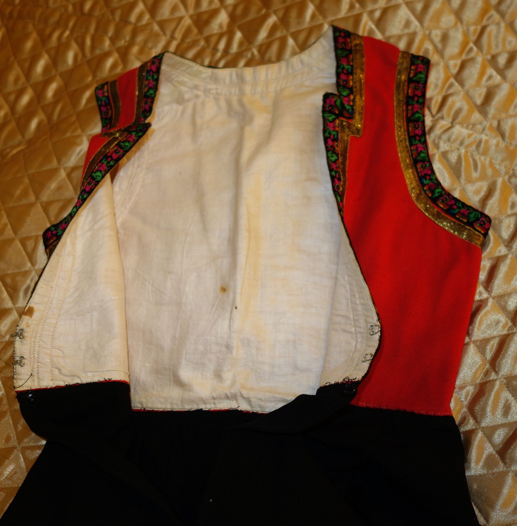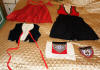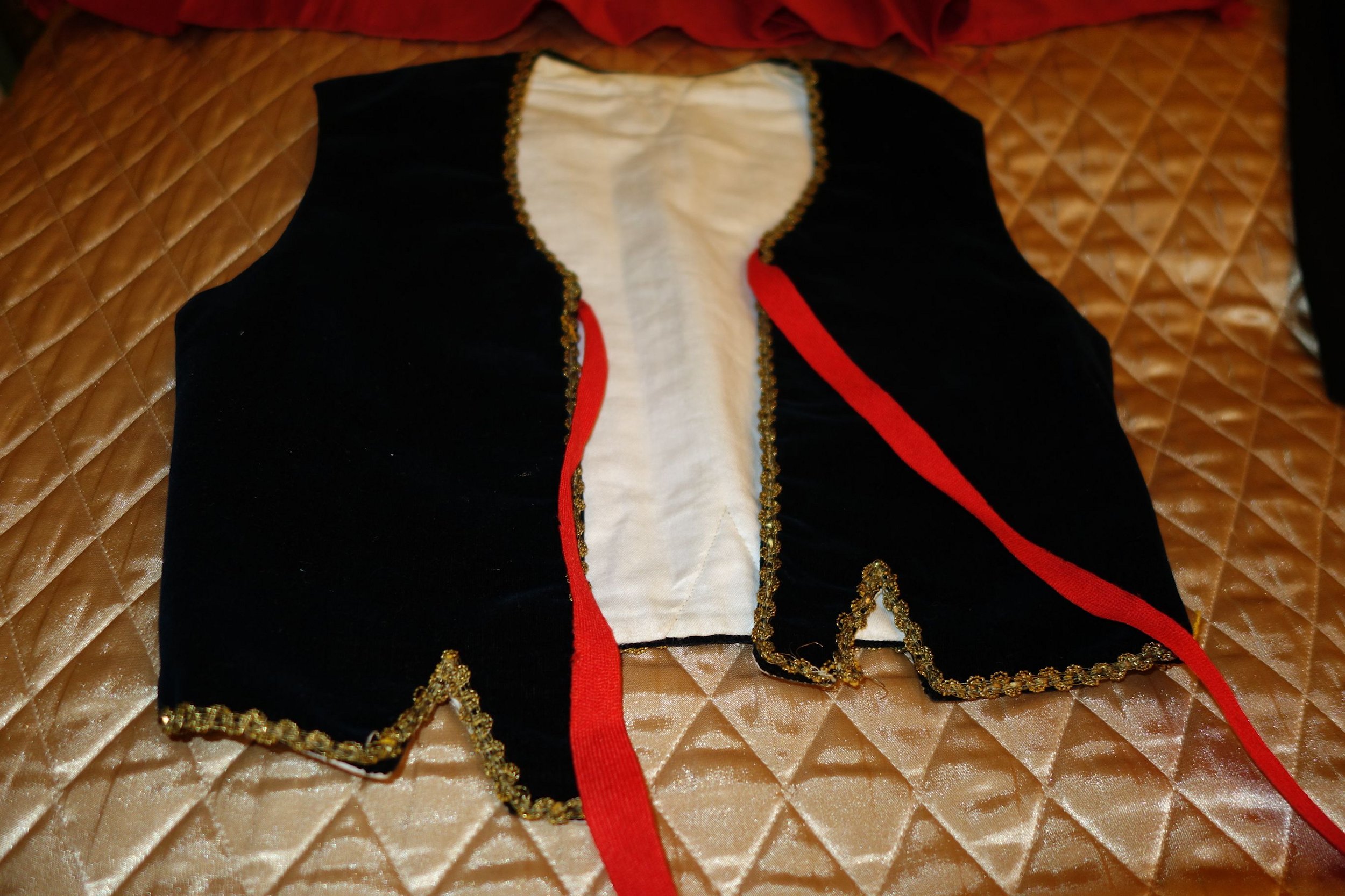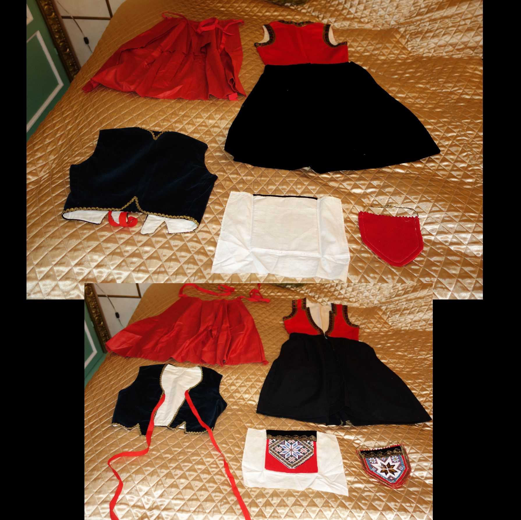 Apron: The apron is removable with wonderful long ribbon for ties and made out of a wonderful feel in coated like cotton. On the hem of the apron at ends at base some of the stitching was never stitched. Purse: The hand made beaded and gold bouillon purse opens and has a oval stamping inside with the name Martha Hagen. On the purse some hand beading never was finished in the center. (very small area) The purse also having gold bullion for its handle along with some surrounding the purse. Vest: The vest is made of rich velvet and lined having gold buillon surroundings. Dress: The dress is Worsted Wool and surrounded at upper with wonderful trimmings. There are minor stains on the interior lining as shown however, it remains a quality made and detailed dress during the making. Bib/extra piece: The extra beaded piece which remains on the white cloth as shown --again I am not sure exactly what this is for.