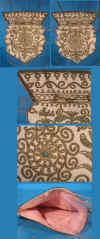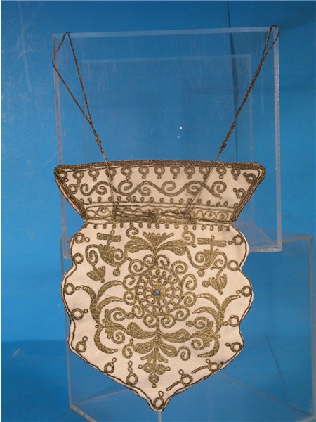 5. Truly quality in this hand made couched French handbag purse. Hand stitched and circa around 1880 having center motif of turquoise round stone then surrounded by hand stitched gold threads on cream wool fabric. Interior having gorgeous color of pink silk lining. Truly something to show off during your evening social events. A nice treasure harder to find. This would also be wonderful if one were to frame it and add to your walls.. or perhaps frame it and add to your favorite display tables.. The hand made workmanship is wonderful to admire. Price: