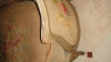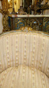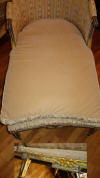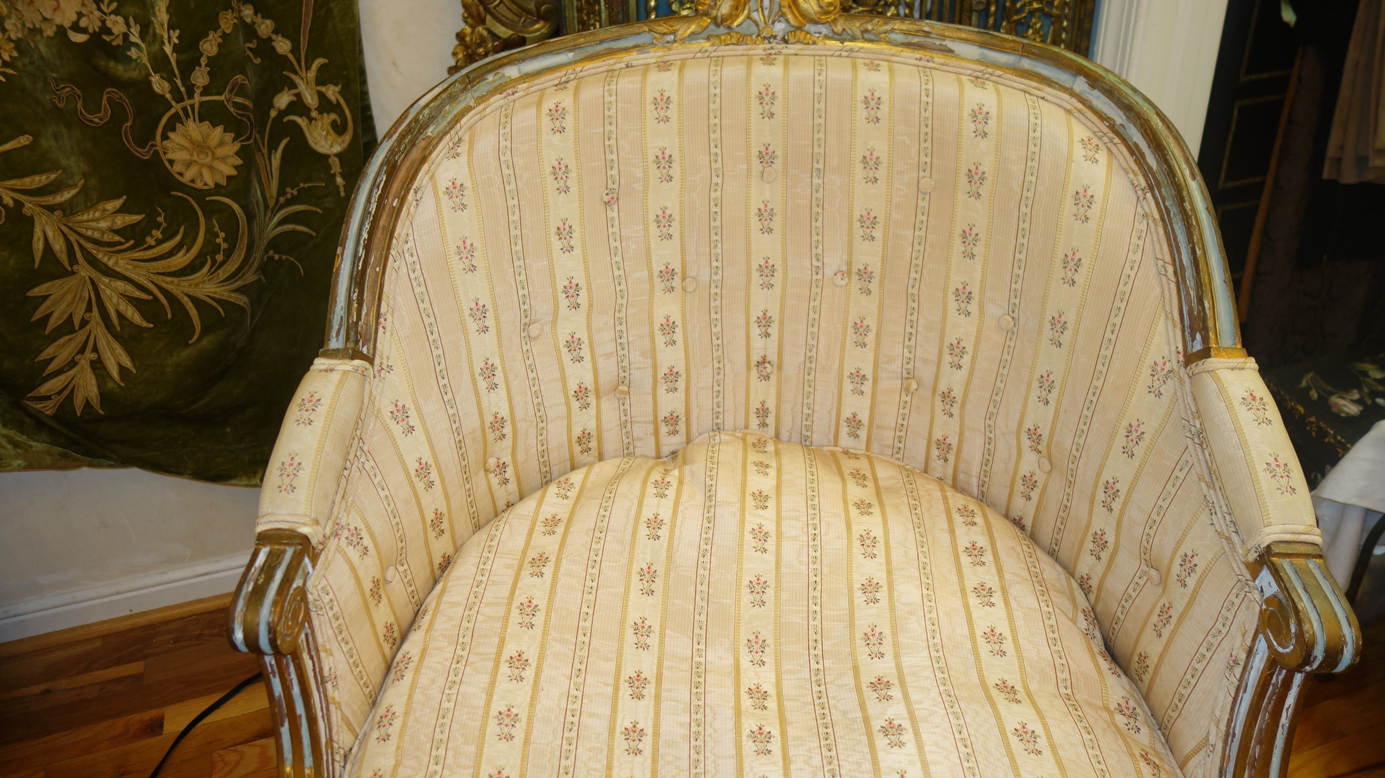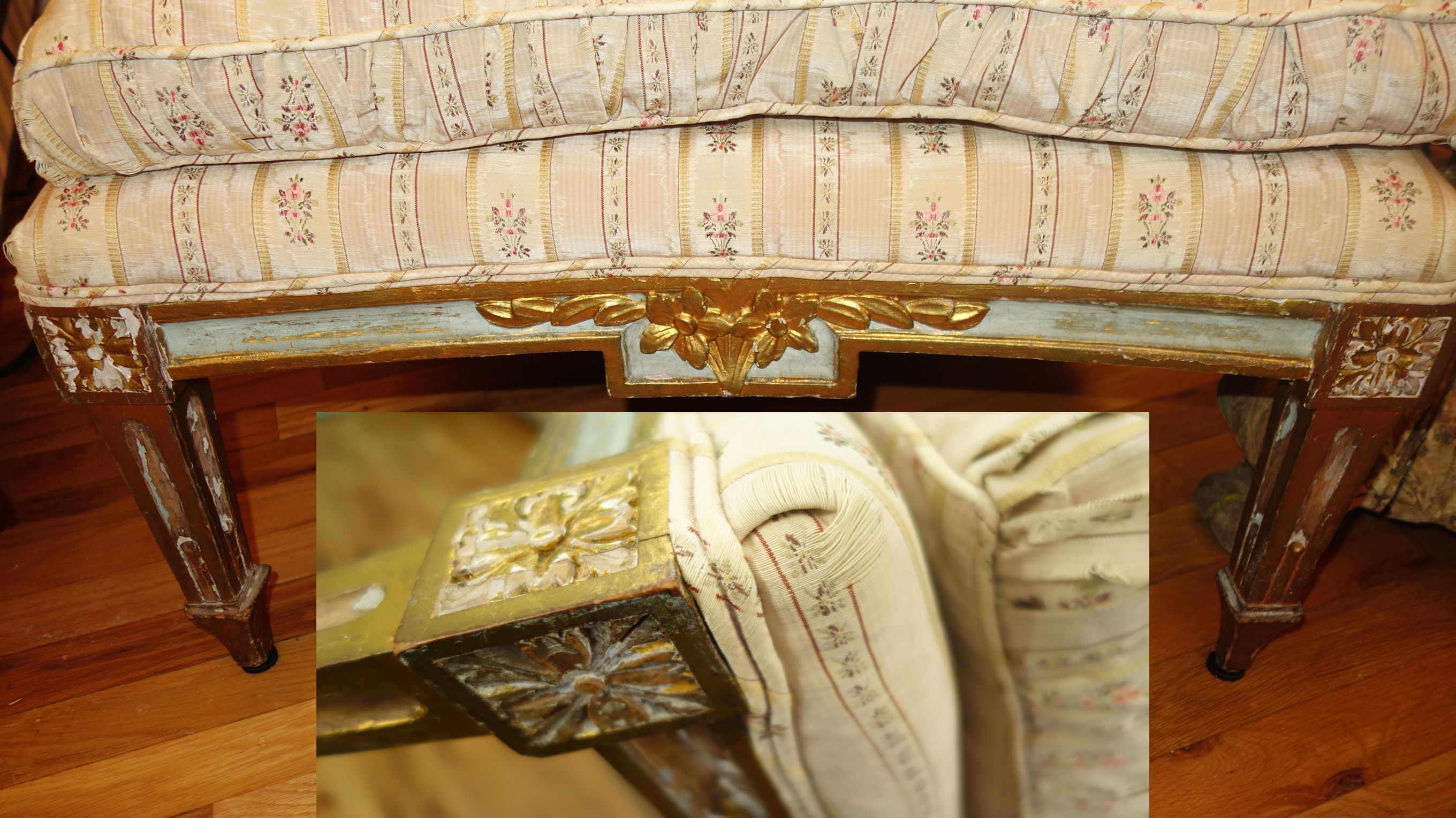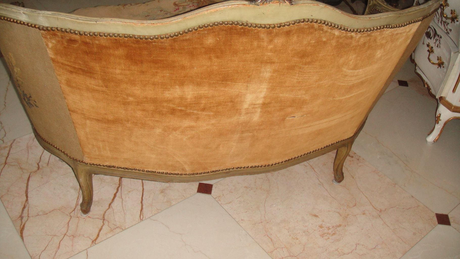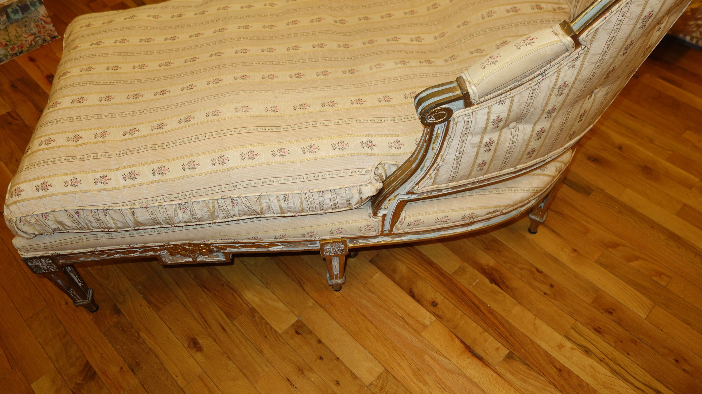 Faintingsofa. Outstanding Antique French Fainting sofa chaise couch lounge. Gorgeous in appearance and carved throughout with curved back for added beauty and attention to detail in addition to each leg having carvings in a lovely classic manner. Recently upholstered in antique French Silk Fabric which were once drapes and hung in a Chateau in France. The cushion is reversible with mohair/cotton on the opposite side which is new fabric in the color of light gold. The Antique Silk fabric circa late 1800's early 1900 having gathering surroundings and due to age having frayed surrounding the gathered areas and corners however does not effect the beauty and quality of this piece. Each arm is individual upholstered and remains lovely and the back side & the interior having the charm of age water markings in the Antique silk fabric and blends beautiful with the entire piece thus gives much charm. The removable cushion is the original as found and bought. The wood having a washed like appearance in different colors. If you prefer you could easily change its color. Beneath the chaise if you look carefully you will notice webbing and then the black cloth for protection of dust. I have foot pads on each leg and can be removed or they fall of easily being small felt ones. The silk Antique French fabric blends with just about anything and the pillow and surroundings do not come with this piece. The back I had button tufted for added beauty when shown from the backside. I had a zipper added for the removable cushion as well and welting surroundings as shown. This is a Gorgeous piece for comfort and appearance for any room. The paint is believed to be the original and well worn and faded through the long years and giving it a charming washed appearance. This is truly a harder to find piece anywhere and sure to adorn any room with added richness and comfort.