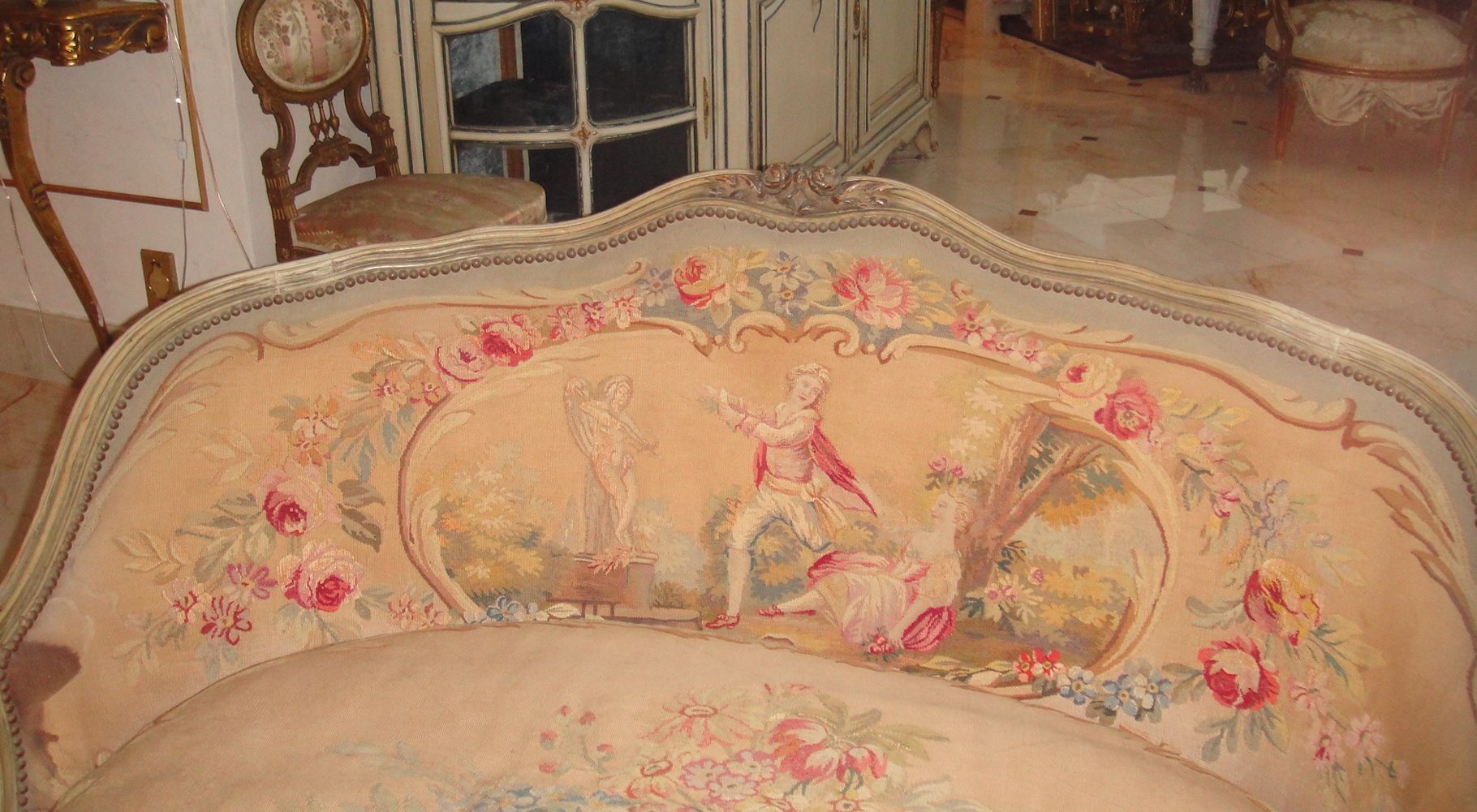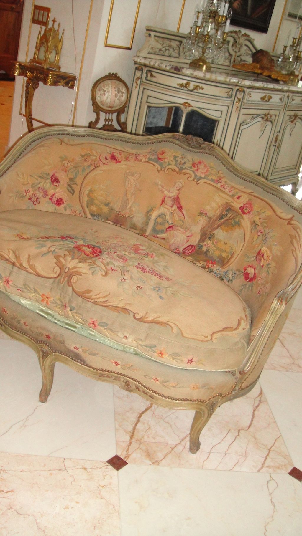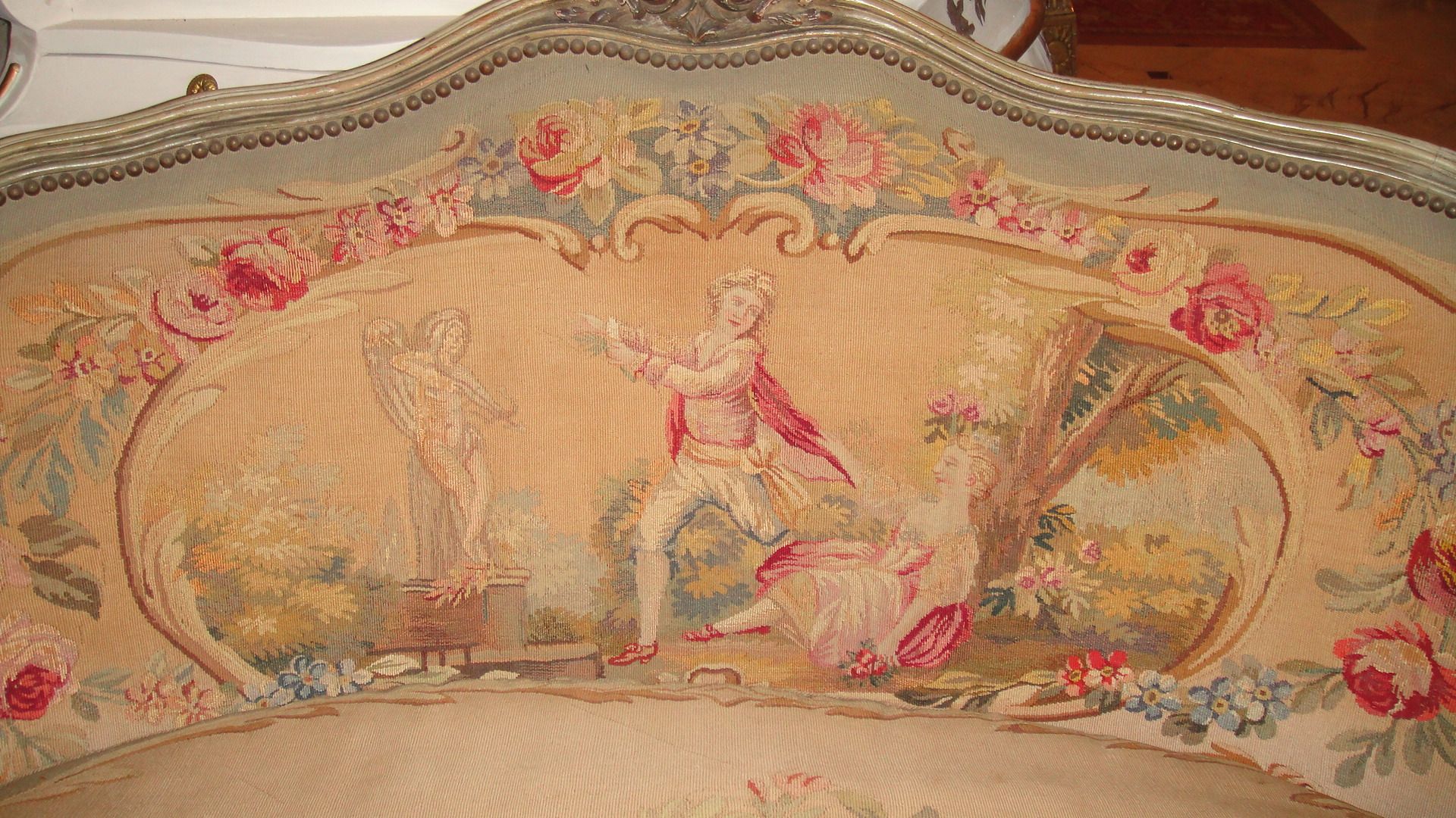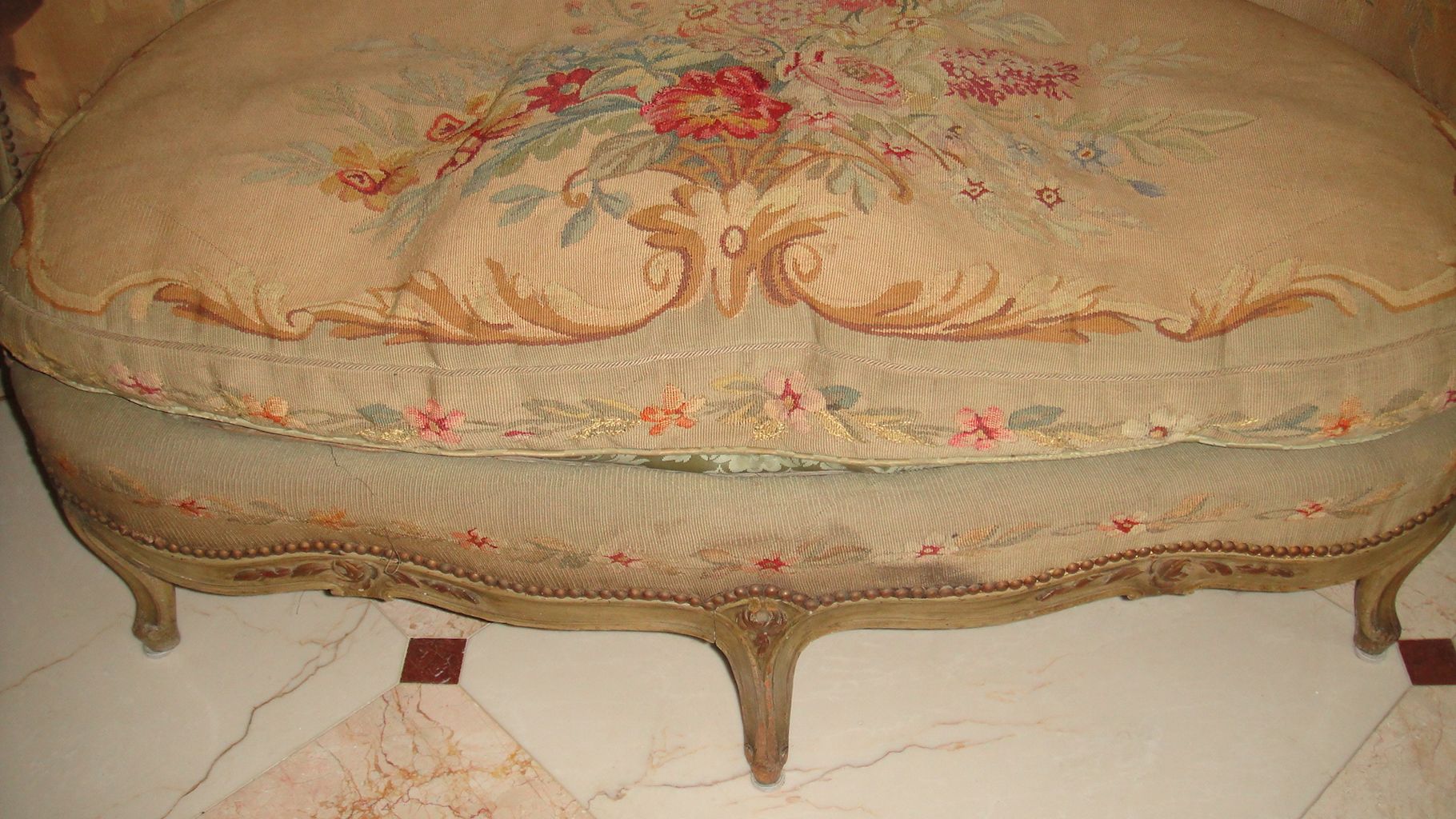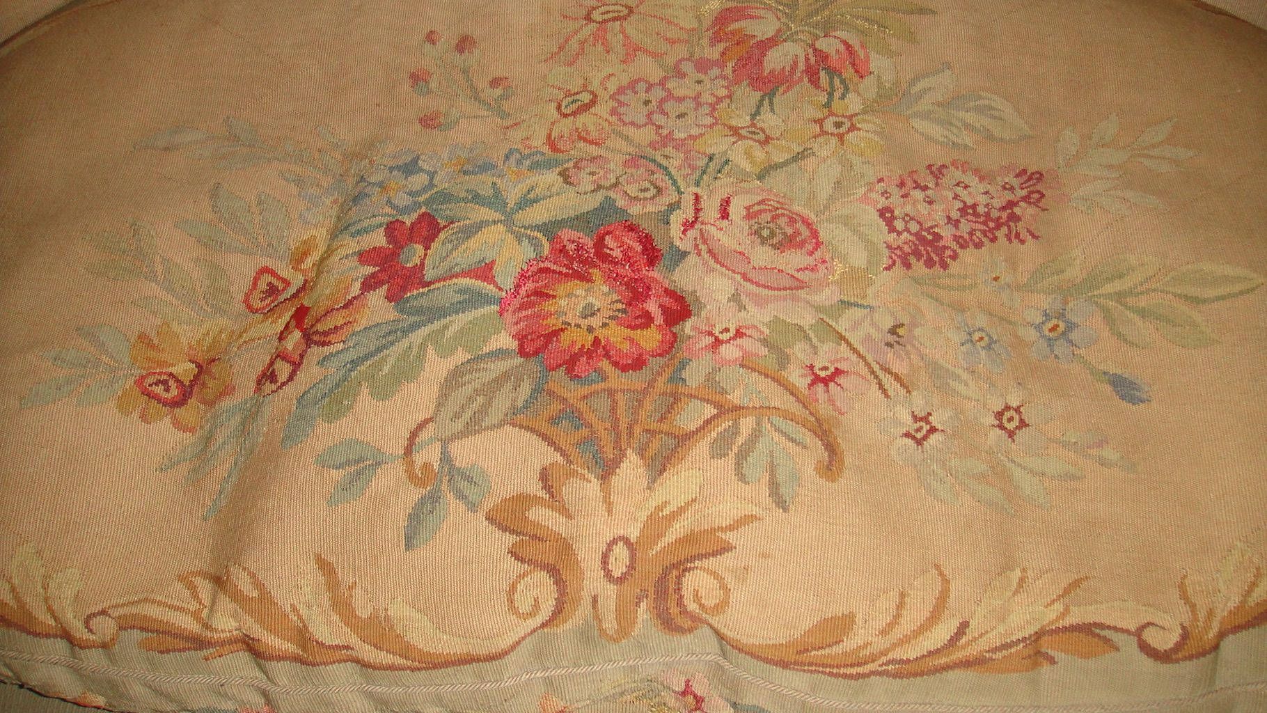 Pg.Furn1.AubussSettee. Gorgeous Antique French Aubusson Settee / sofa with down pillow and silk. Circa 1800's early 1900's A stunning French Antique Aubusson Settee in gorgeous colours and truly rich appearance to enhance any room. This piece is so great with the size as one can place it anywhere to bring more charm and warmth and surround it with more French accents. The colours are warm and the French Aubusson remains in wonderful condition due to its age. The lining as shown in French Antique Green Silk is worn which is only natural and more charming and if you prefer you can have this area reupholstered however one would not notice it being the large fluffy down French Aubusson cushion that goes over this area. The hand carved ornate frame is stunning and in the warm colours of greens as shown and having some repairs on the frame. On the backside it it lined in rich velvet which has several smaller slits due to age. The settee is also unusual having five legs as shown which are made more study and with quality. A very gorgeous antique coming out a noble chateau in France. The aubusson due to age does have some stains as shown on the left arm and to the lower base...