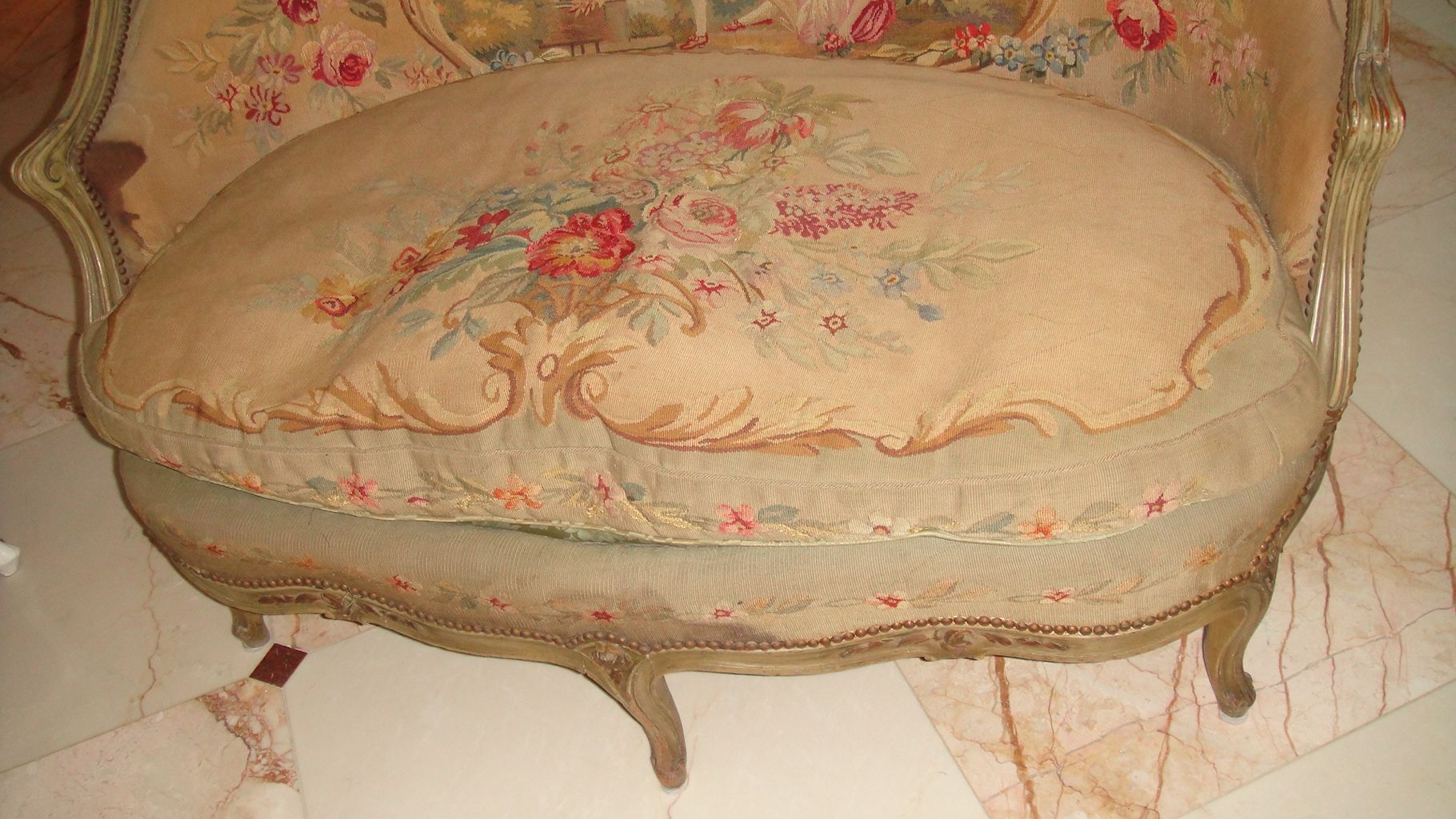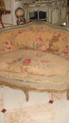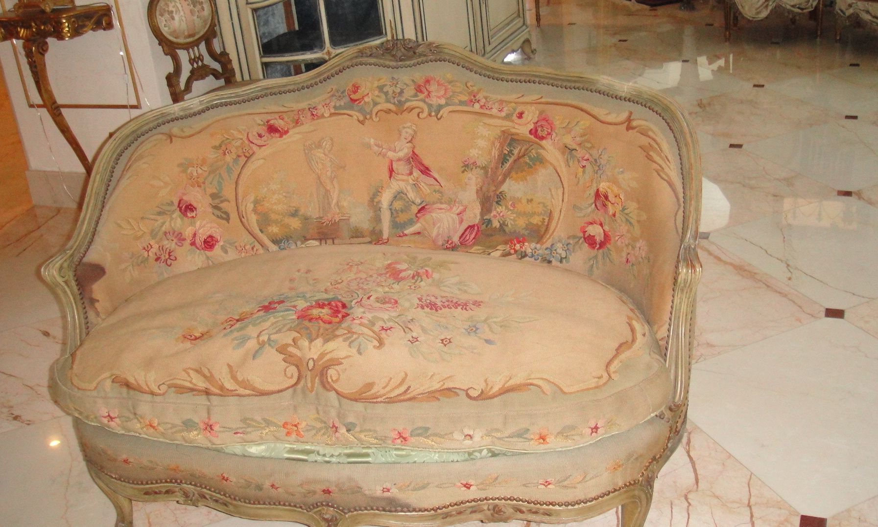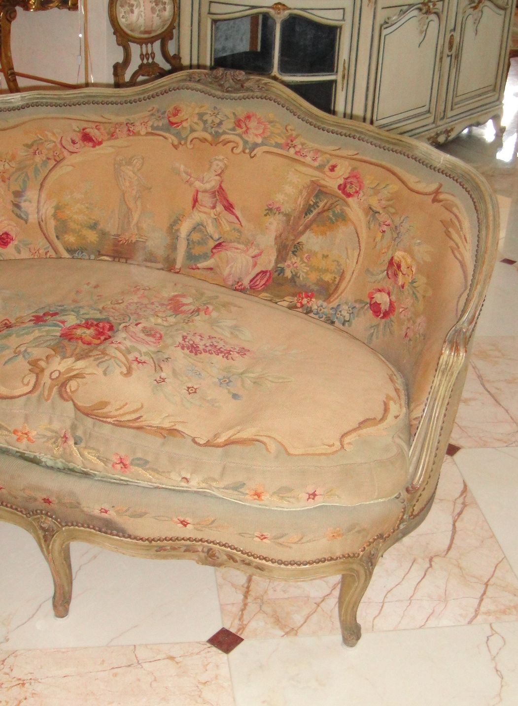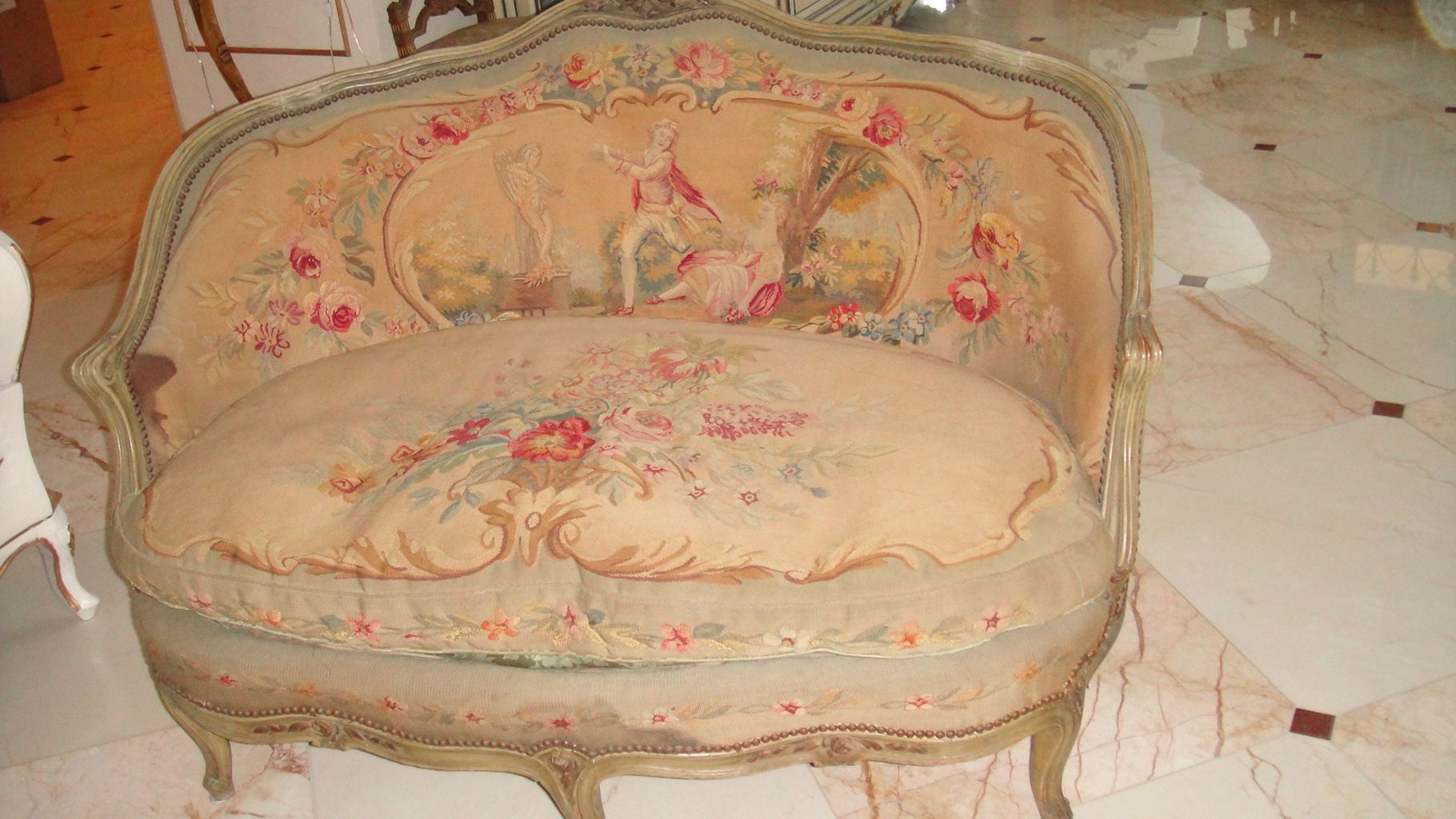 Pg.Furn1.AubussSettee. Gorgeous Antique French Aubusson Settee / sofa with down pillow and silk. Circa 1800's early 1900's A stunning French Antique Aubusson Settee in gorgeous colours and truly rich appearance to enhance any room. This piece is so great with the size as one can place it anywhere to bring more charm and warmth and surround it with more French accents. The colours are warm and the French Aubusson remains in wonderful condition due to its age. The lining as shown in French Antique Green Silk is worn which is only natural and more charming and if you prefer you can have this area reupholstered however one would not notice it being the large fluffy down French Aubusson cushion that goes over this area. The hand carved ornate frame is stunning and in the warm colours of greens as shown and having some repairs on the frame. On the backside it it lined in rich velvet which has several smaller slits due to age. The settee is also unusual having five legs as shown which are made more study and with quality. A very gorgeous antique coming out a noble chateau in France. The aubusson due to age does have some stains as shown on the left arm and to the lower base...