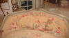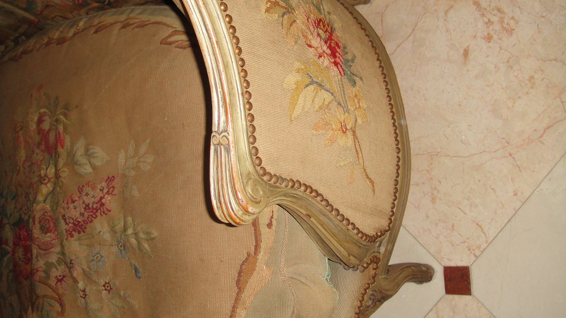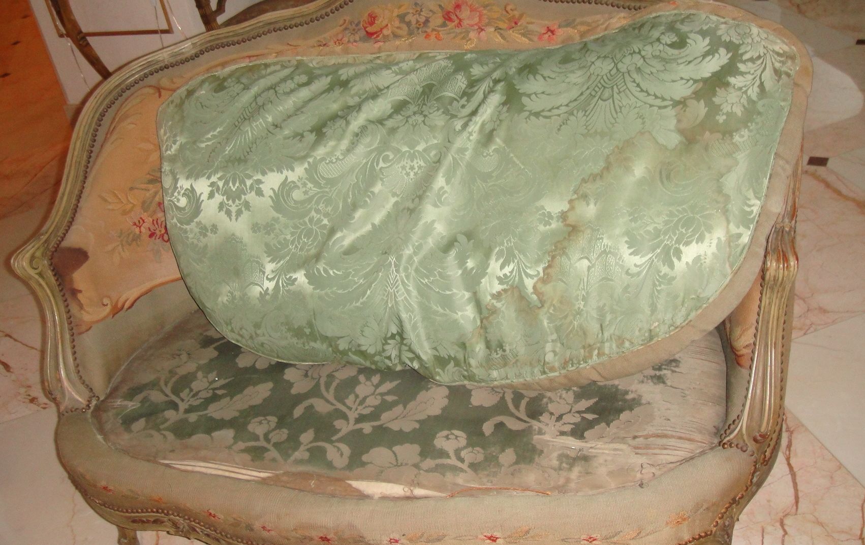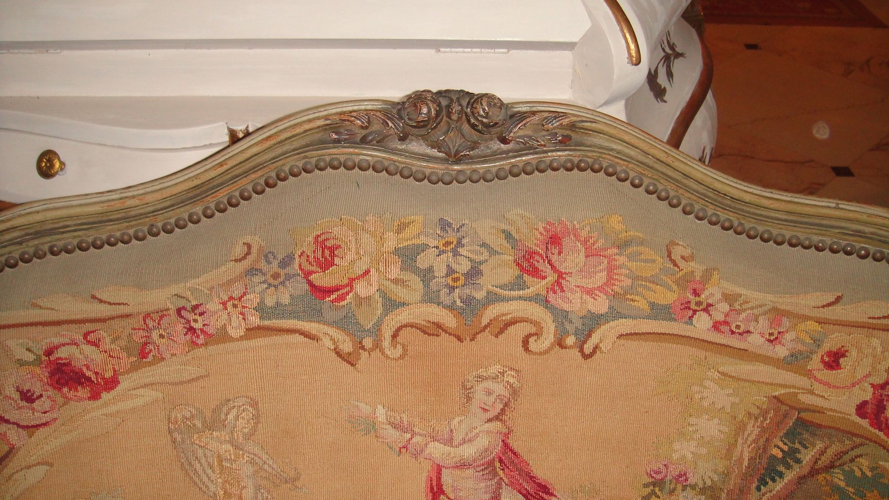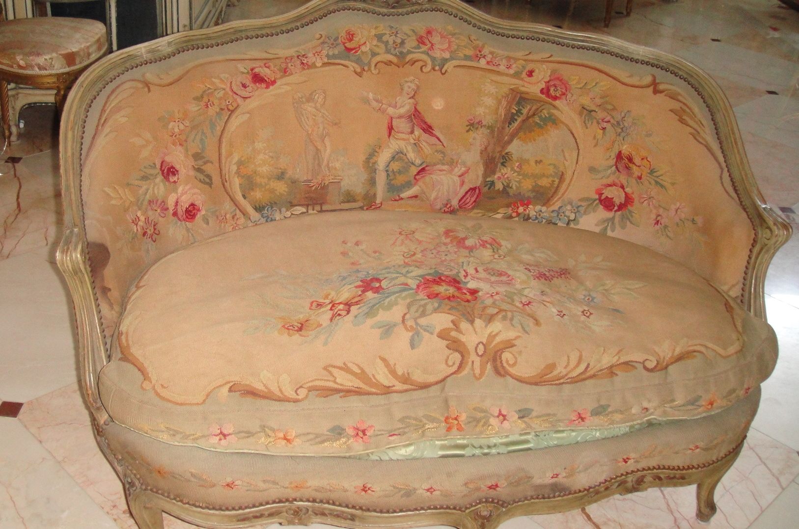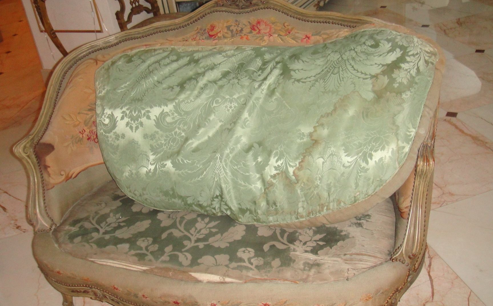 Pg.Furn1.AubussSettee. Gorgeous Antique French Aubusson Settee / sofa with down pillow and silk. Circa 1800's early 1900's A stunning French Antique Aubusson Settee in gorgeous colours and truly rich appearance to enhance any room. This piece is so great with the size as one can place it anywhere to bring more charm and warmth and surround it with more French accents. The colours are warm and the French Aubusson remains in wonderful condition due to its age. The lining as shown in French Antique Green Silk is worn which is only natural and more charming and if you prefer you can have this area reupholstered however one would not notice it being the large fluffy down French Aubusson cushion that goes over this area. The hand carved ornate frame is stunning and in the warm colours of greens as shown and having some repairs on the frame. On the backside it it lined in rich velvet which has several smaller slits due to age. The settee is also unusual having five legs as shown which are made more study and with quality. A very gorgeous antique coming out a noble chateau in France. The aubusson due to age does have some stains as shown on the left arm and to the lower base...