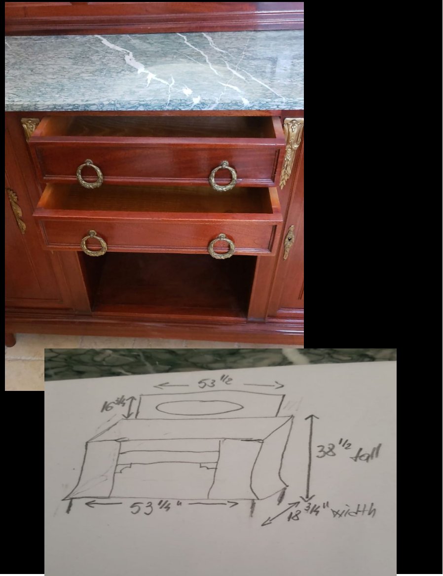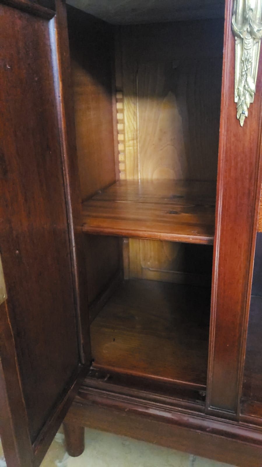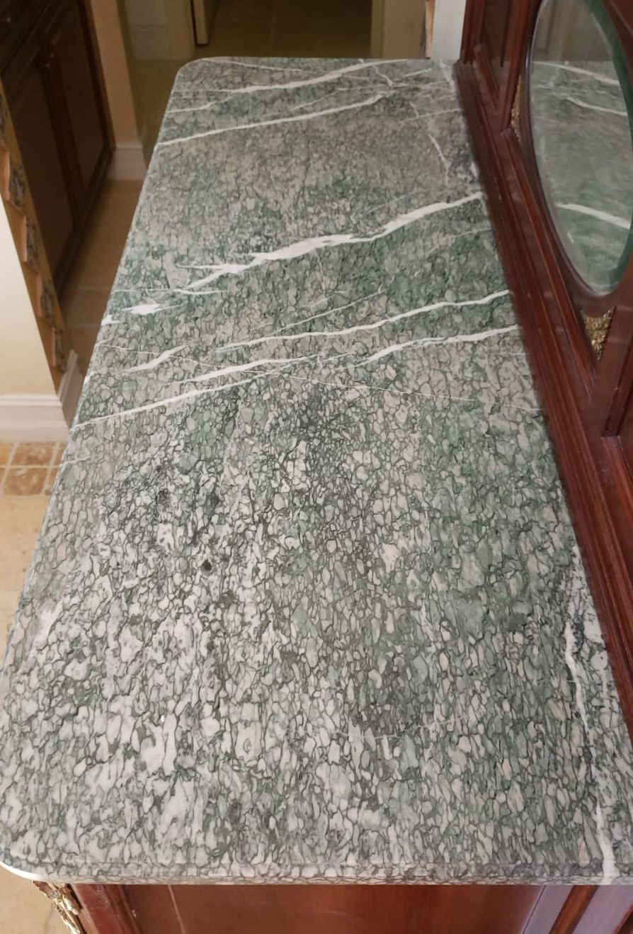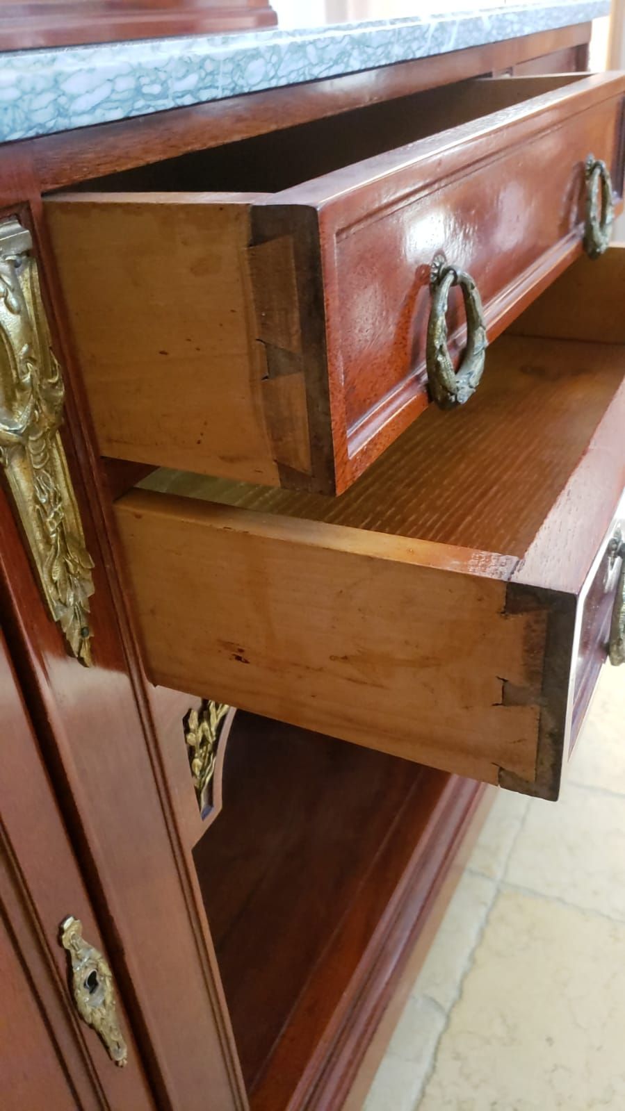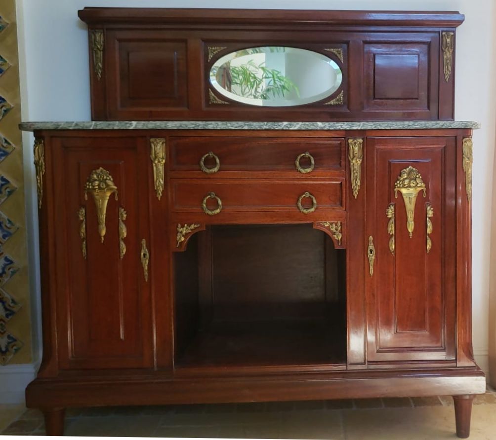 Pg.furnSidebd. Ornate Wood French Antique Sideboard Cabinet. Gorgeous Marble top French Sideboard Cabinet filled with gorgeous Ormolu and lots of storage space at both sides in addition to center lower and front drawers. It features a stunning upper removable mirror section surrounded with the same wood at bottom. This remains in beautiful condition for its age in addition to the upper beveled oval mirror section if you chose to use it without it. The marble remains in wonderful condition for its age other then extremely minor/minuet nicks and has a wonderful patina which adds so much charm. This piece will adorn any room yet be extremely useful to use in a bedroom, bathroom, kitchen and dining area. This would also make an incredible sink cabinet or entrance cabinet if you are seeking such. It is made solid and with quality and remains gorgeous to treasure and admire forever.