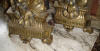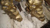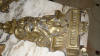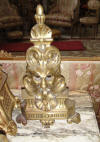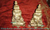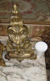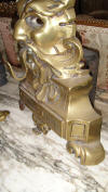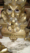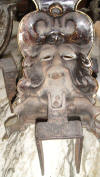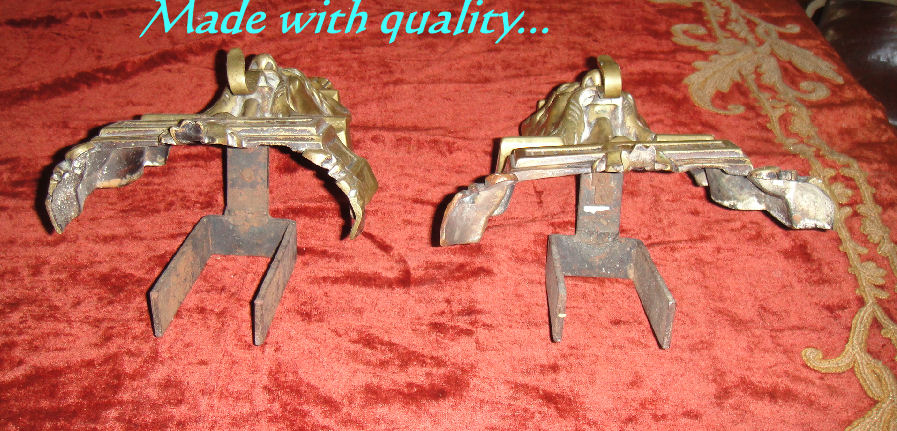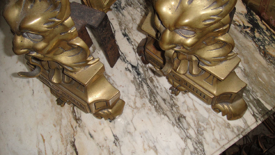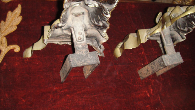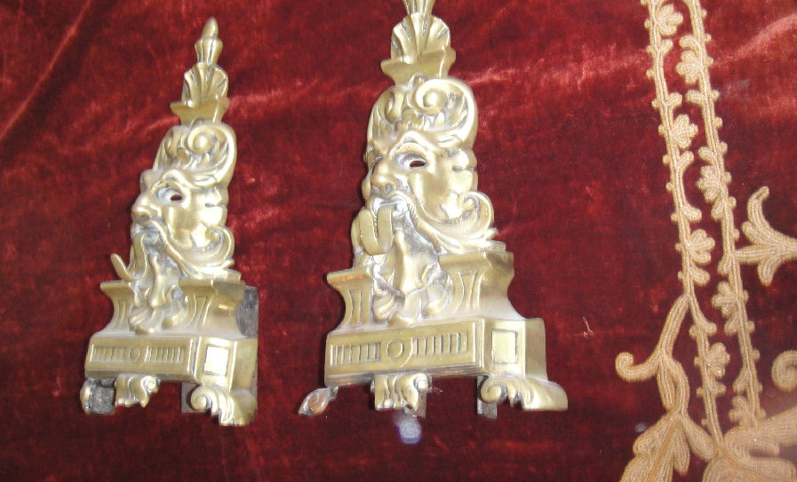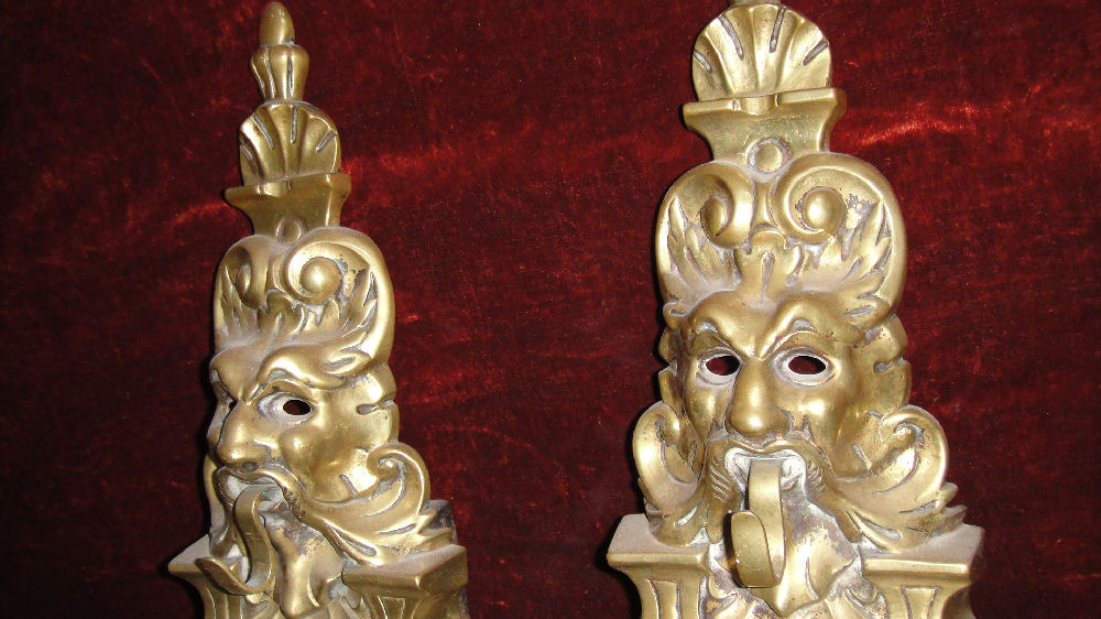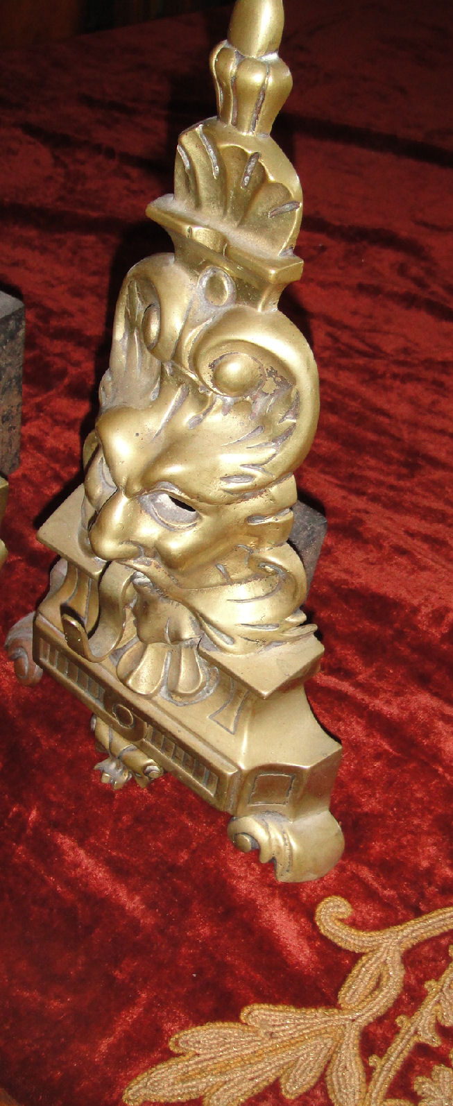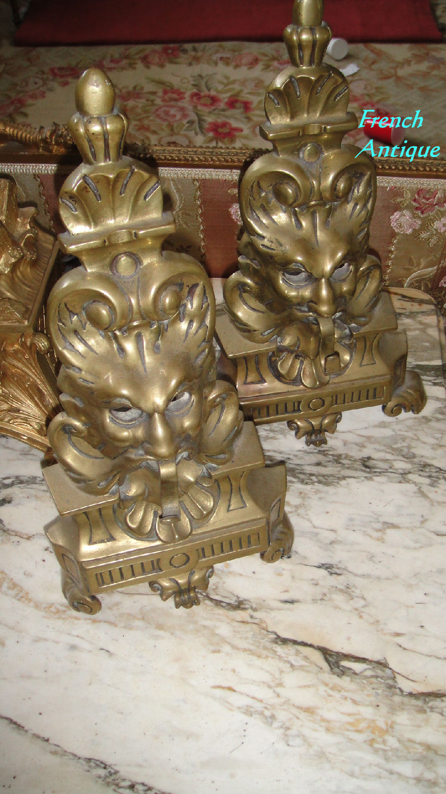 KNOBPG.FURN. Wonderful and Unique Antique French pr. of Gnomes Fireplace set. Each is heavy and made of iron on the backside and bronze on the front side. Their eyes are hollow so one can view through them. There is a loop/hook shown below their nose for you to use a rod if you prefer one-----or use them just as they are. If you wish to use resting on a table for something different -- you might want to place a rod over this hook on each Gnome and then place a small tapestry hanging from it. You could use these for many purposes--- another idea might be for one to use inside your bathroom using one of your own ornate rods and place beneath their noses on the hooks shown and then place a decorative towel on this rod. The are in beautiful condition and I know someone would truly treasure them.