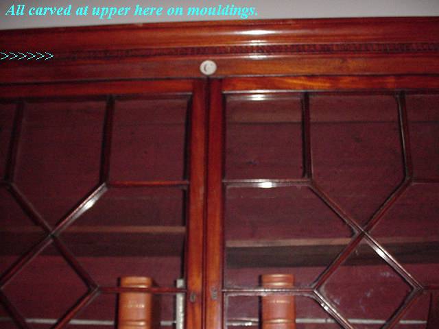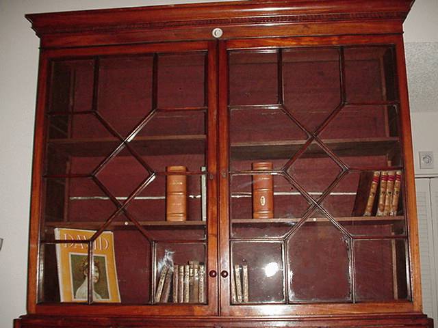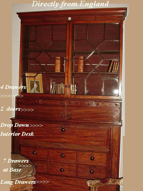 PE117. Outstanding George III English Bookcase with drop front desk. Outstanding quality and workmanship in this entire antique having upper two doors and each shelf is numbered in porcelain. Four addition drawers at center along with 2 more longer ones--each with locks. The drop front desk area having lots of room on interior however, the interior needs work done to it. . Below this drop down area--are additional drawers having 6 Drawers total. At base is another longer drawer for additional space. Does need some work done to this Beauty. High Quality and an exceptional well made piece. Due to needing repairs--it is priced such however, the value would be well worth much more when repaired. Please email me for any questions on this piece. Glazed Glass on Upper Doors with Porcelain numbers on interior.