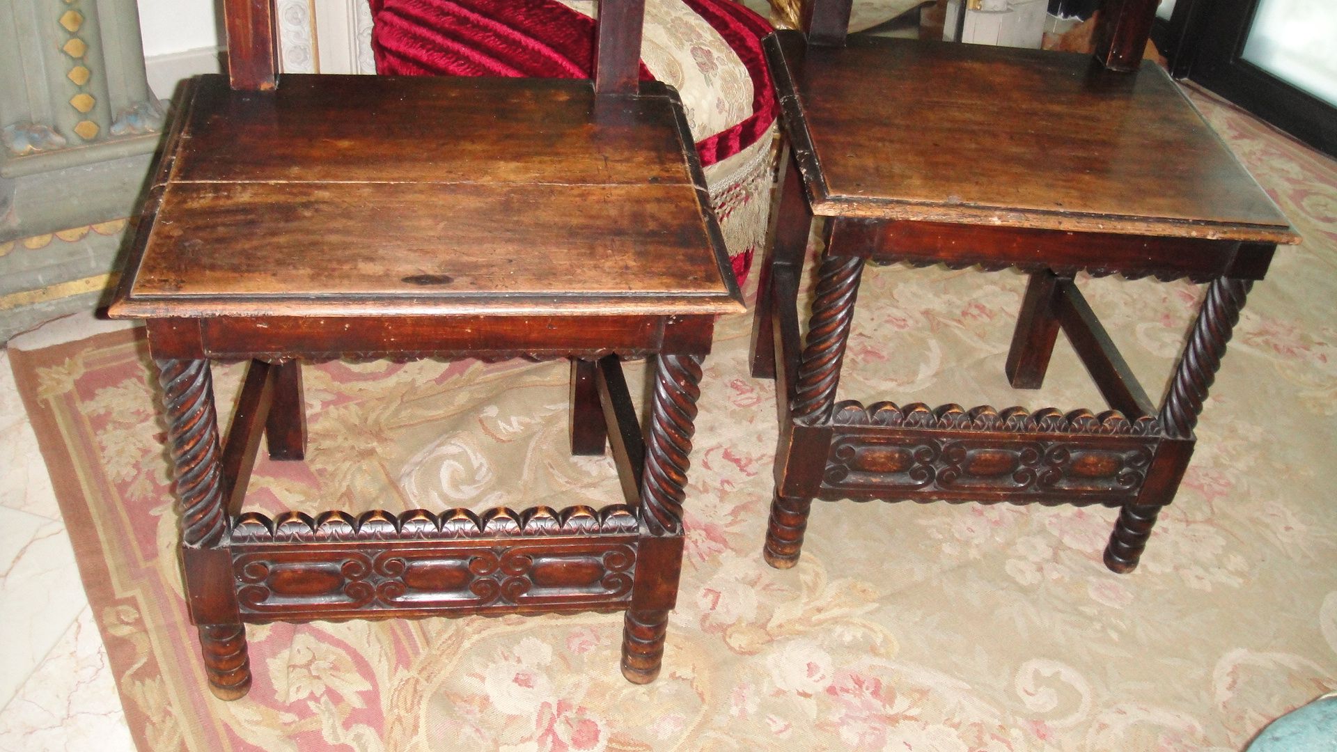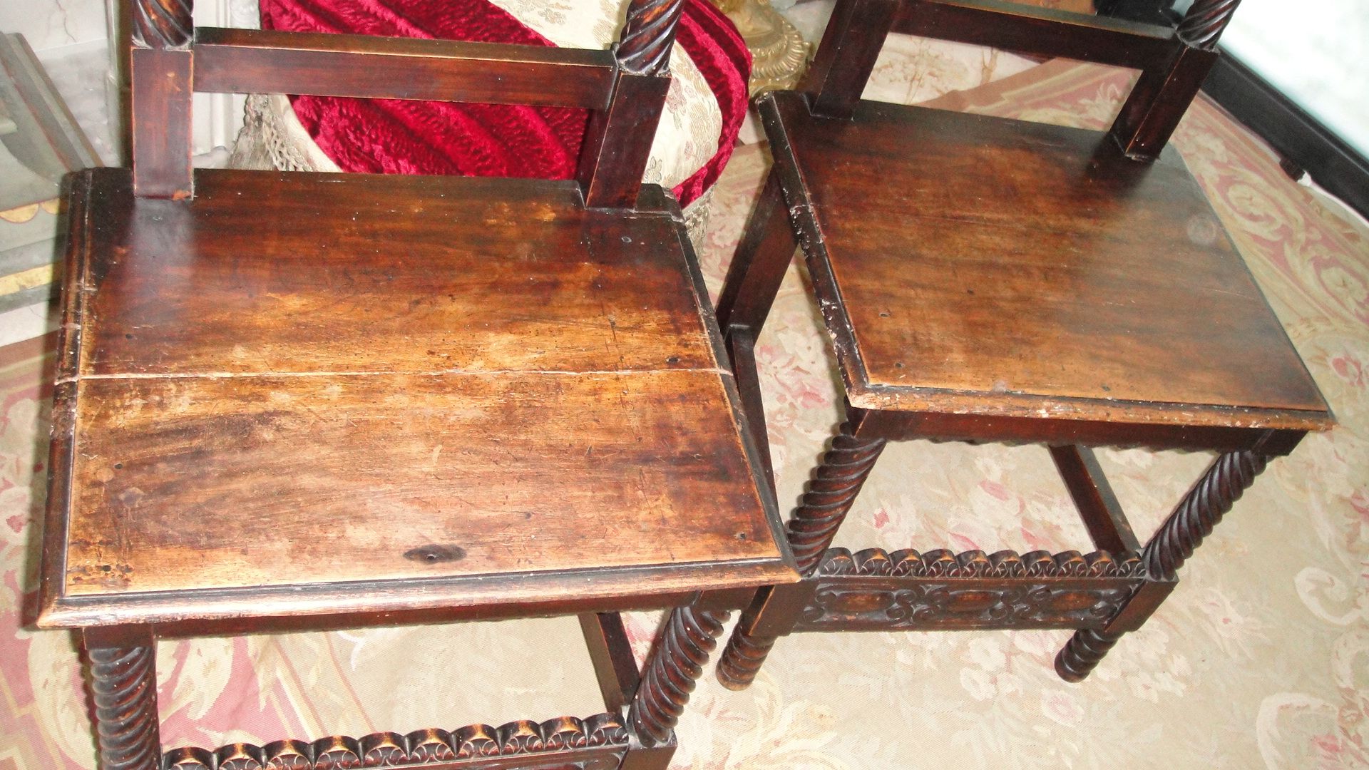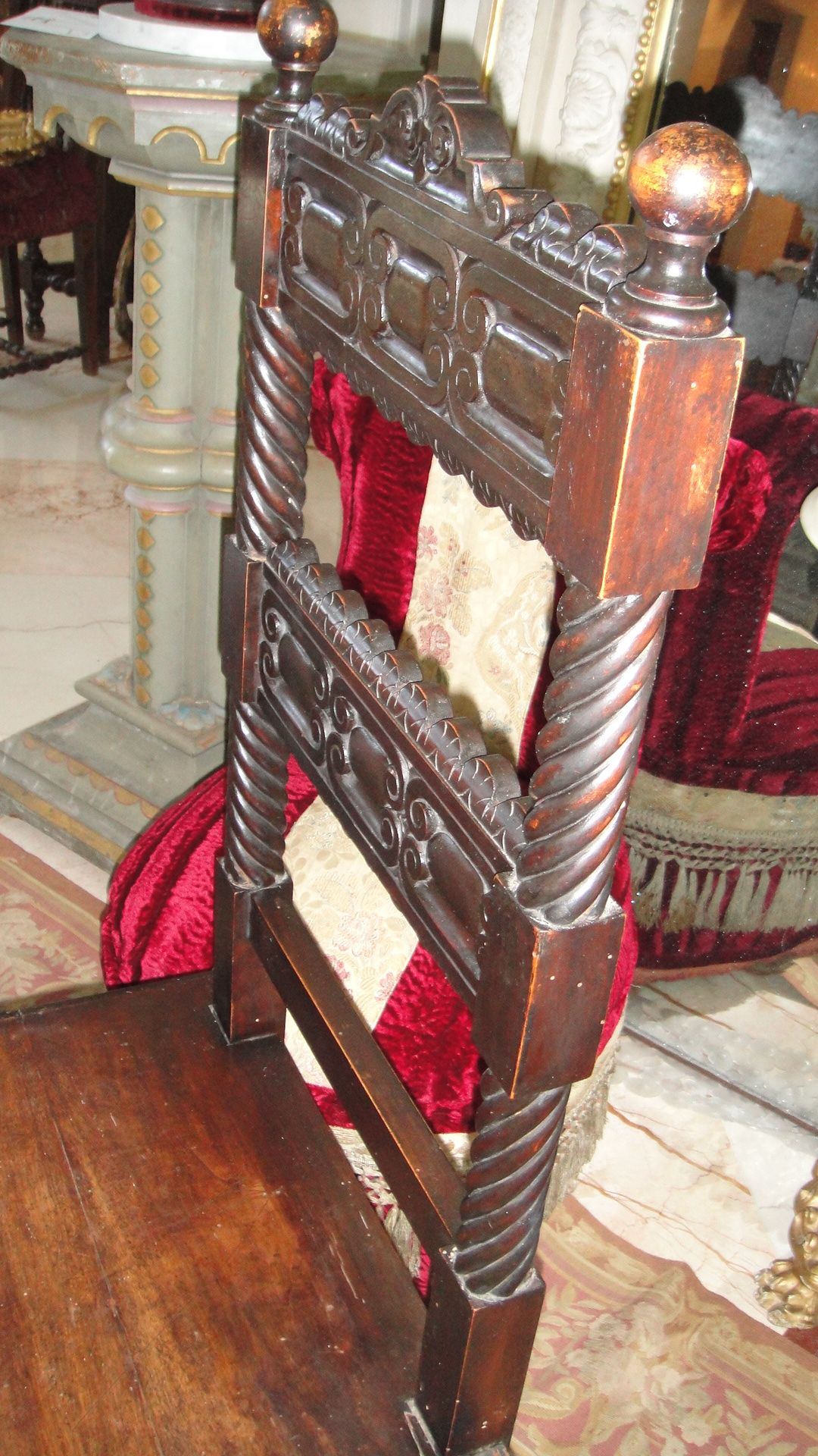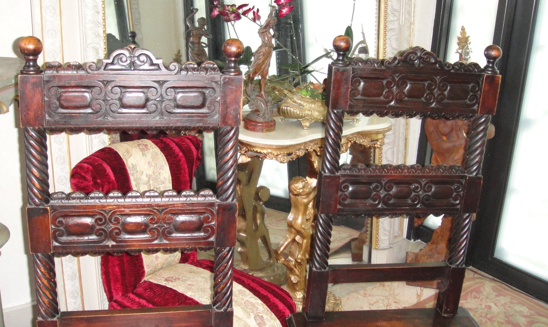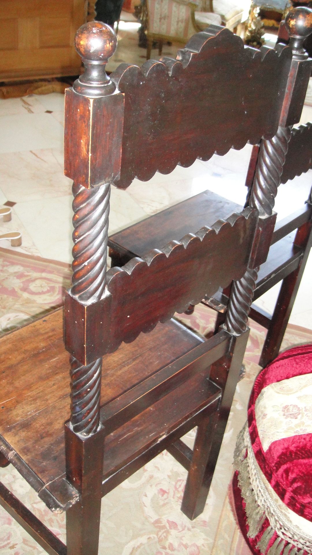 # PRCHR.PG.FUEN.2. Gorgeous Antique French / Spanish Chairs. Circa 1880 and filled at the upper with heavy carvings as well as the high back. In addition the backs having scalloped edges as shown on each photo making them really a rich appearance. Each having a wide seat making it very comfortable for sitting. Each is solid and strong however being so old they have character age marks throughout as shown in photos. Some of the staining has also rubbed off however this is so easy to rub back on. If you notice also the backs having gorgeous spiral columns which truly make them so unique in appearance as well. They having minor repairs but nothing to distract from quality or beauty and they have been well maintained from all the past owners because these are honestly gorgeous gorgeous antique chairs. The the looks alone give them character and then being the seat so wide and large it makes them more appealing due to the comfortableness of them while sitting and in addition with the high back .... they make your back comfortable as well... Just sitting there alone ..the chairs really stand out.