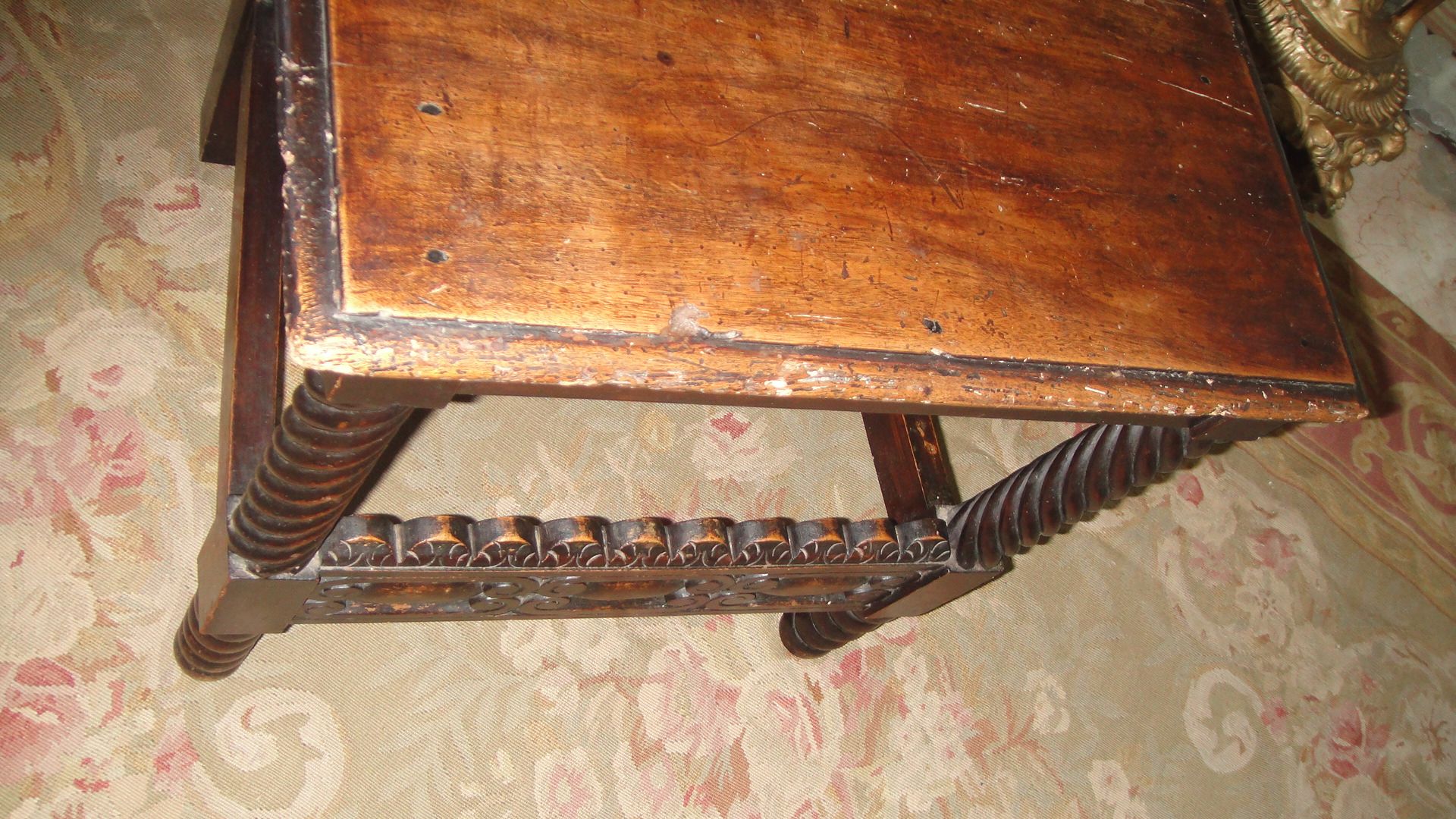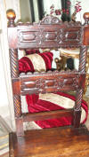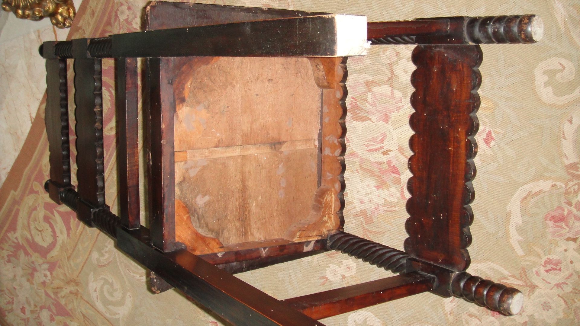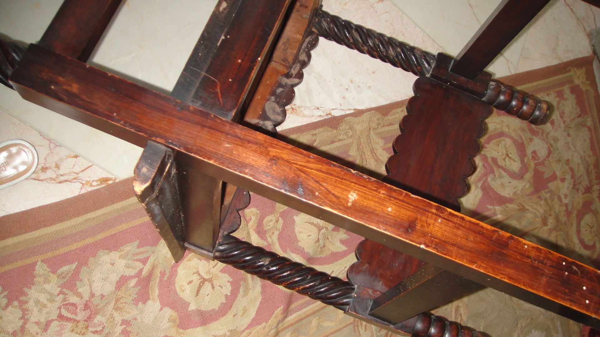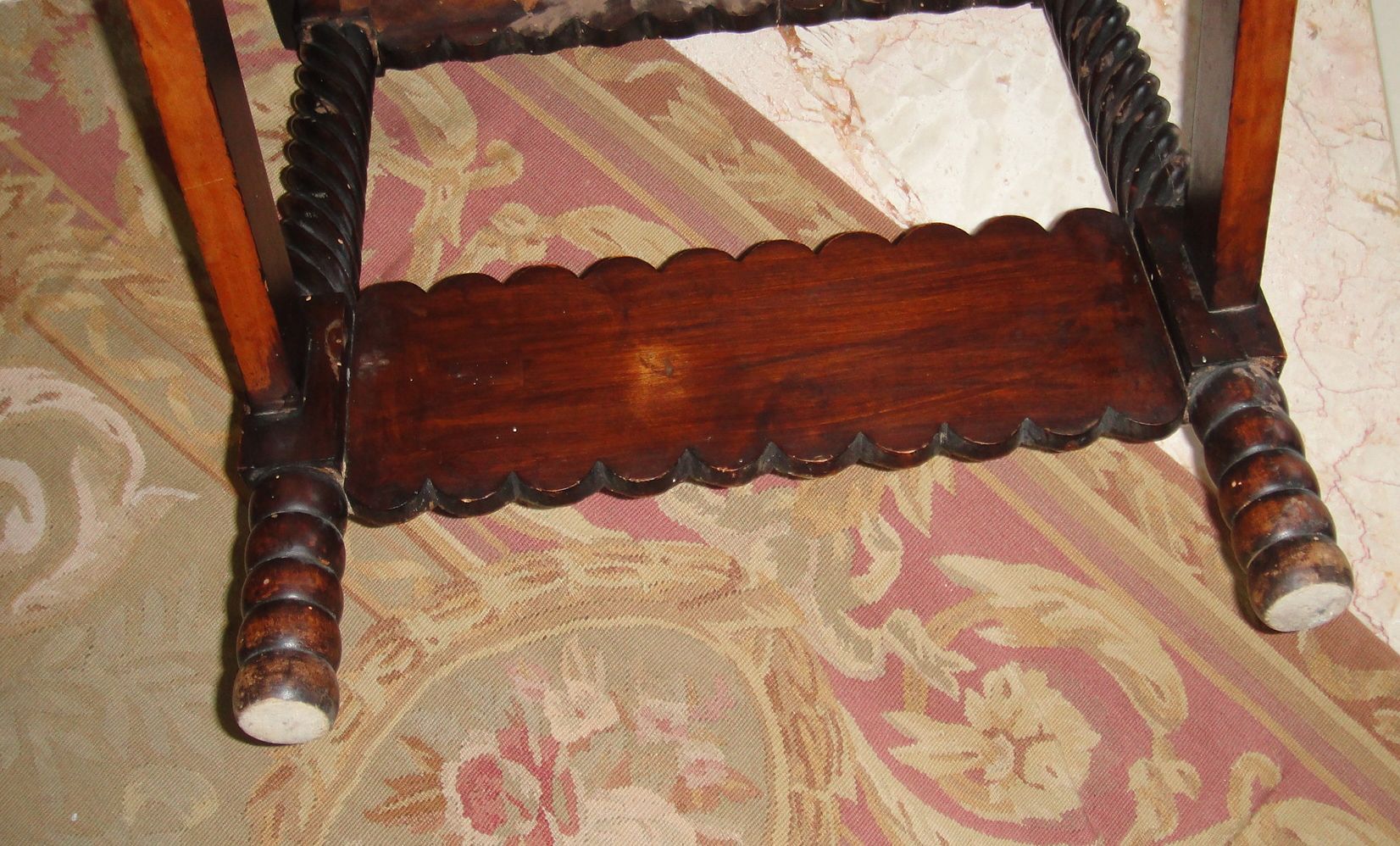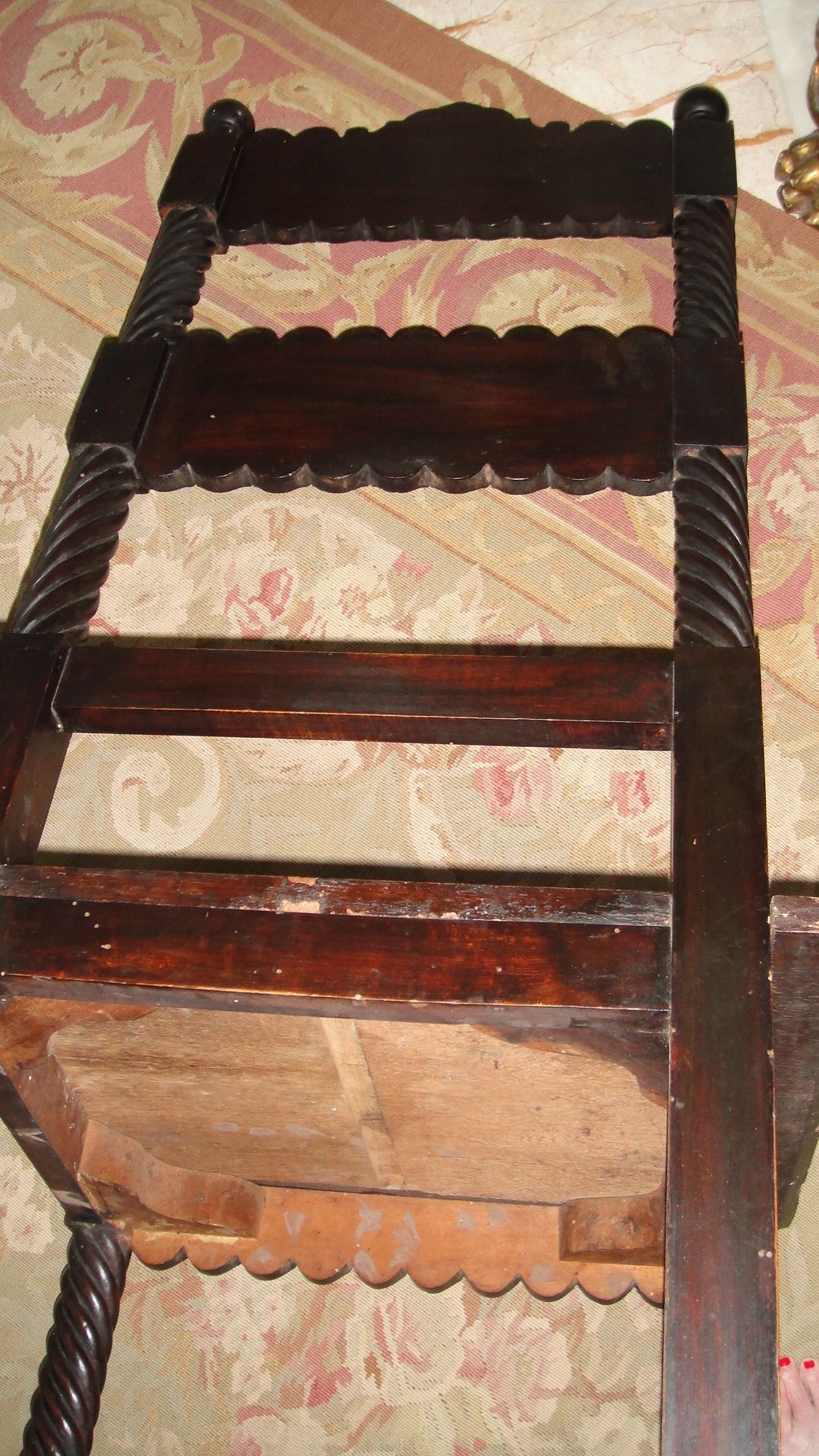 # PRCHR.PG.FUEN.2. Gorgeous Antique French / Spanish Chairs. Circa 1880 and filled at the upper with heavy carvings as well as the high back. In addition the backs having scalloped edges as shown on each photo making them really a rich appearance. Each having a wide seat making it very comfortable for sitting. Each is solid and strong however being so old they have character age marks throughout as shown in photos. Some of the staining has also rubbed off however this is so easy to rub back on. If you notice also the backs having gorgeous spiral columns which truly make them so unique in appearance as well. They having minor repairs but nothing to distract from quality or beauty and they have been well maintained from all the past owners because these are honestly gorgeous gorgeous antique chairs. The the looks alone give them character and then being the seat so wide and large it makes them more appealing due to the comfortableness of them while sitting and in addition with the high back .... they make your back comfortable as well... Just sitting there alone ..the chairs really stand out.