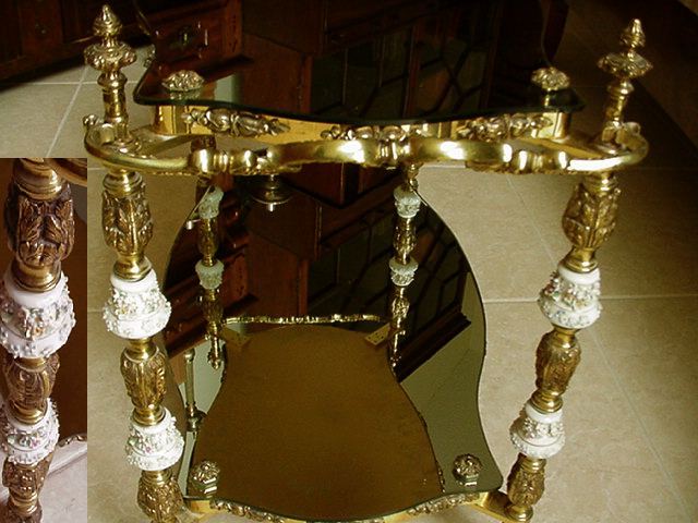 #MM. Rare Beauty !! Dresden Mirrored Table--Gorgeous Dresden sides with Mirrored 2 tier center. Can be used as Serving Table or Coffee Table. From about 1920 with heavy brass ornate sides/upper & base. Dresden from age has been re-glued however this does not effect the quality nor the beauty of this whatsoever as you can see. Unusual Beauty in 2 tier scallop-like curved edges. A Gorgeous Showpiece to any room that nothings compare to this one.