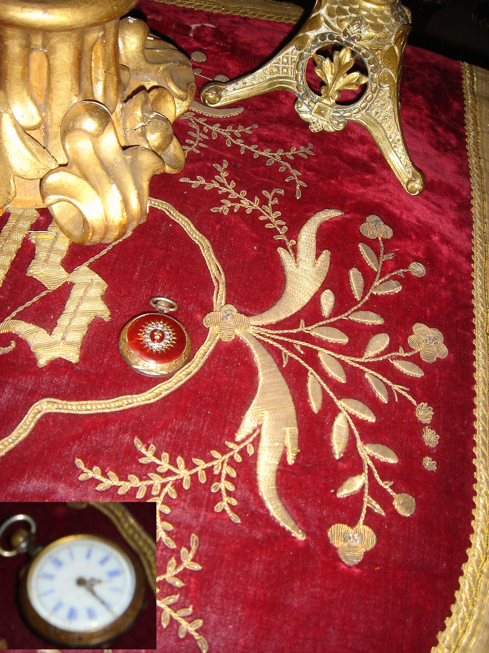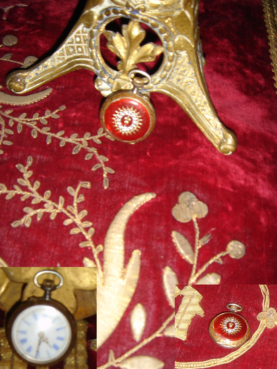 FRP. Antique French Cloisonné' watch. It does not work but I think it needs to be oiled as it is turned to tight.. Its red Cloisonné' and from the 1800's. And, its French & opens showing interior along with number on blue-- an additional opening.