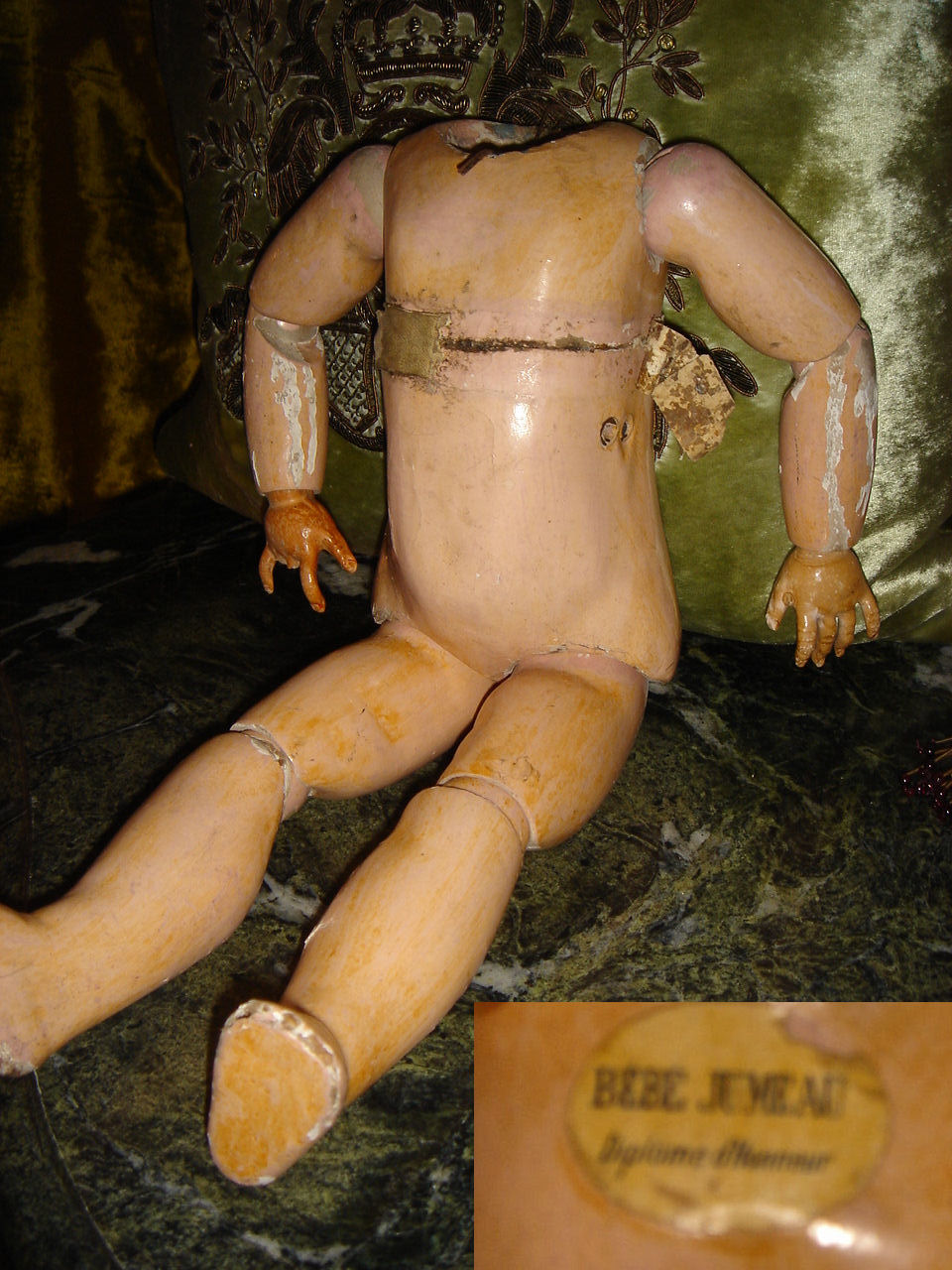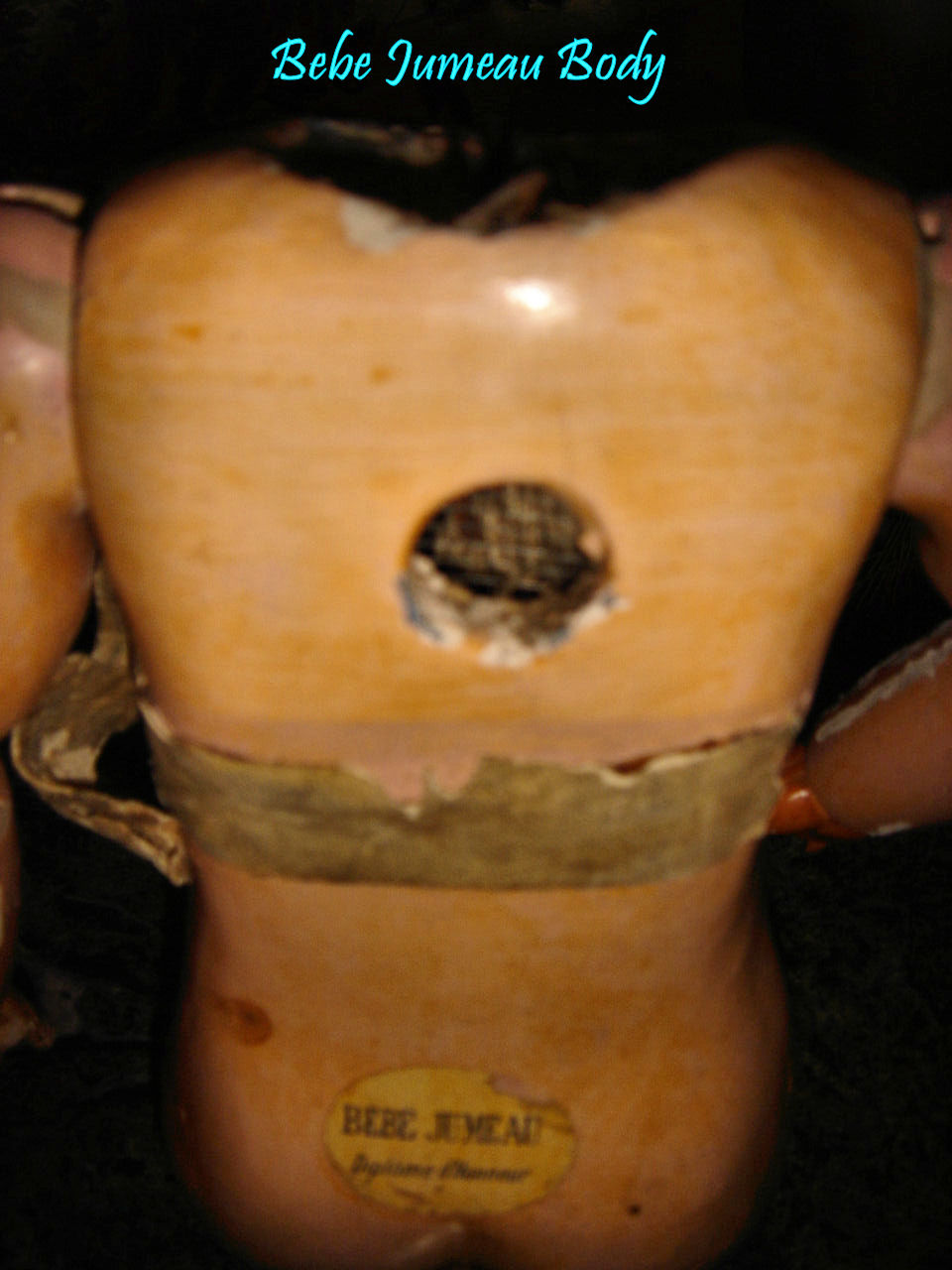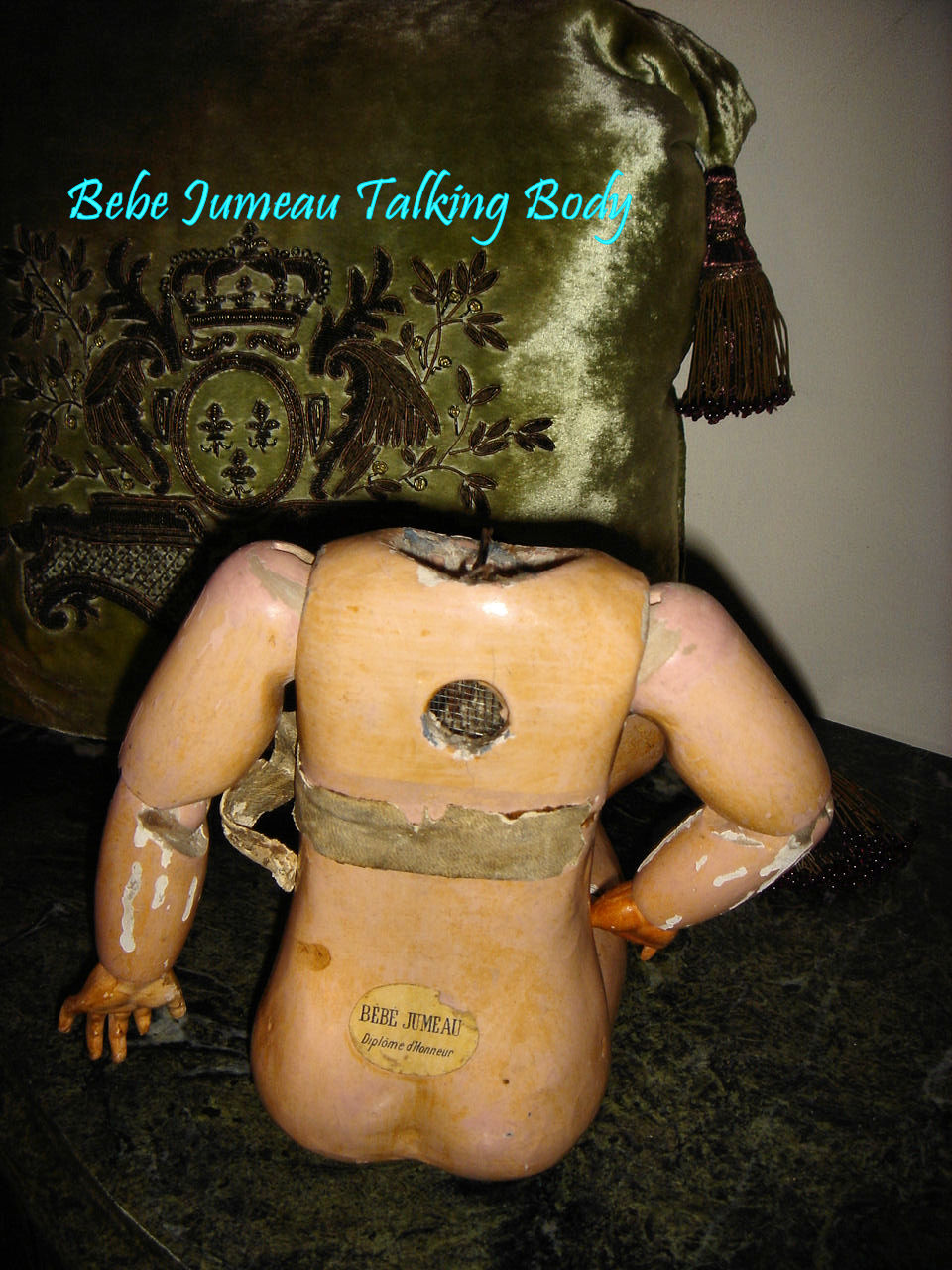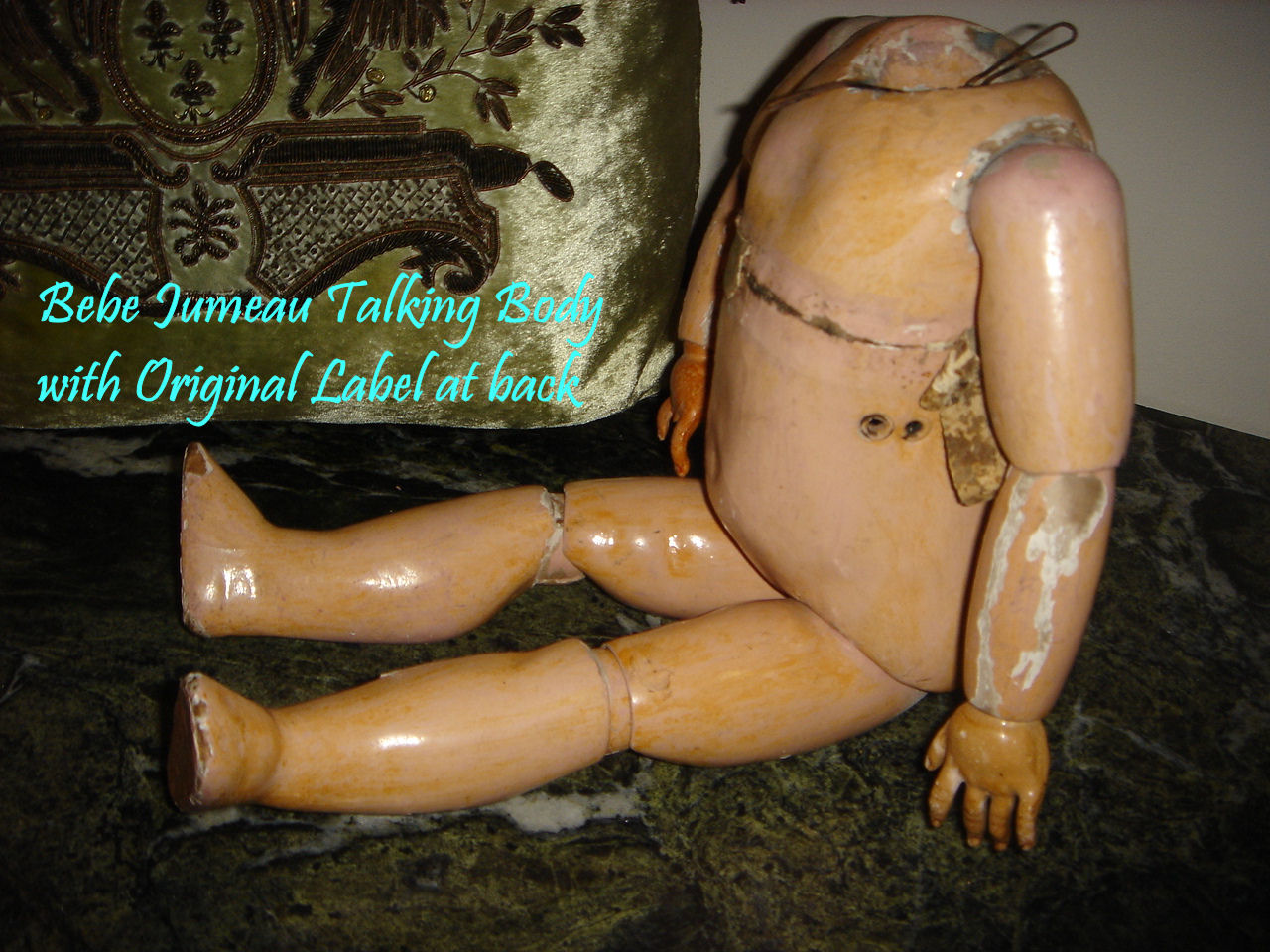 12. Antique French Bebe Jumeau Talking Body with Original Label on backside. Please view my large photos showing details on this antique French Bebe Jumeau Talking Body with no bisque head attached. Label on back reads " Bebe Jumeau Diplome d'Honneur".