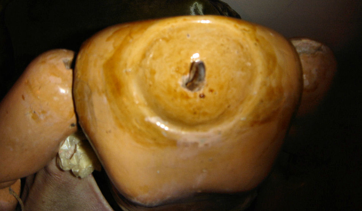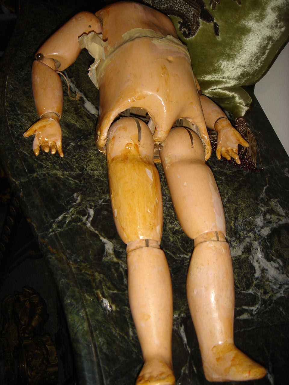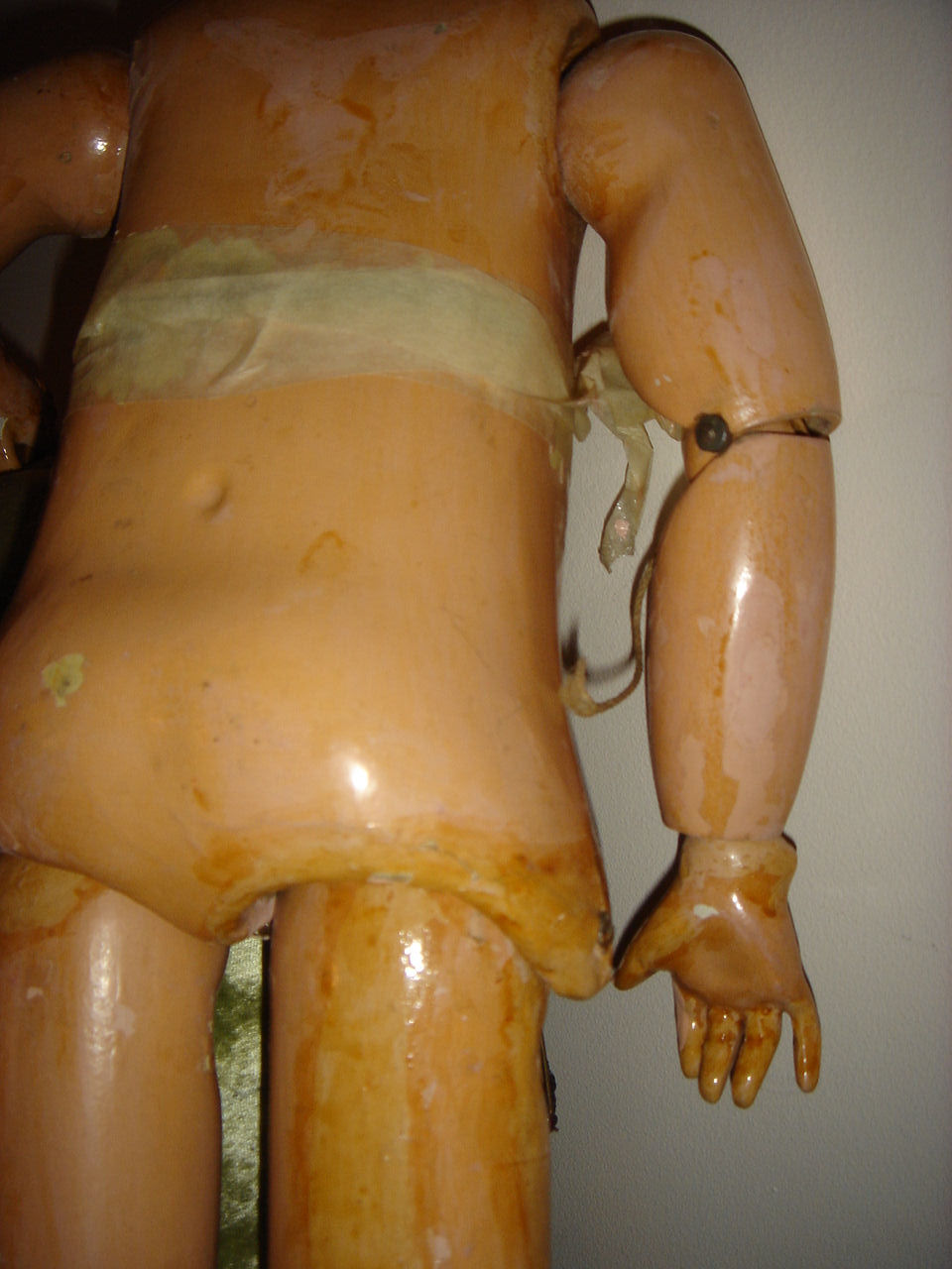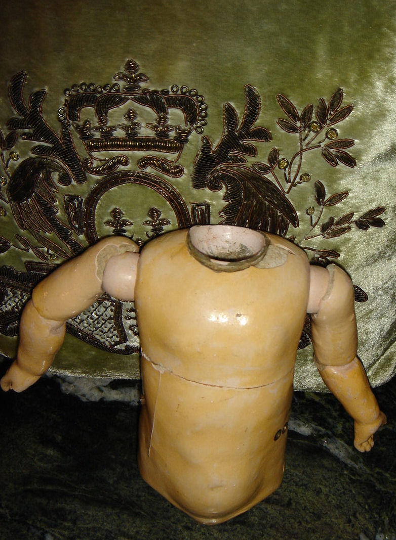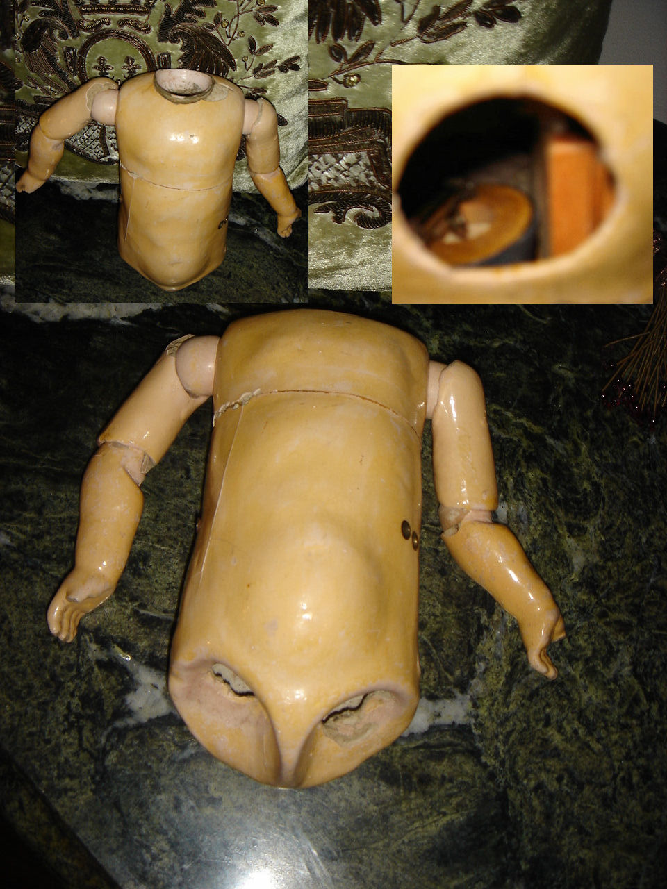 14. Antique French Talking doll body for bisque doll head. I took very large photos showing all details for this antique doll body with no bisque head. Two holes at side for talking which someone would have to repair. I believe the bellows for the talker are still inside.