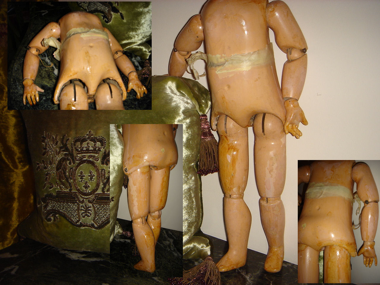 13. Antique Walking French body. Please see all my very large photos showing details on condition. She is a nice larger size needing head. This one is a beautiful body if you have a bisque head for her.