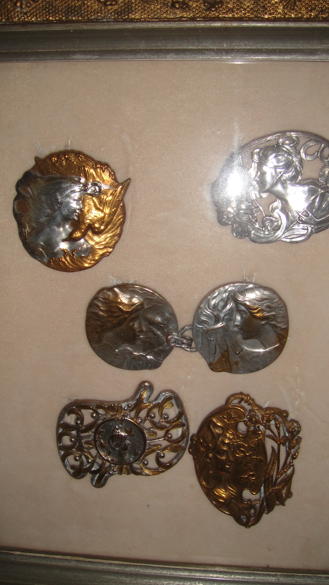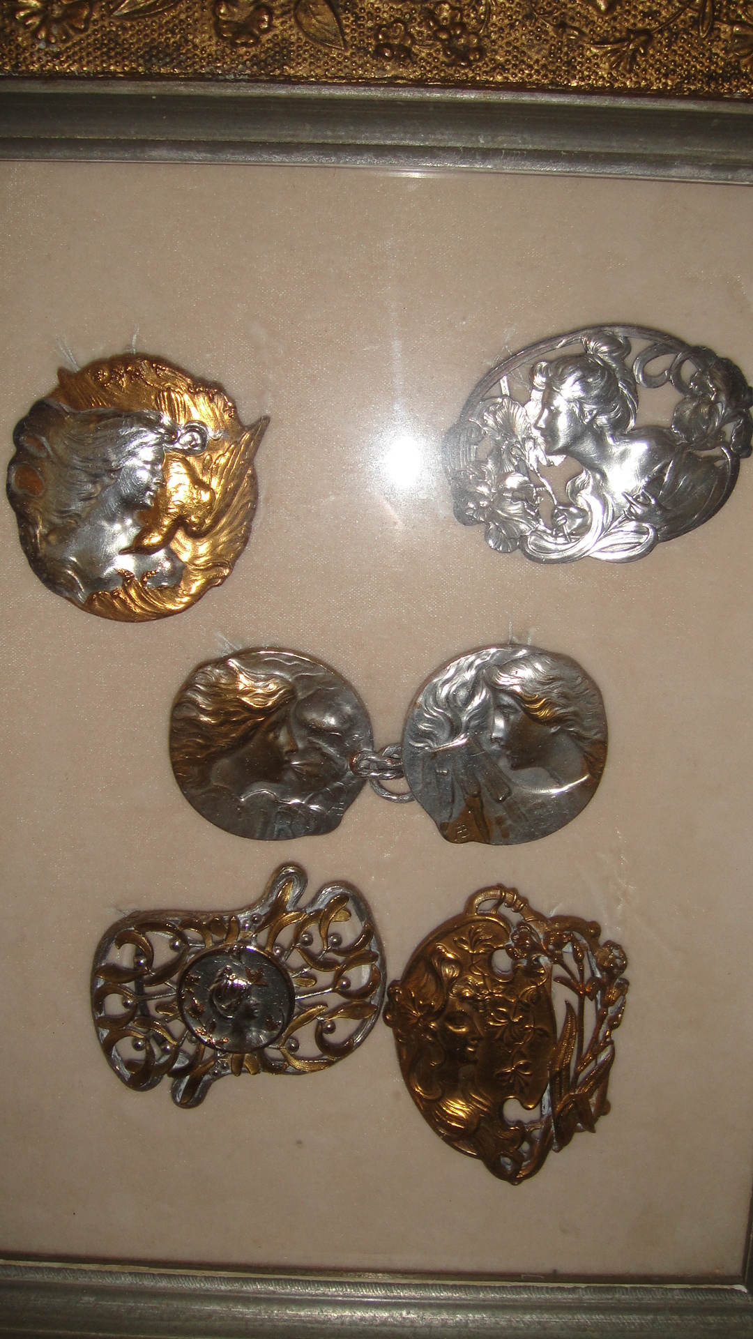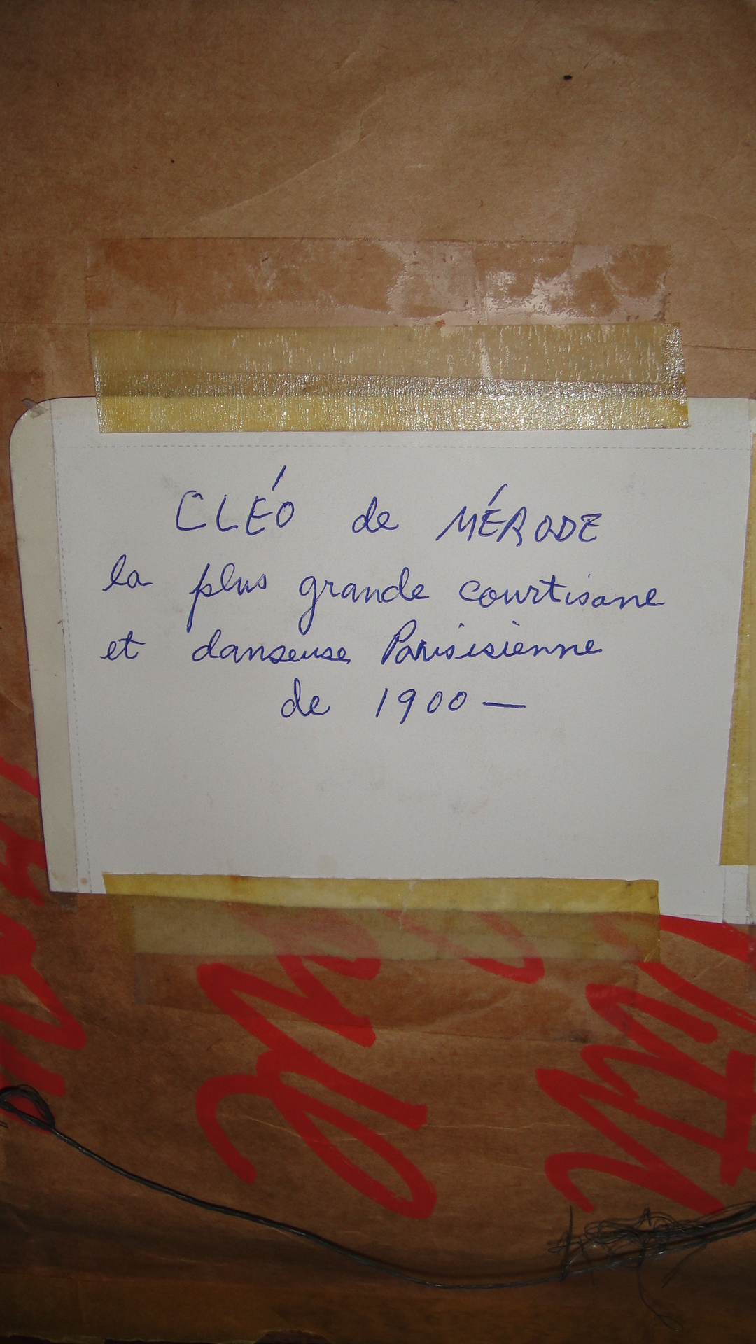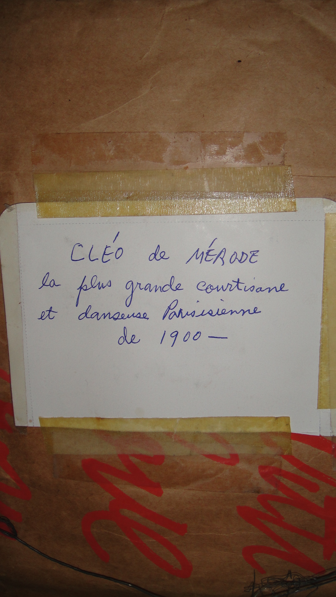 The famous Cleo de Merode circa 1900 Original Belt Buckles framed behind glass in a carved gold wood frame. You will notice this name appears behind the gold frame written on paper along with information attached as well and if you notice also, the tape is very old. Upon looking up her history which is much about her entire life I will briefly explain in my own words some of the information and if you care to you may read much more about her on your own research. Cléo de Mérode was French and she was popular due to her dancing in addition to her beauty. It is said also that many post cards and other paper work was made having her photo placed upon them due to this beauty of hers.