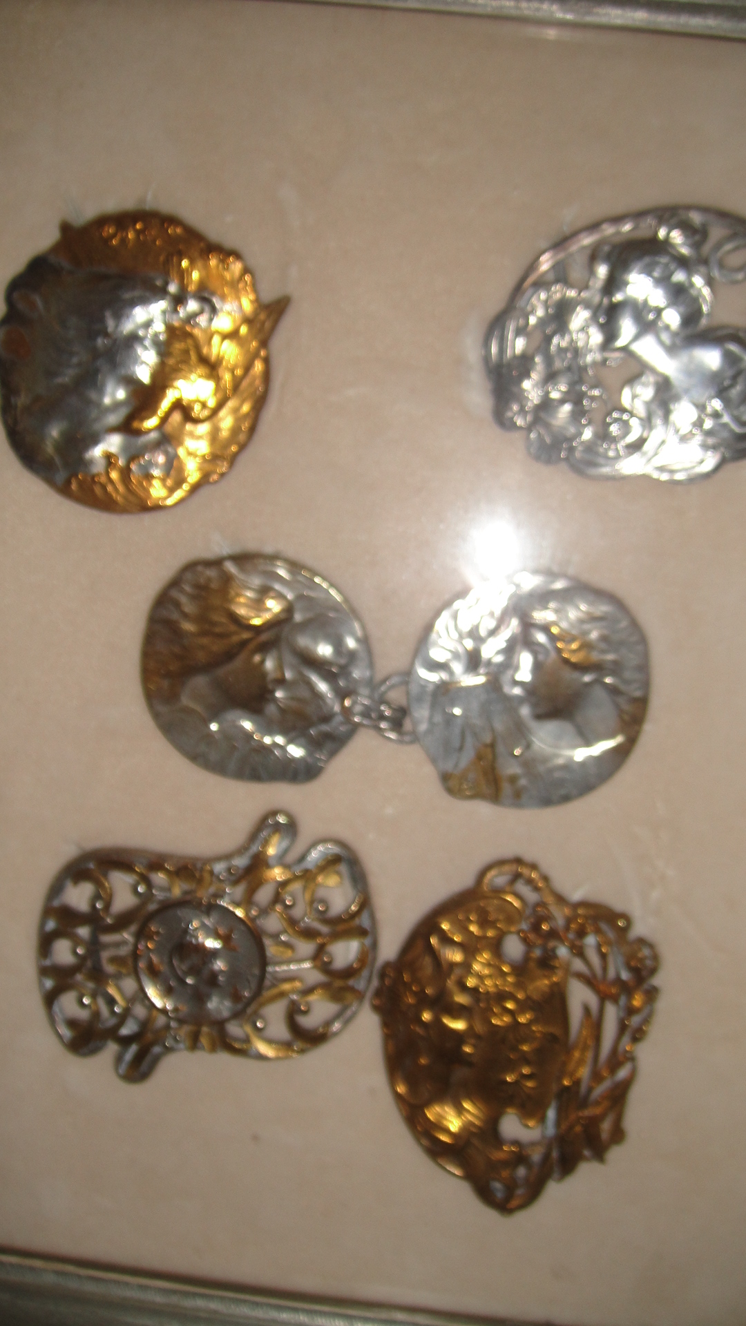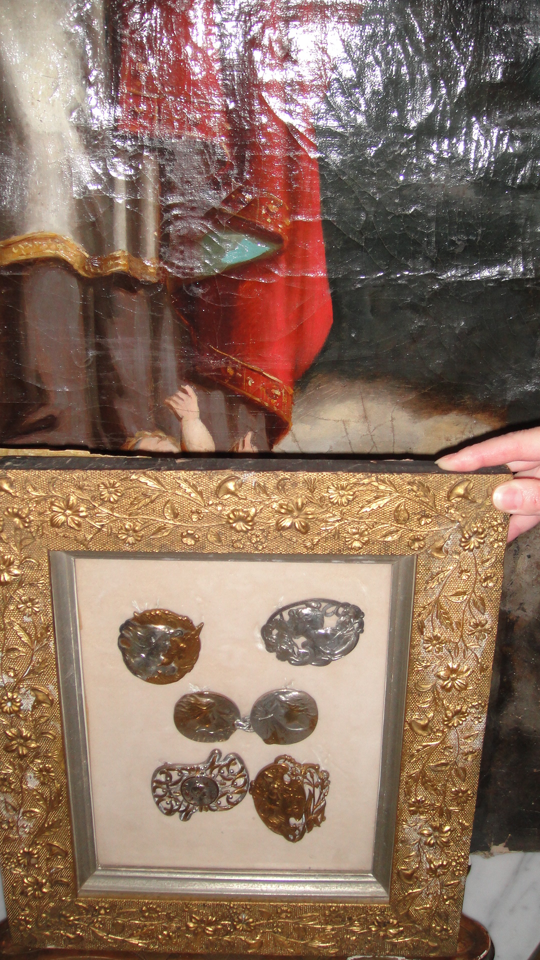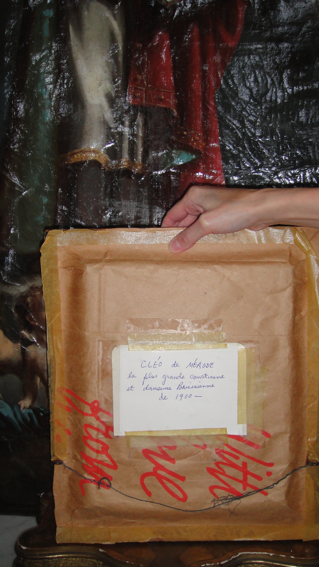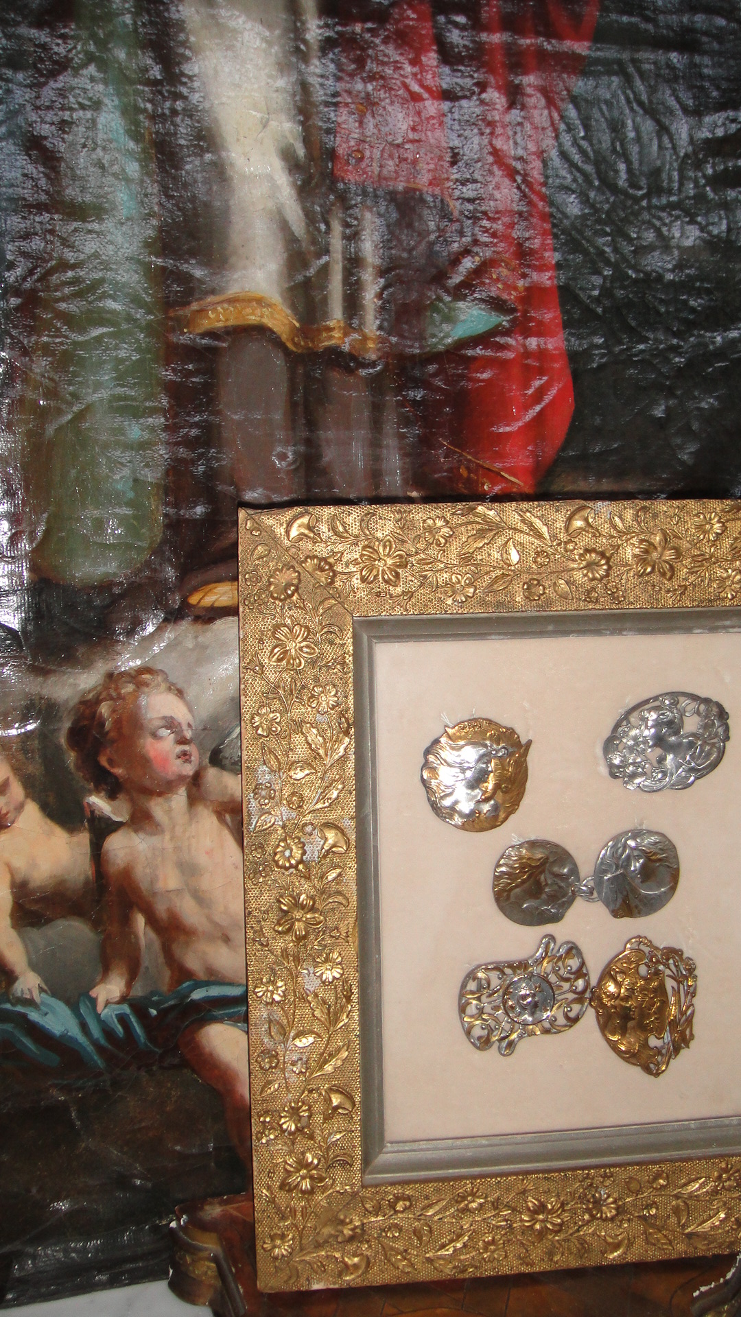 The famous Cleo de Merode circa 1900 Original Belt Buckles framed behind glass in a carved gold wood frame. You will notice this name appears behind the gold frame written on paper along with information attached as well and if you notice also, the tape is very old. Upon looking up her history which is much about her entire life I will briefly explain in my own words some of the information and if you care to you may read much more about her on your own research. Cléo de Mérode was French and she was popular due to her dancing in addition to her beauty. It is said also that many post cards and other paper work was made having her photo placed upon them due to this beauty of hers.