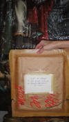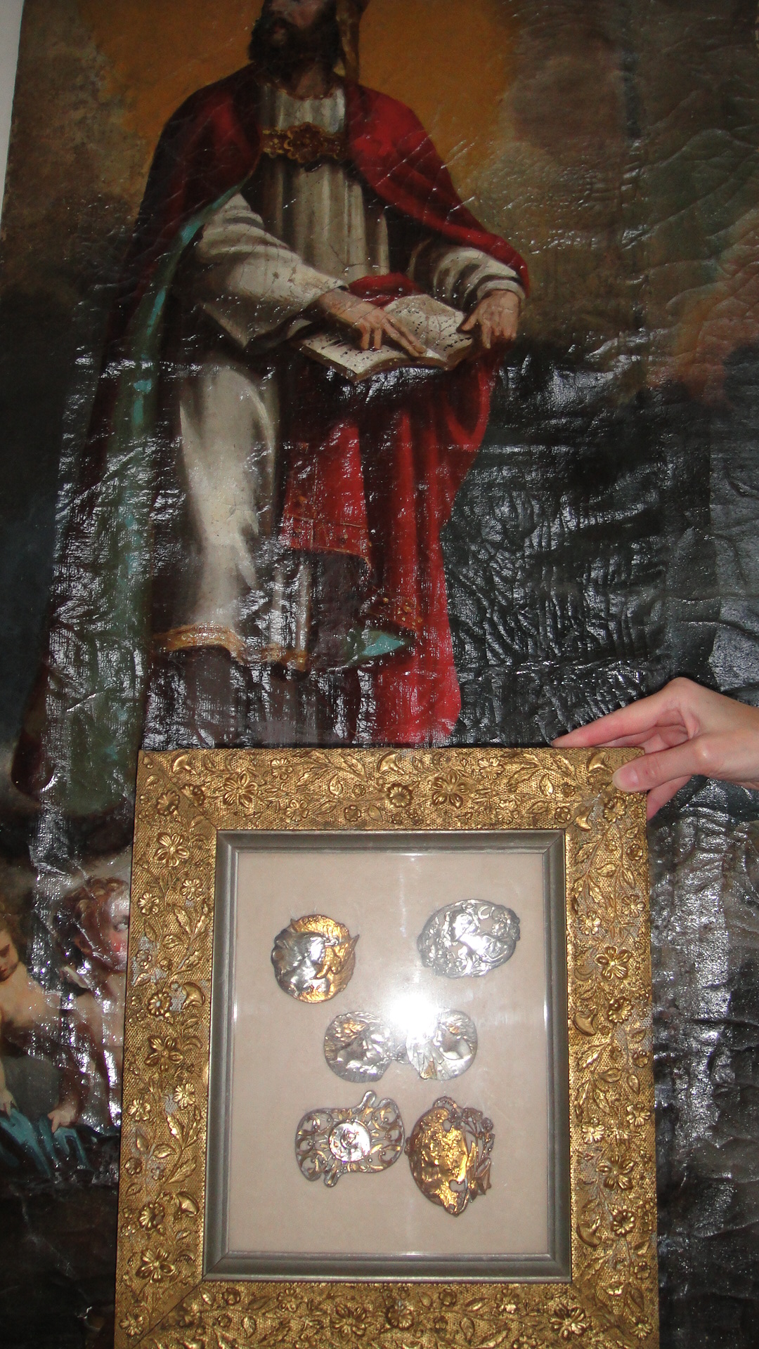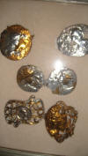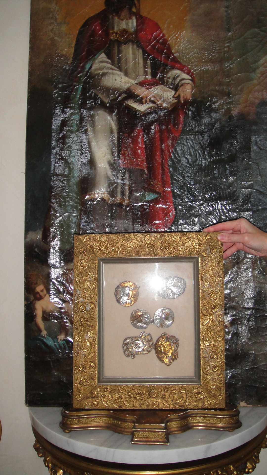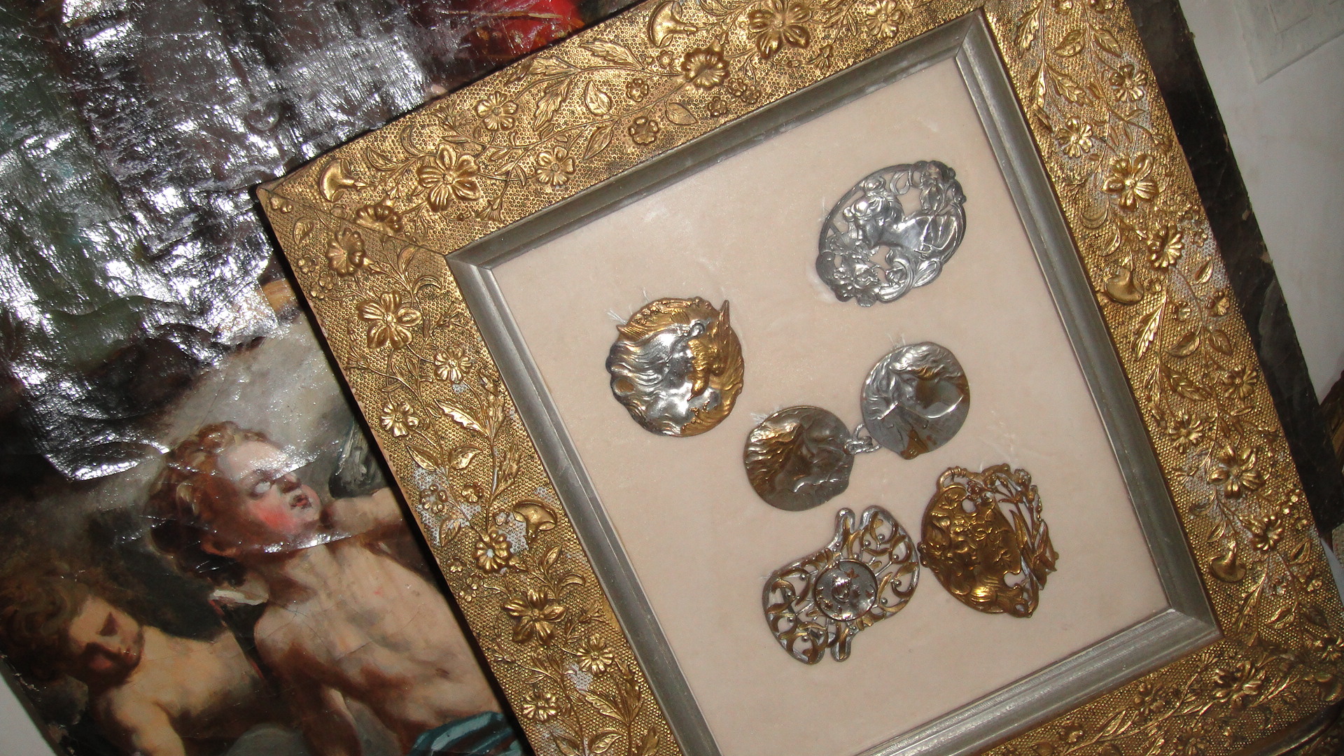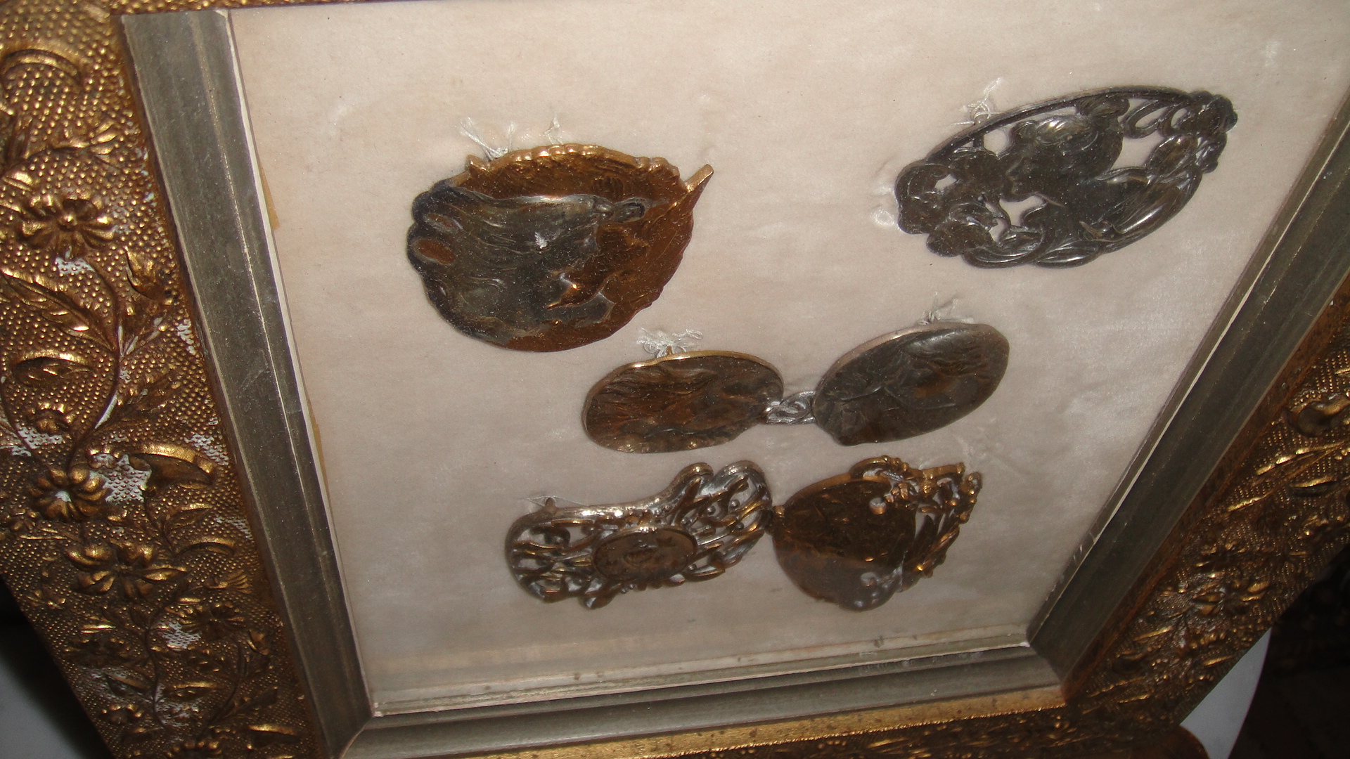 The famous Cleo de Merode circa 1900 Original Belt Buckles framed behind glass in a carved gold wood frame. You will notice this name appears behind the gold frame written on paper along with information attached as well and if you notice also, the tape is very old. Upon looking up her history which is much about her entire life I will briefly explain in my own words some of the information and if you care to you may read much more about her on your own research. Cléo de Mérode was French and she was popular due to her dancing in addition to her beauty. It is said also that many post cards and other paper work was made having her photo placed upon them due to this beauty of hers.