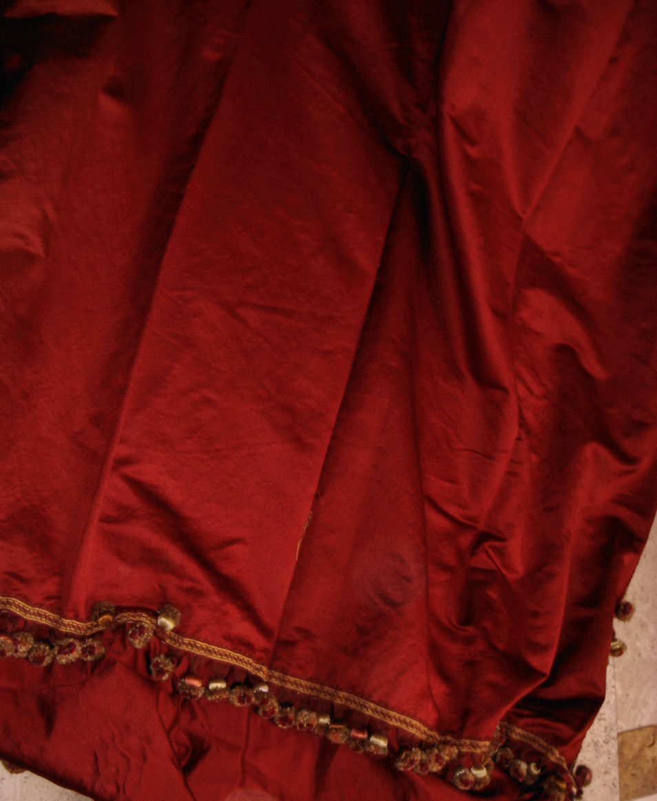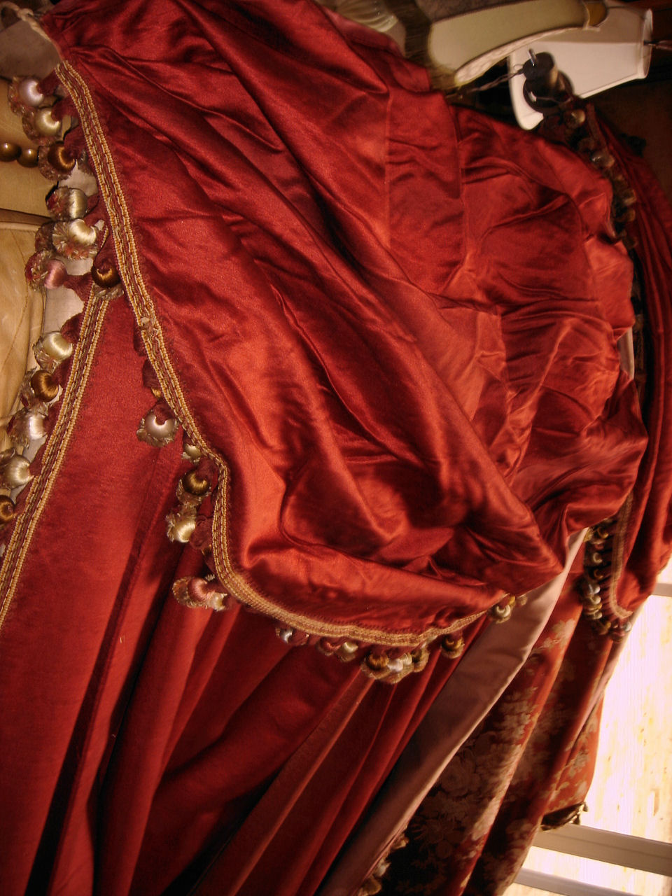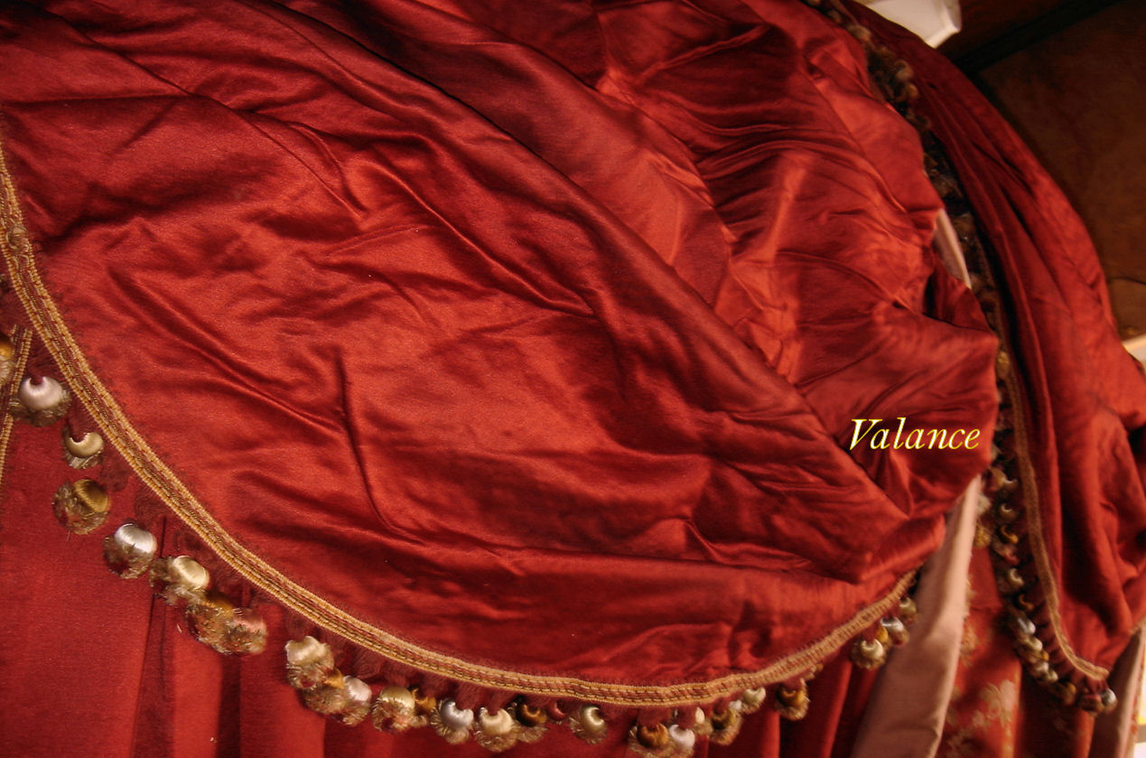 #. 45.. French Antique Gorgeous Silk Poppy colors similar to paprika color drapes with 10 Valances- stunning rich color of reddish orange enhanced with beautiful French antique trim. Stunning in color & coming from French Chateau==Outstanding silk with fabulous French Drop Ball Wood & Silk Trimmings. The trimmings are exquisite on this set and very rare to find so many on one set yet being so old. The French trimmings make a outstanding and rich appearance in this entire set. This is a Huge Antique French Set of Drapes with many valances and difficult to find being this large of a set. The antique French Trimmings on these are exquisite... The fabric is very rich in appearance also. The silk is higher quality French Antique Silk.. The huge sets are extremely rare to come by....