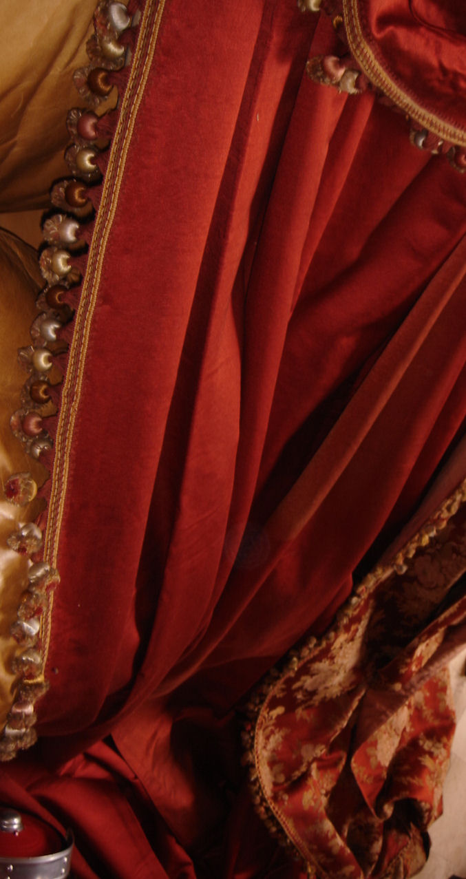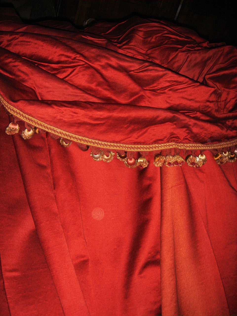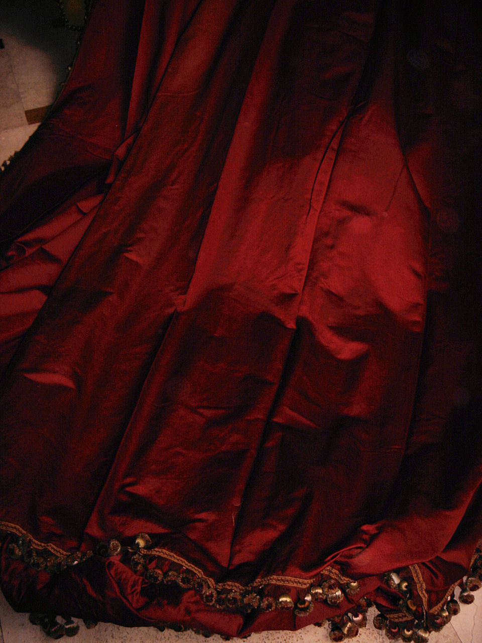 #. 45.. French Antique Gorgeous Silk Poppy colors similar to paprika color drapes with 10 Valances- stunning rich color of reddish orange enhanced with beautiful French antique trim. Stunning in color & coming from French Chateau==Outstanding silk with fabulous French Drop Ball Wood & Silk Trimmings. The trimmings are exquisite on this set and very rare to find so many on one set yet being so old. The French trimmings make a outstanding and rich appearance in this entire set. This is a Huge Antique French Set of Drapes with many valances and difficult to find being this large of a set. The antique French Trimmings on these are exquisite... The fabric is very rich in appearance also. The silk is higher quality French Antique Silk.. The huge sets are extremely rare to come by....