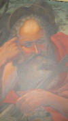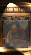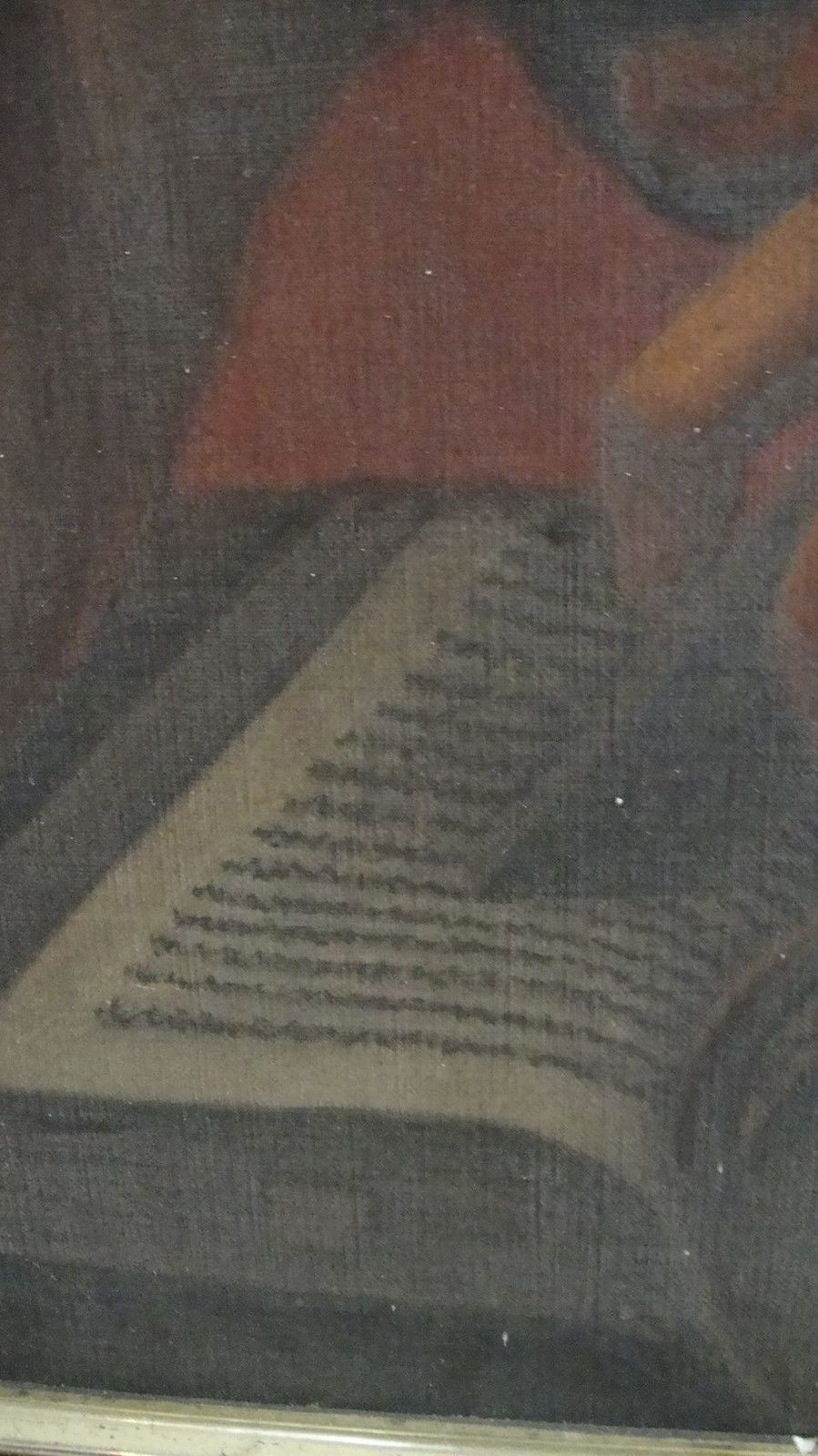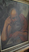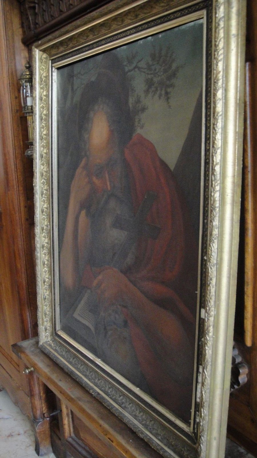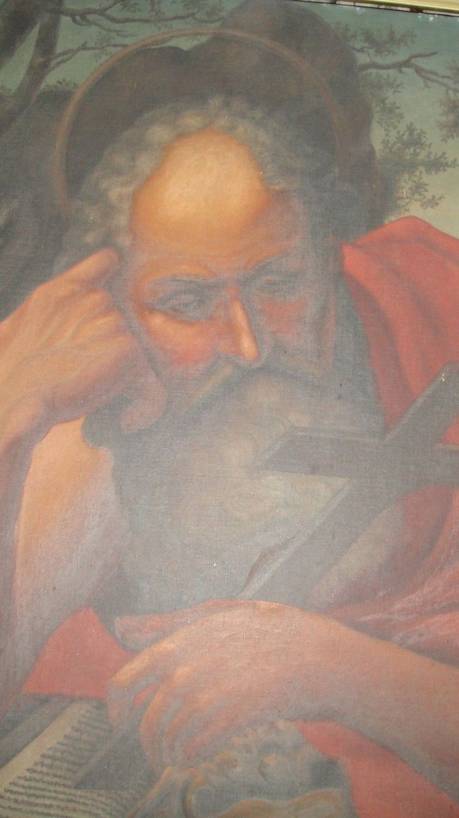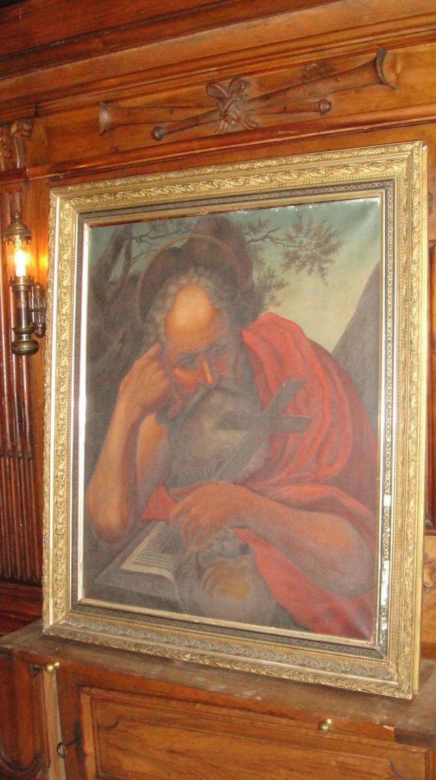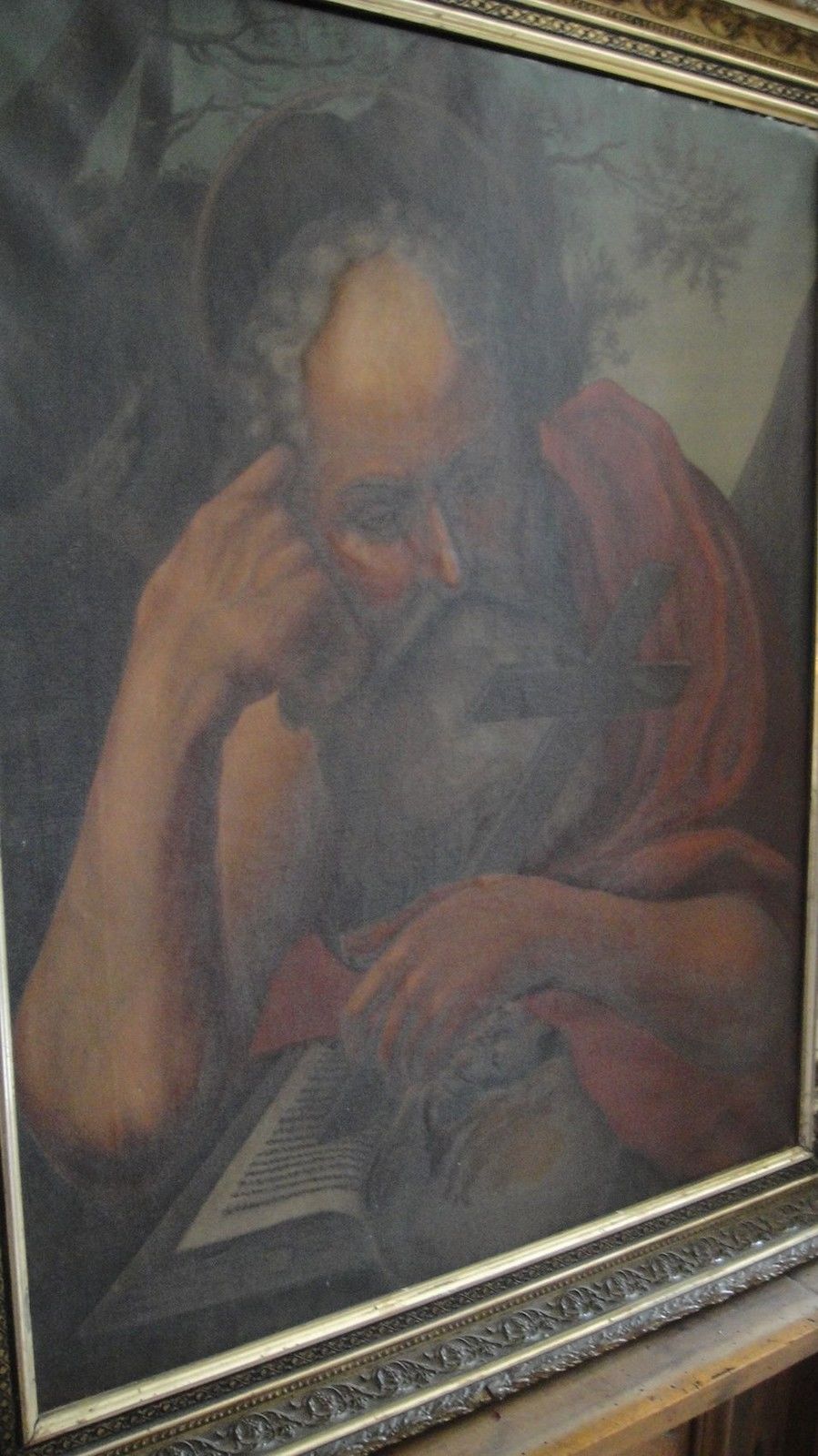 St.Paul/Pg.Oils. Antique French Saint / St. Paul Oil on Canvas. Gorgeous Workmanship on this Antique French Saint / St. Paul having his long beard and reading a book displayed below him. In addition, there is a skull beneath his left arm and a cross coming out of his left hand. A tree with branches are in the background and a the wonderful warmth of a halo over his head. Circa late 1880's. PLEASE NOTE; My Frame does NOT... come with this Antique Oil... I only set it in so you can view the beauty of it inside a frame... however, my frame DOES NOT come with this. You must purchase your own frame.