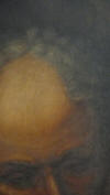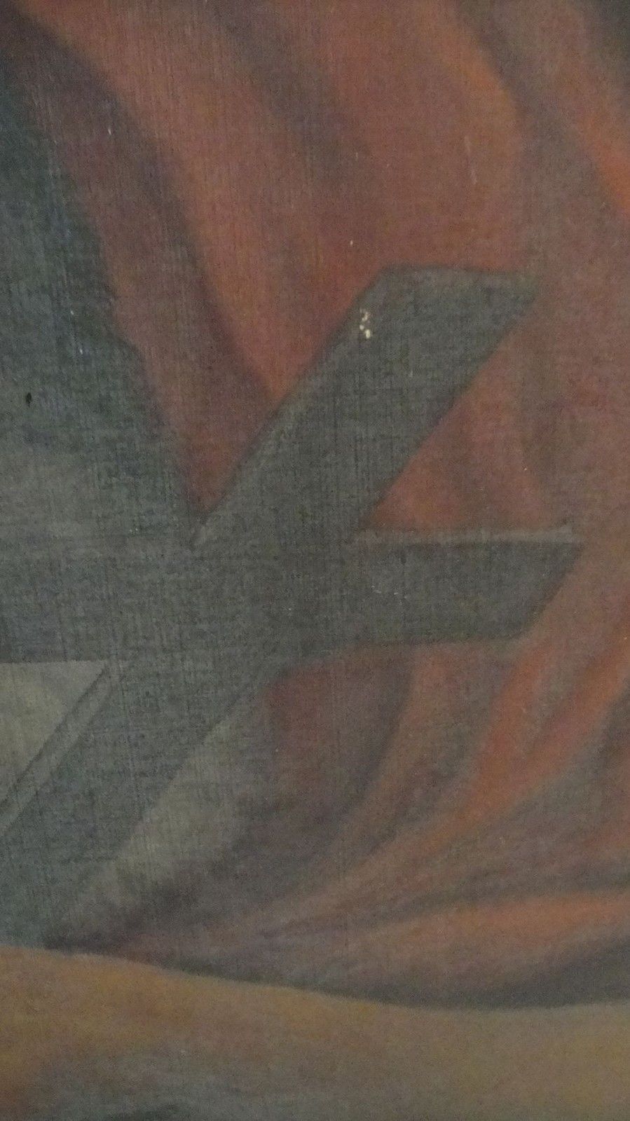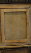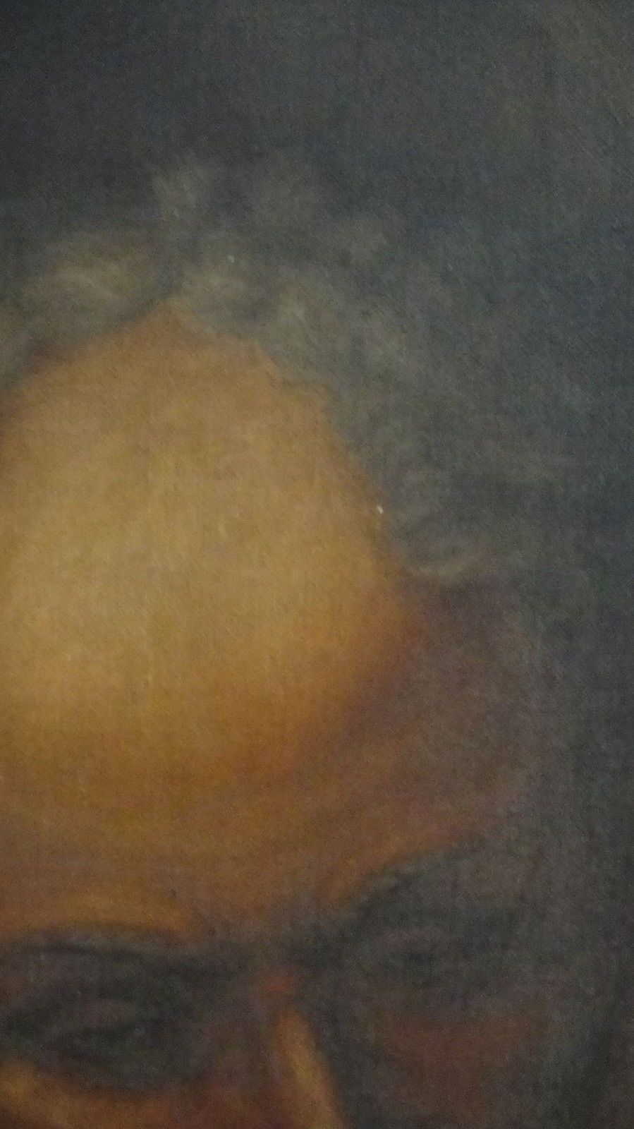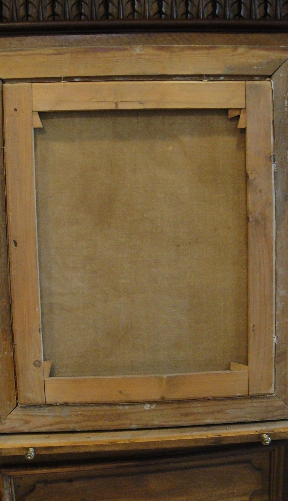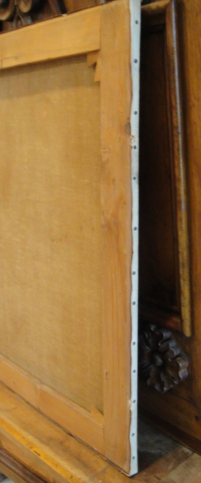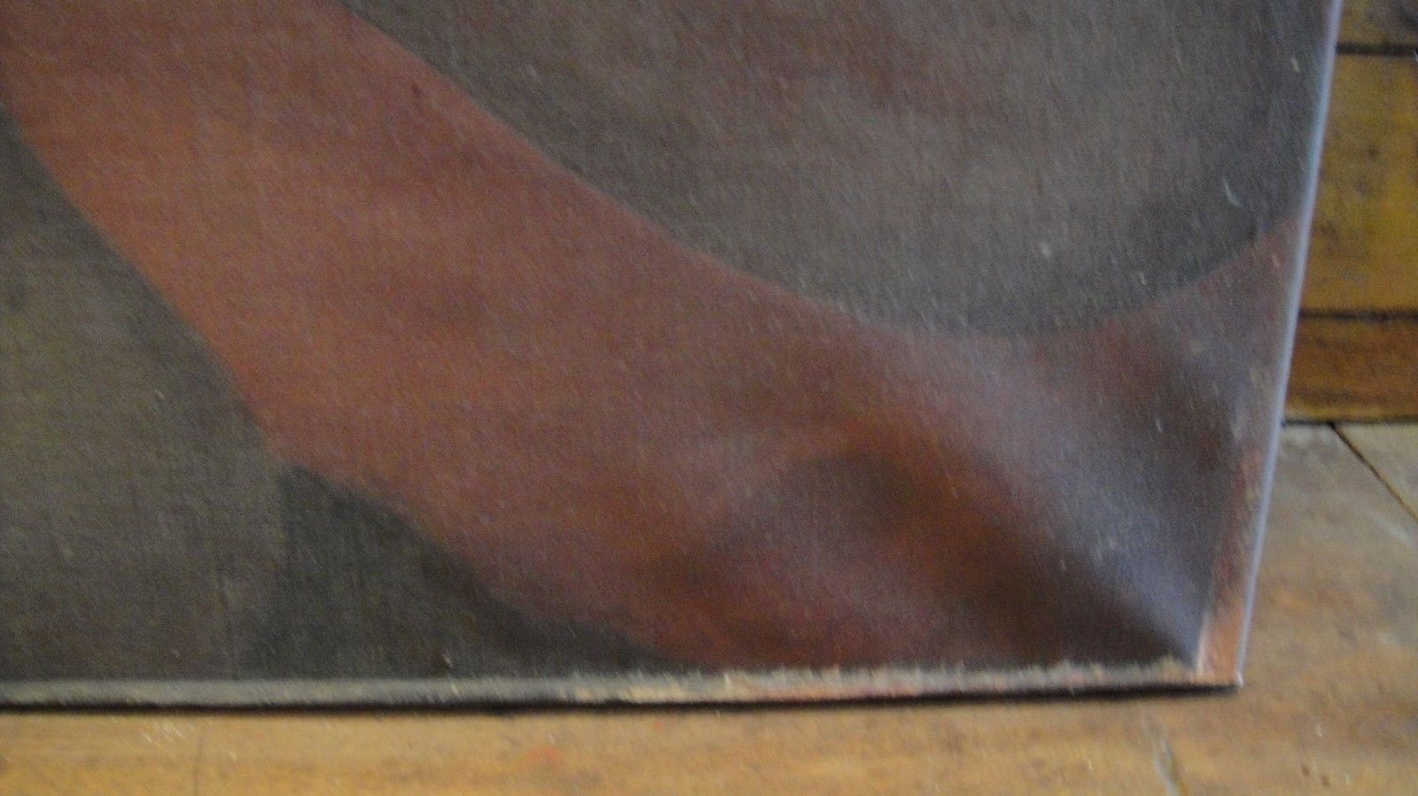 Notice the backside having patches where it was repaired at some time long ago and placed inside the frame with nails and some small leather pieces......Furthermore... at the lower bottom notice the wood on the frame missing in the corner...Regarding the frame: I purchased the frame separately and I am giving it Free with this Oil...