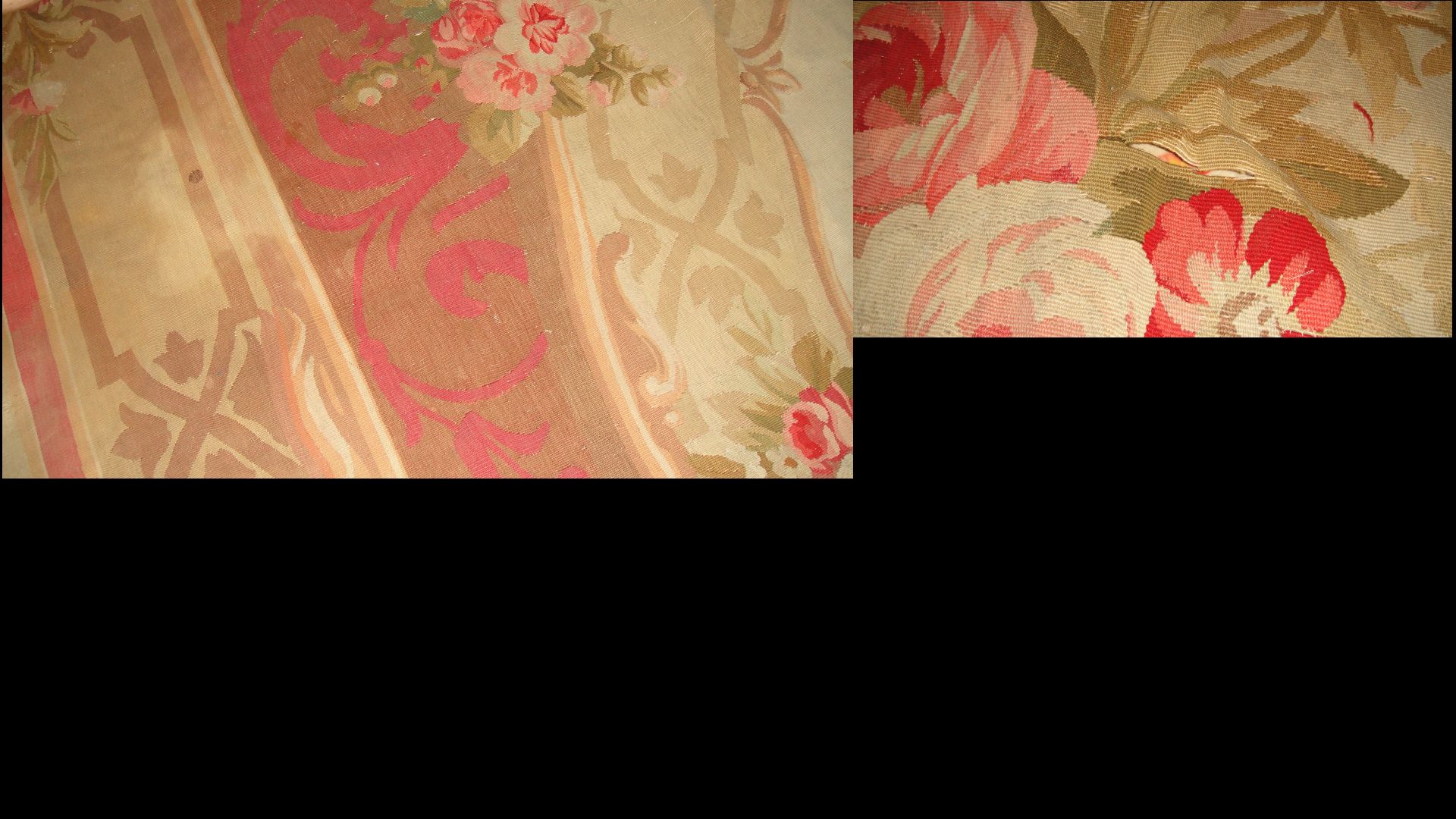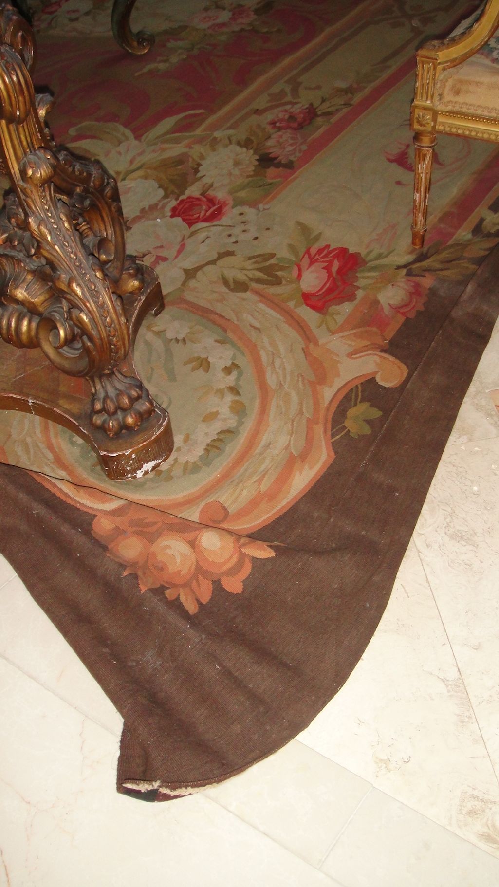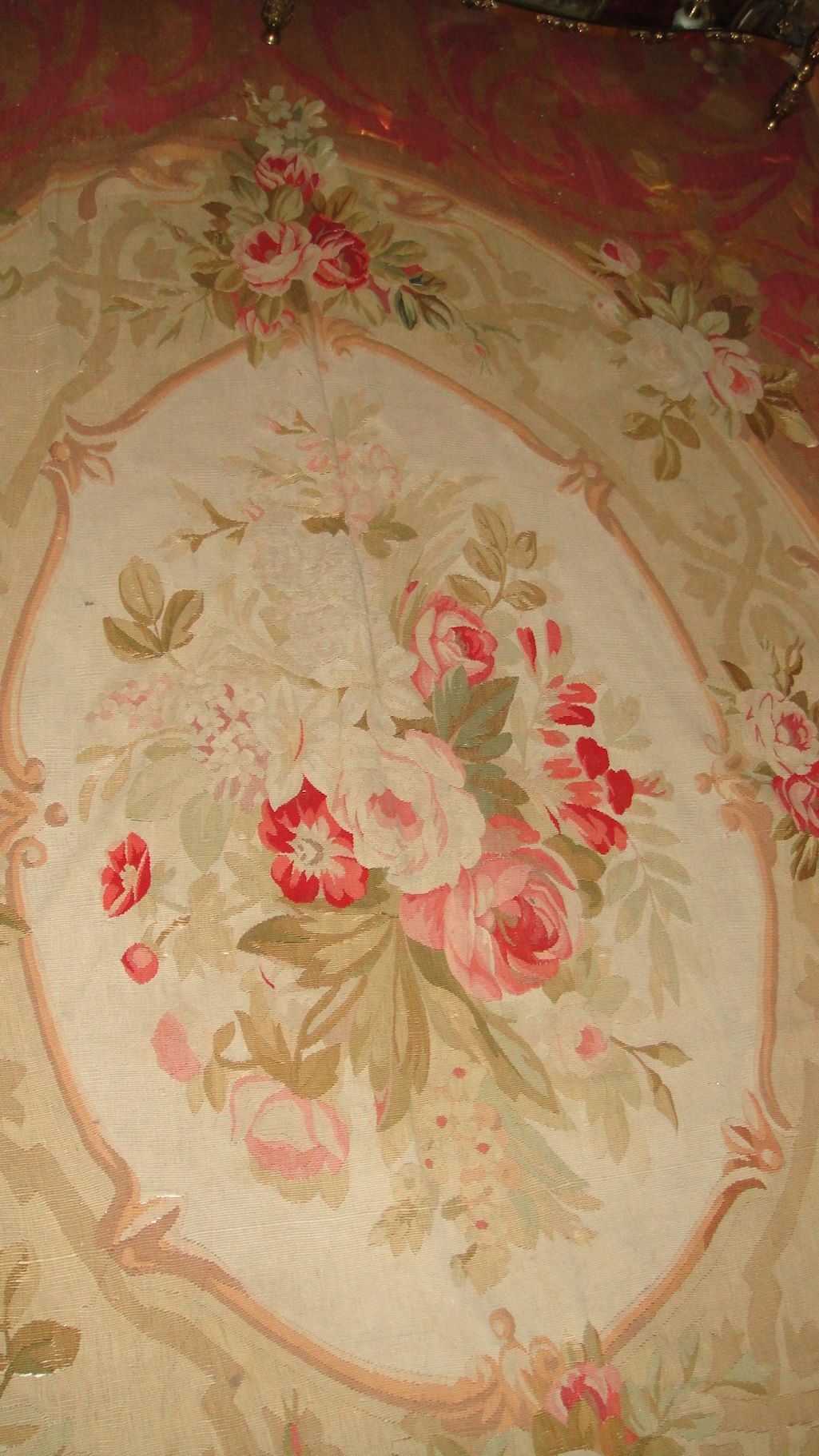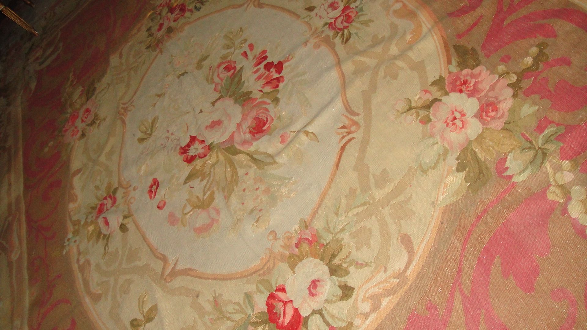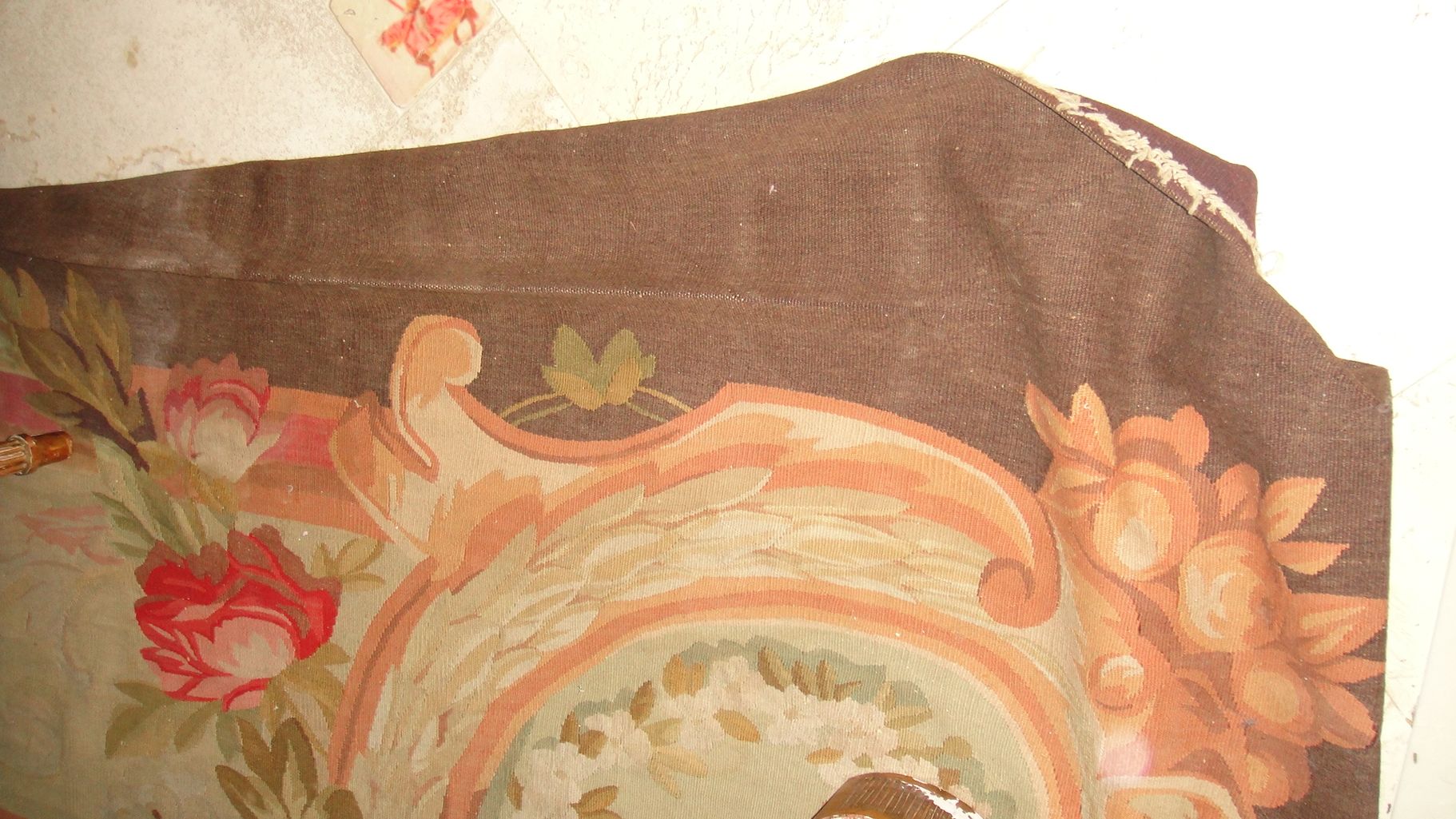 Pg.Tapestries/brown/pinkAubusson. Gorgeous Antique French Circa late 1800's very early 1900's Aubusson. This Antique French Aubusson is gorgeous and the colours remain vibrant as well. There are slits through-out however these can easily be mended by an professional. note: the slits are merely where they were weaved together and the threads have come out and this can be easily stitched back again in all these areas. There are many areas.