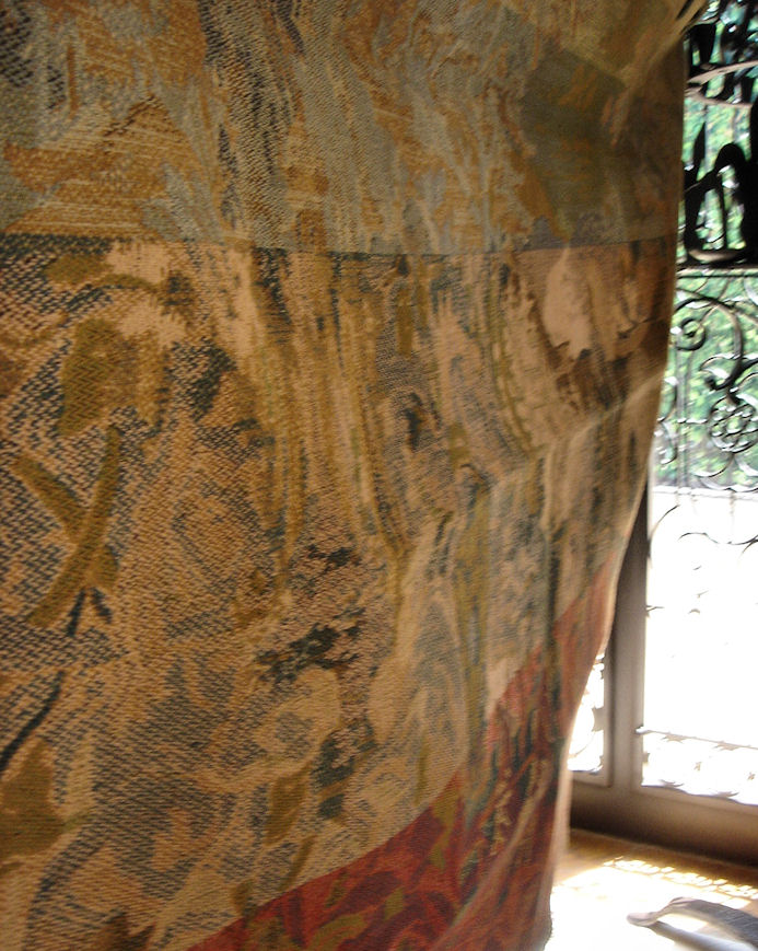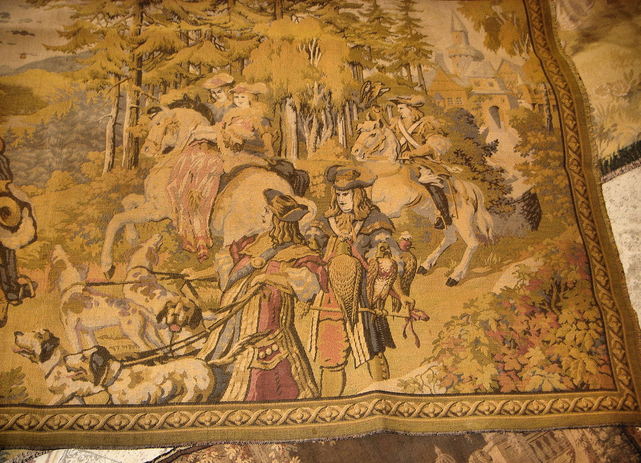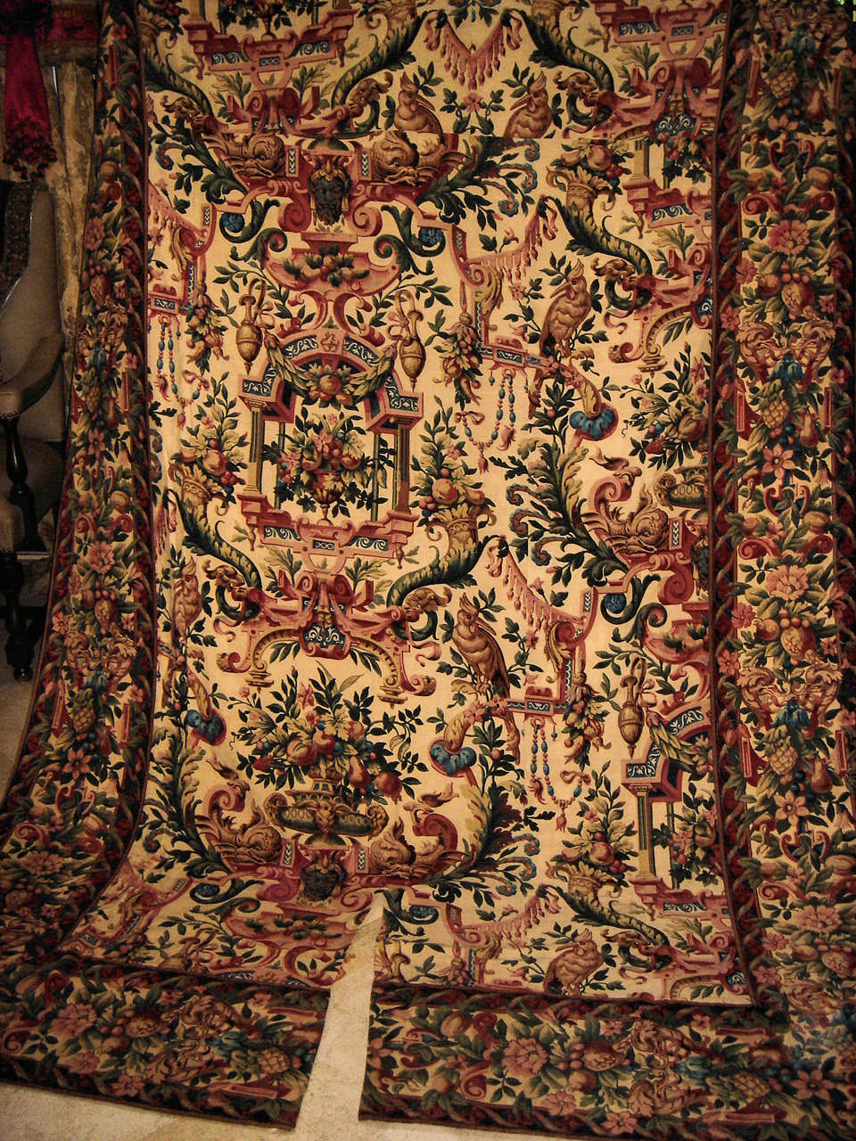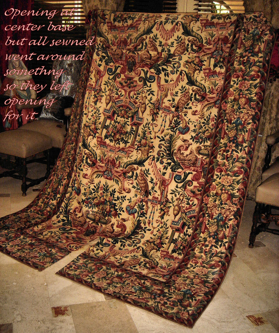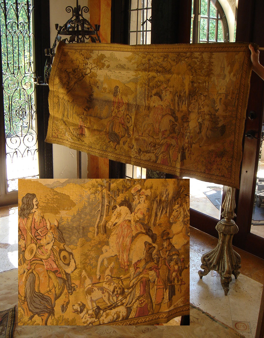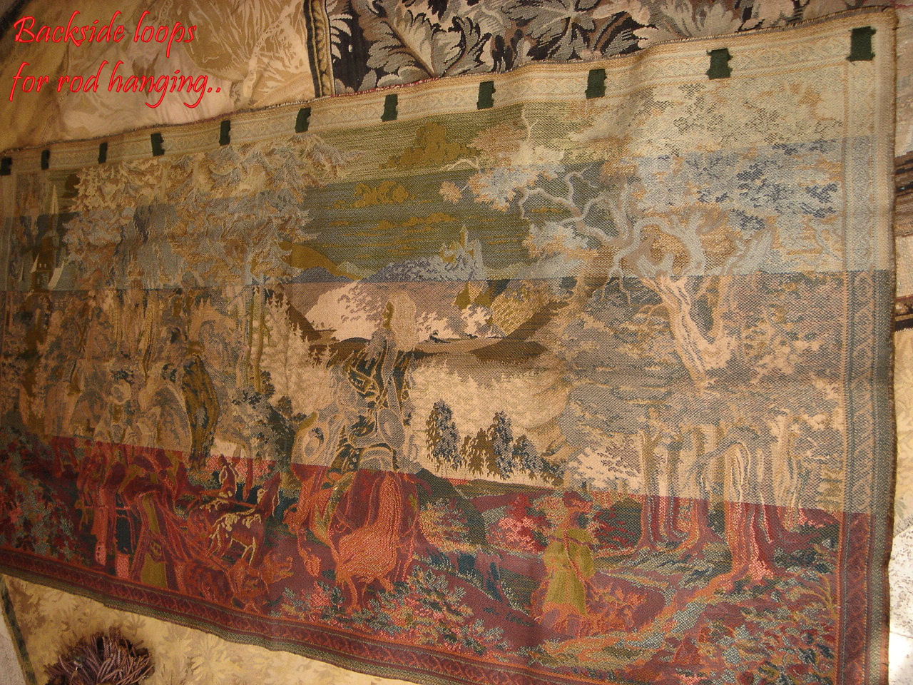 1. Hand Painted Antique Tapestry French c. 1700's colors or rich burgundy reds, beiges, creams, greens, Stunning appearance. Opening at center base due to -- it went around something however, its all finished off beautiful. Large in size as well for Stunning appearance on your walls. Add a rod to upper and hang-- Lined at backside.. Vivid colors and of high quality. Extremely detailed throughout with long hours in the making. Unique colors were used and remain just as deep as shown.