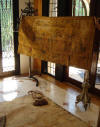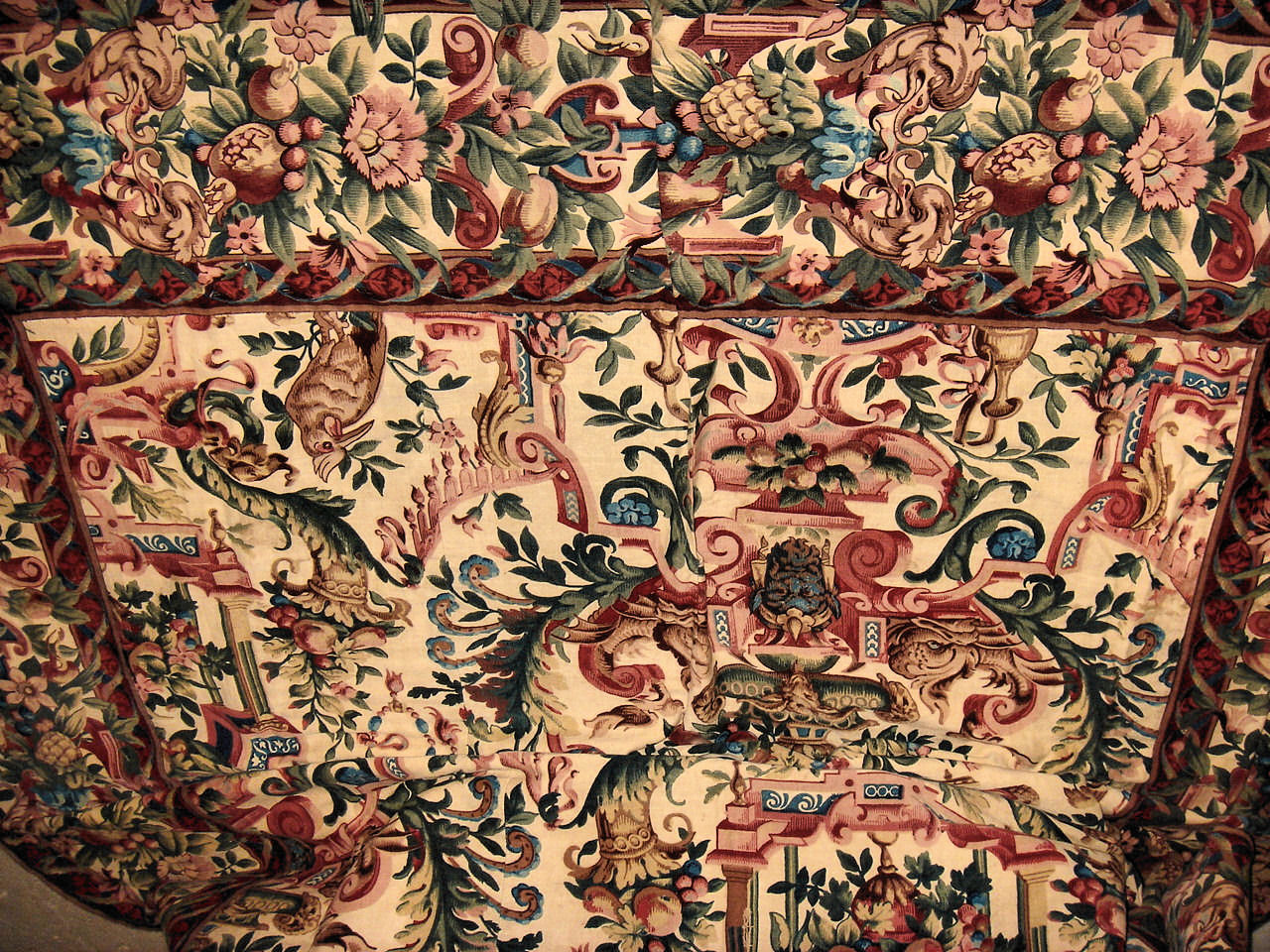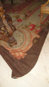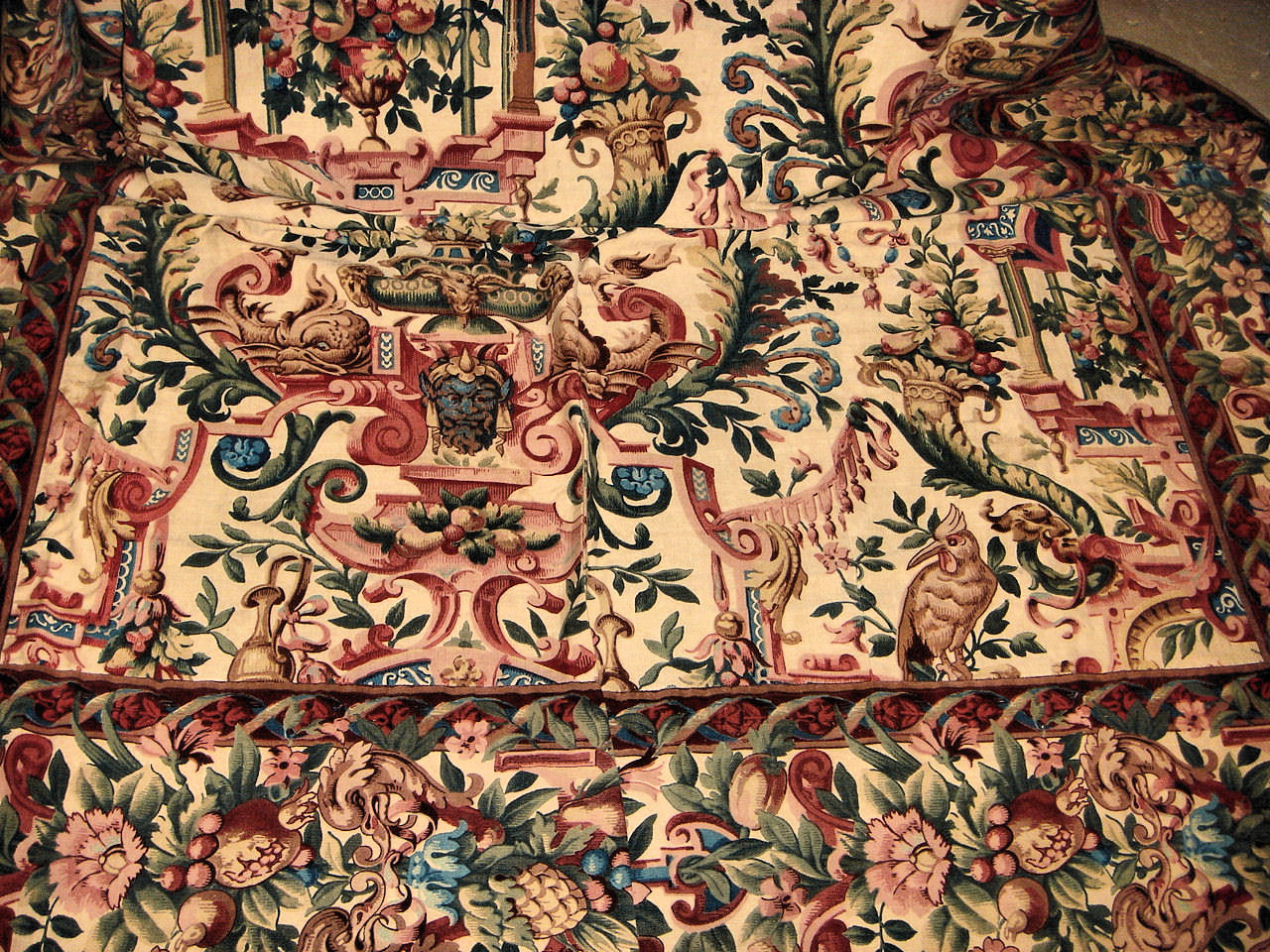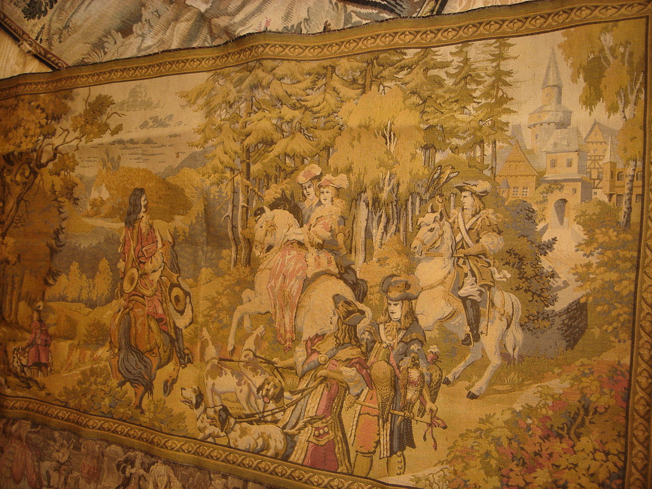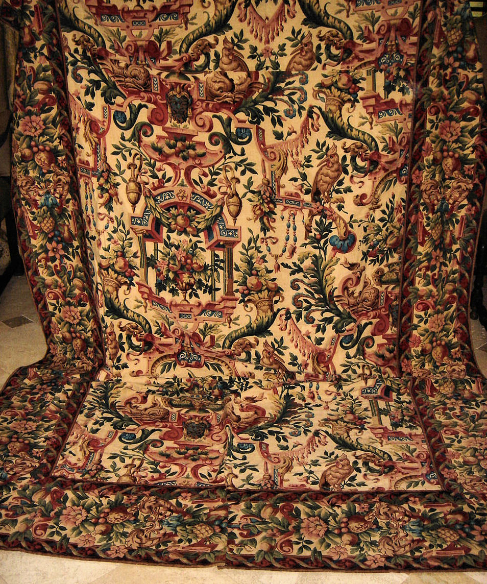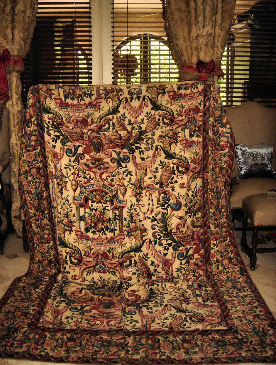 1. Hand Painted Antique Tapestry French c. 1700's colors or rich burgundy reds, beiges, creams, greens, Stunning appearance. Opening at center base due to -- it went around something however, its all finished off beautiful. Large in size as well for Stunning appearance on your walls. Add a rod to upper and hang-- Lined at backside.. Vivid colors and of high quality. Extremely detailed throughout with long hours in the making. Unique colors were used and remain just as deep as shown.