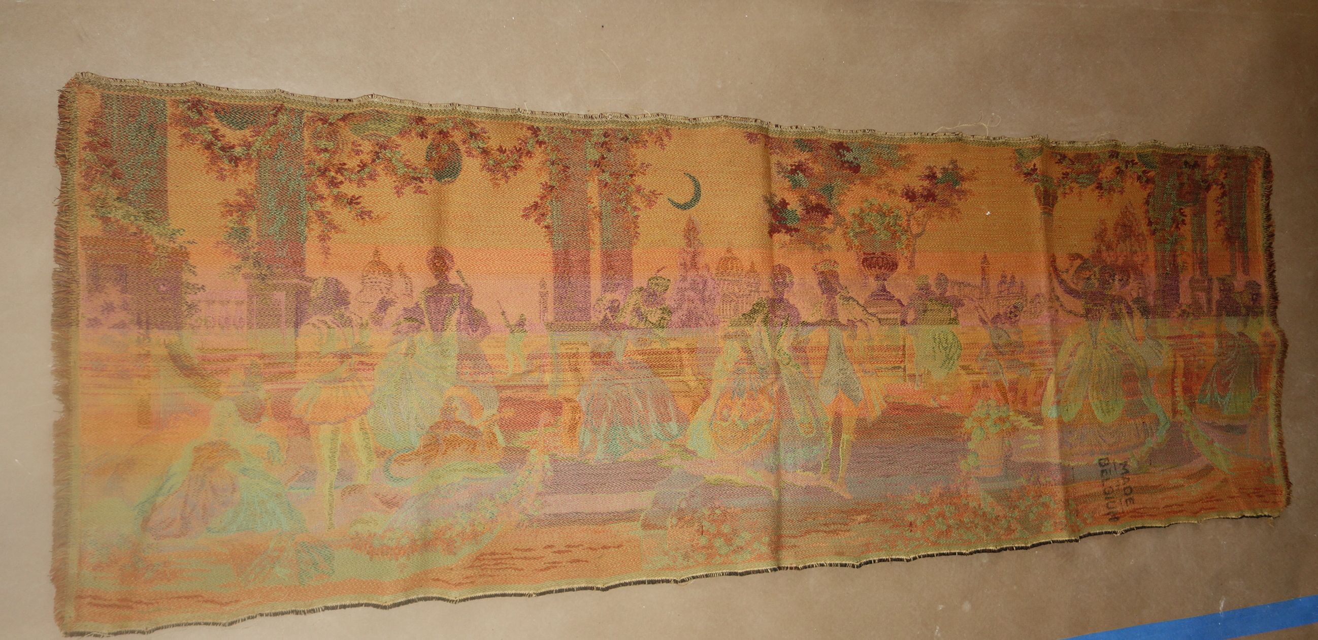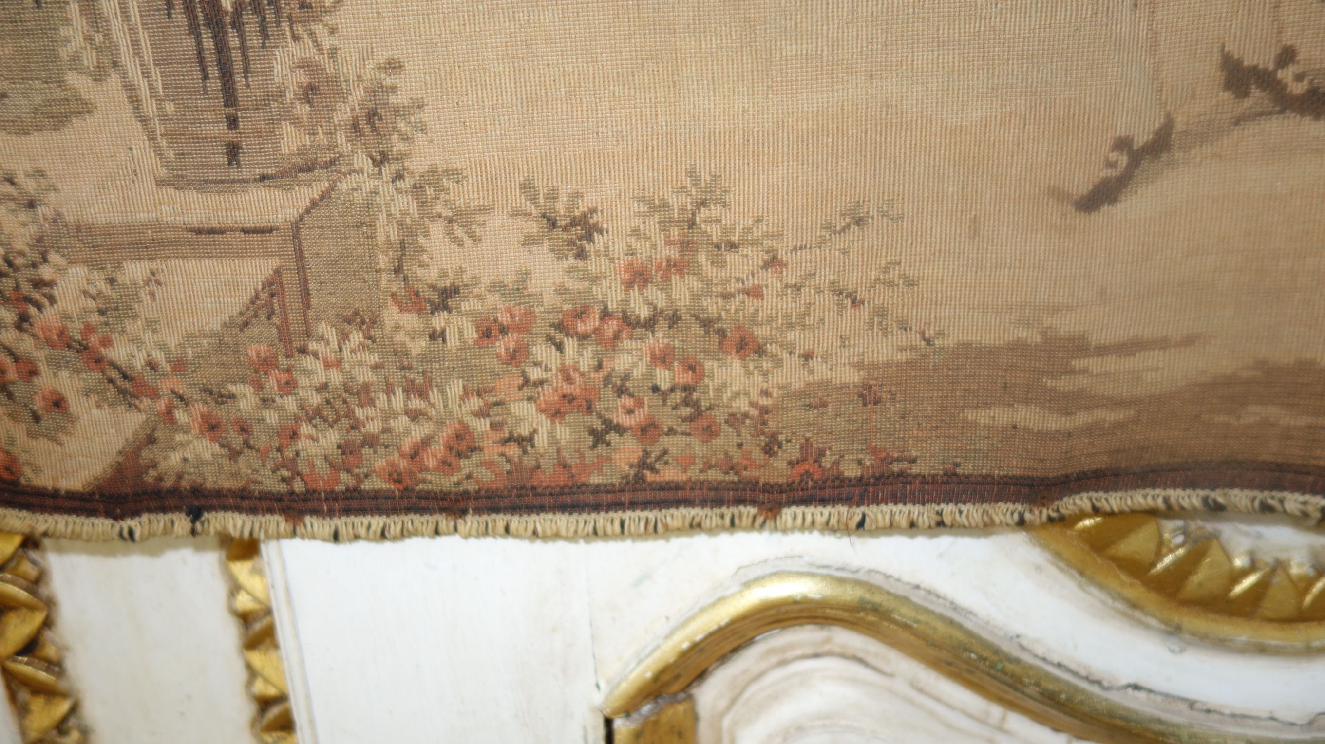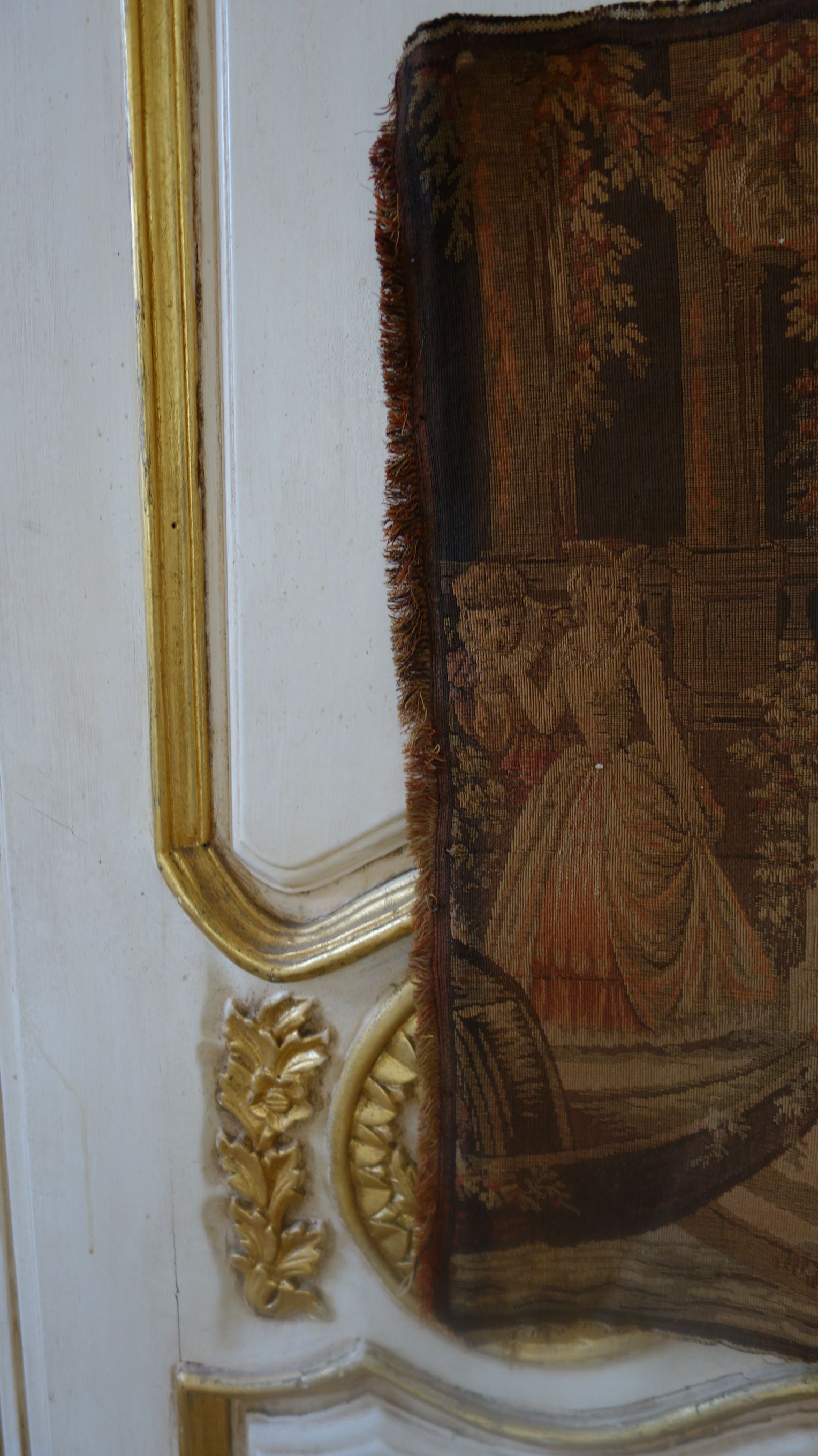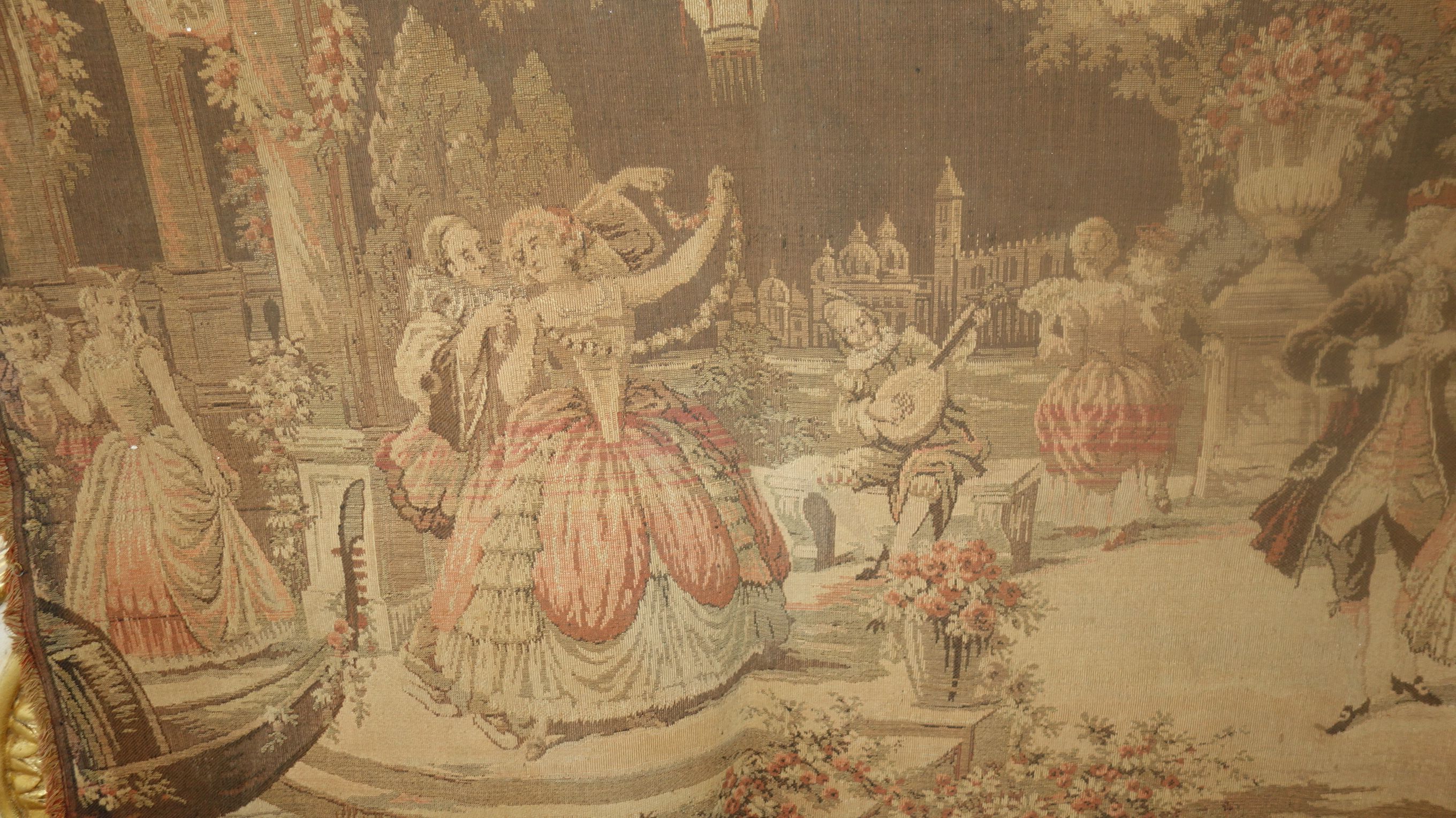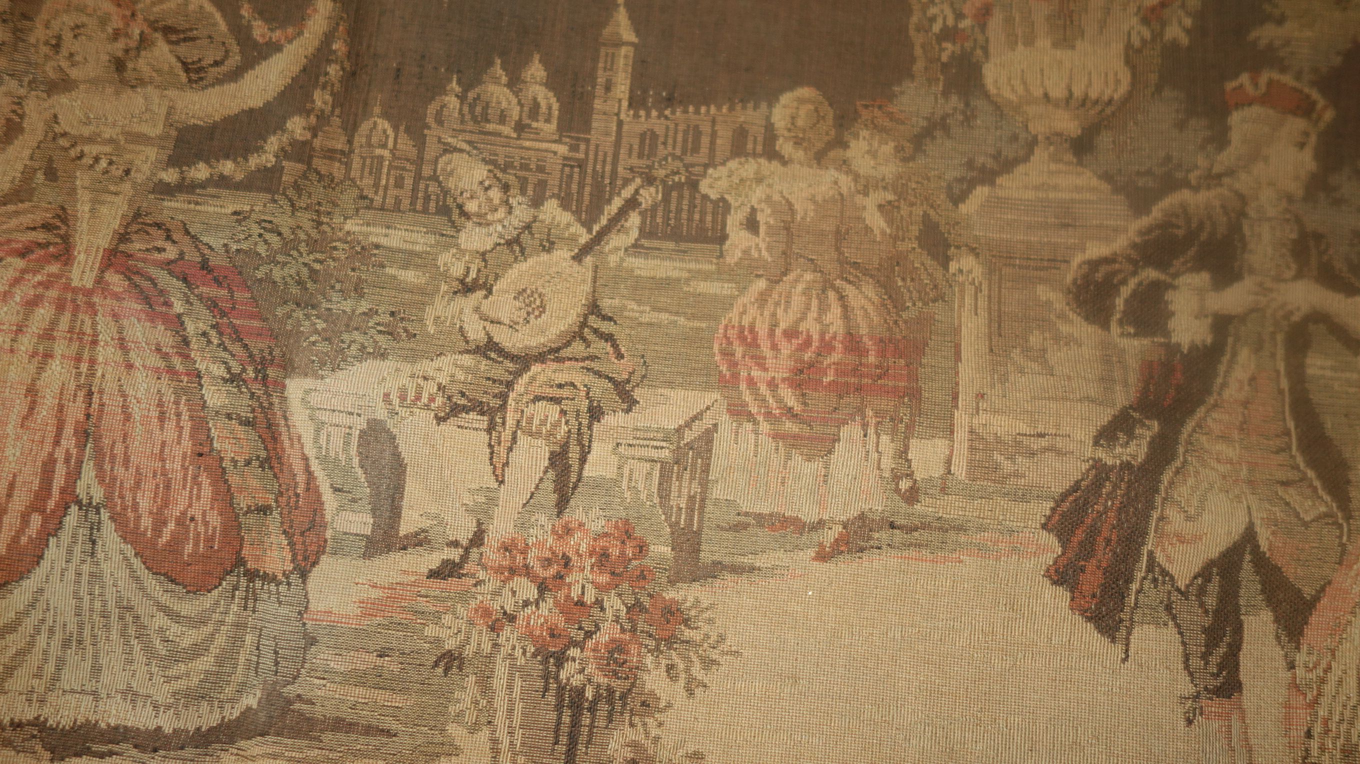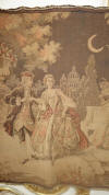 Pg.1. Antique French Tapestry. A great French Antique Tapestry filled with gorgeous figures of French males and females. It remains in beautiful condition from the past and can be either hung using your own rod and by adding/sewing small loops of anything type of fabric to the back and then slide your rod through for a beautiful accent to any wall. The colors are more muted in browns, pinks and more. Its also a great size for any where or perhaps used for a small table throw or make into a pillow--which would be magnificent being the size of this piece.