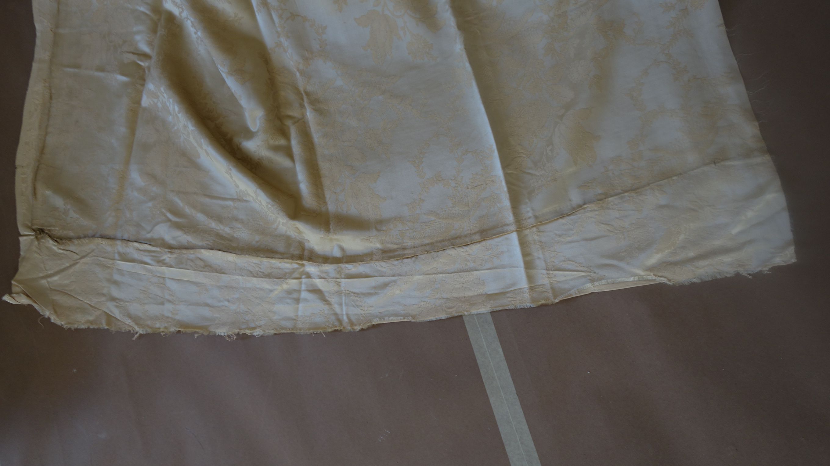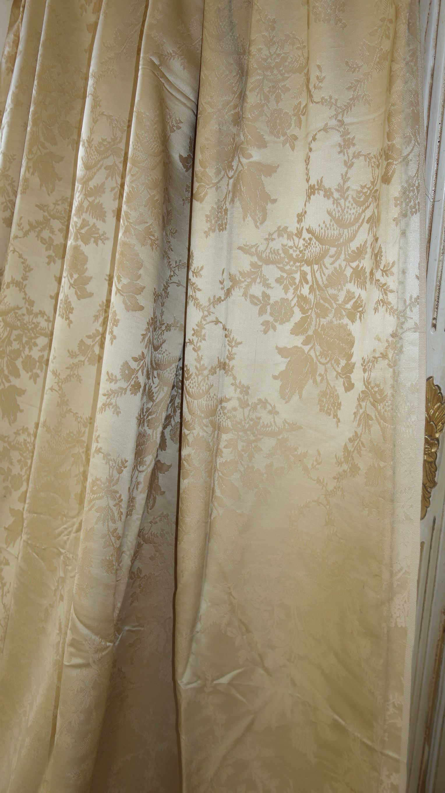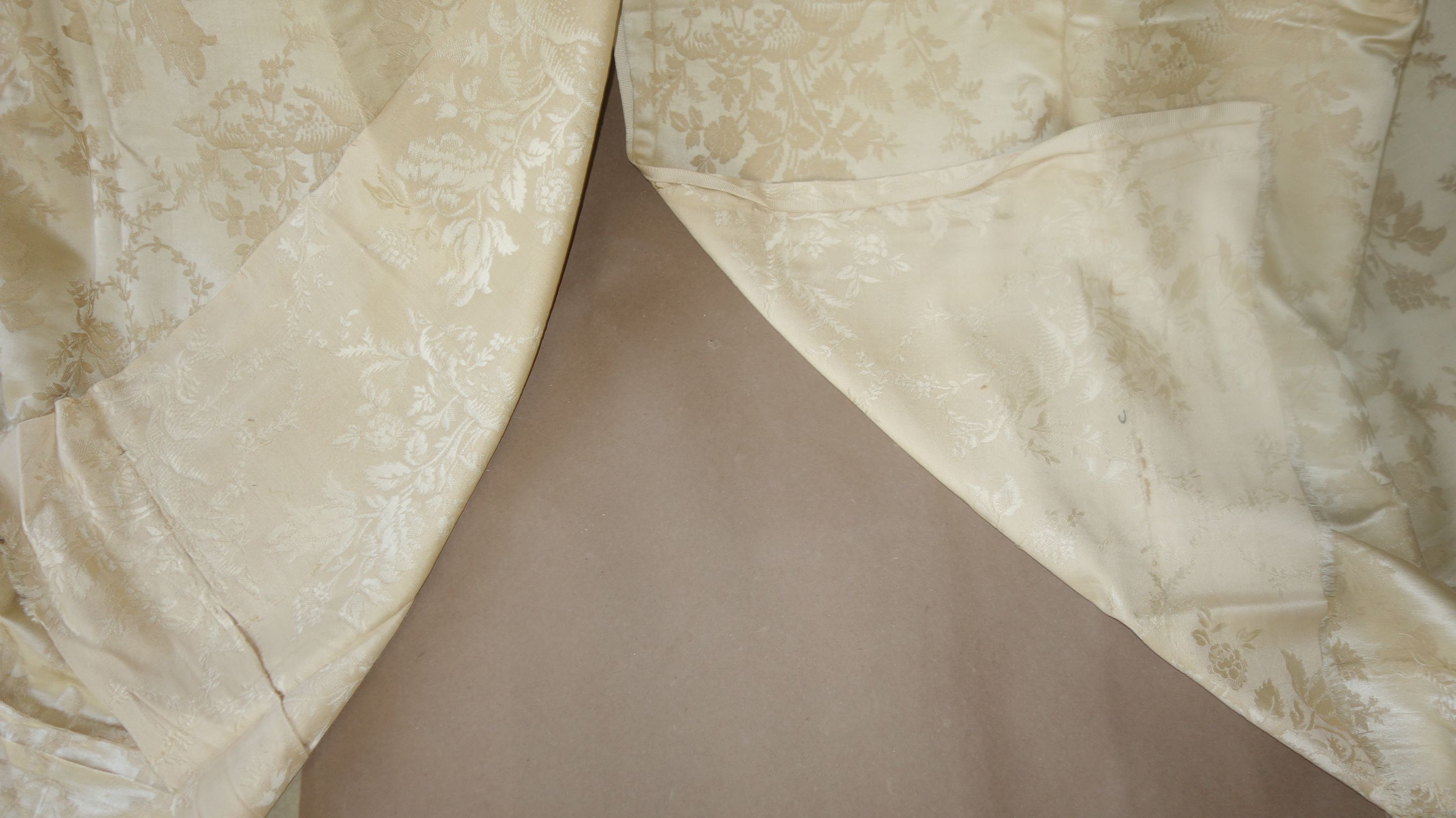 Pg2. Lovely Antique French Silk Brocade Drapes Curtains Panels Fabric. The color and motifs on this French set is gorgeous however it has some issues which are easy to mend. The uppers are straight across and if used for drapes you must add your own rings or gather yourself which is easy. The base hems are removed and where the hems were --there are tears--and soils-- however, you would have to cut this straight across to make even again or repair the holes as shown in photos. There is an addition minor tear at center upper on one of the curtains which can be easily hidden among the folds if used as drapes/curtains. The one curtain has not be cut straight (on the side going from upper to lower) as shown in photos and again would need either to add a small hem on this side or cut straight or add trimmings which would be lovely. Please see my photos as this will explain all I mentioned. There is also a stain near the hem line as shown. & one at upper top. The drapes/curtains/panels remain beautiful in appearance and would certainly adorn any piece or window. You might wish to use as fabric for a fine project. The color is cream and truly shows up magnificent as shown here when hung.