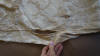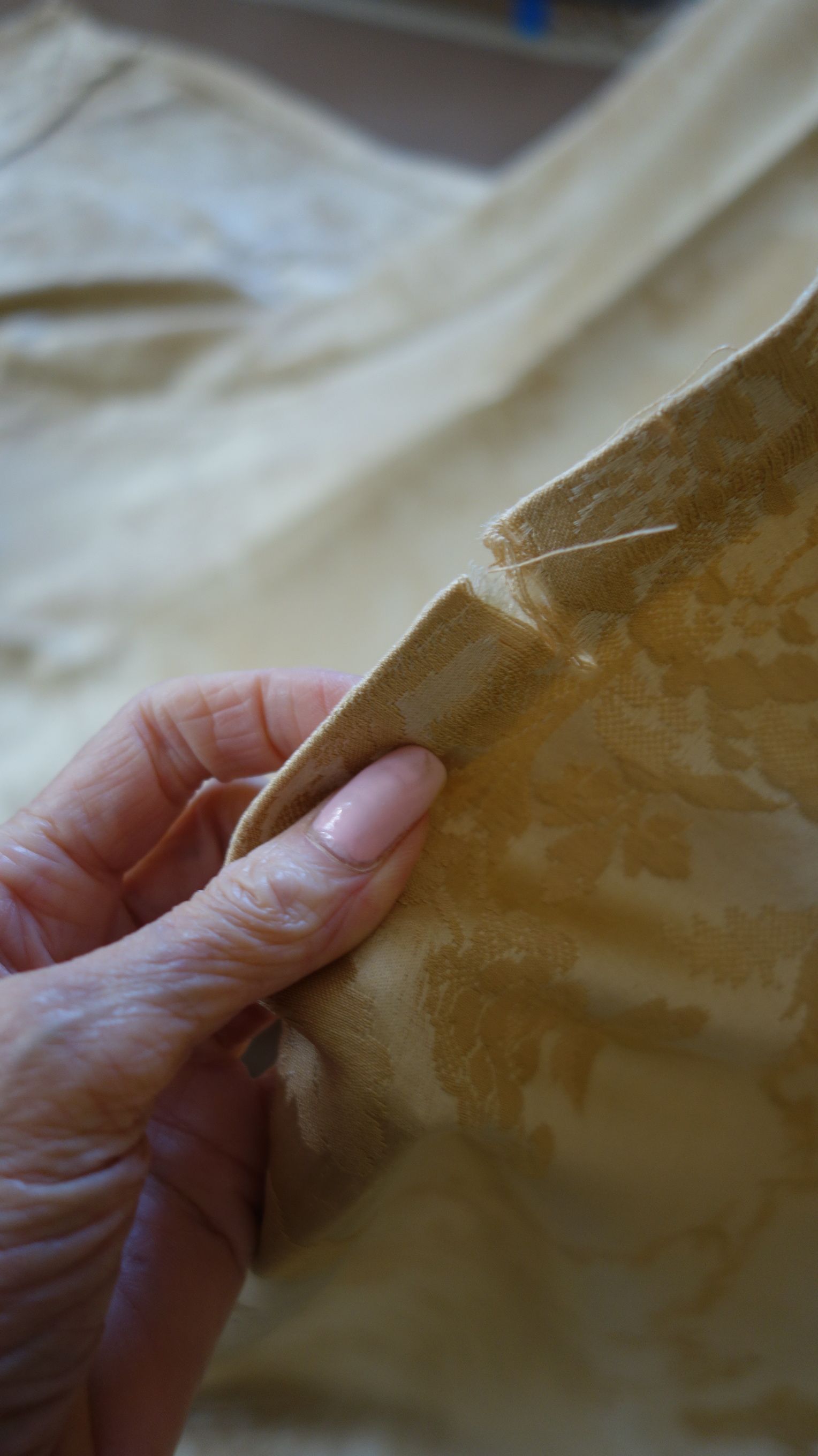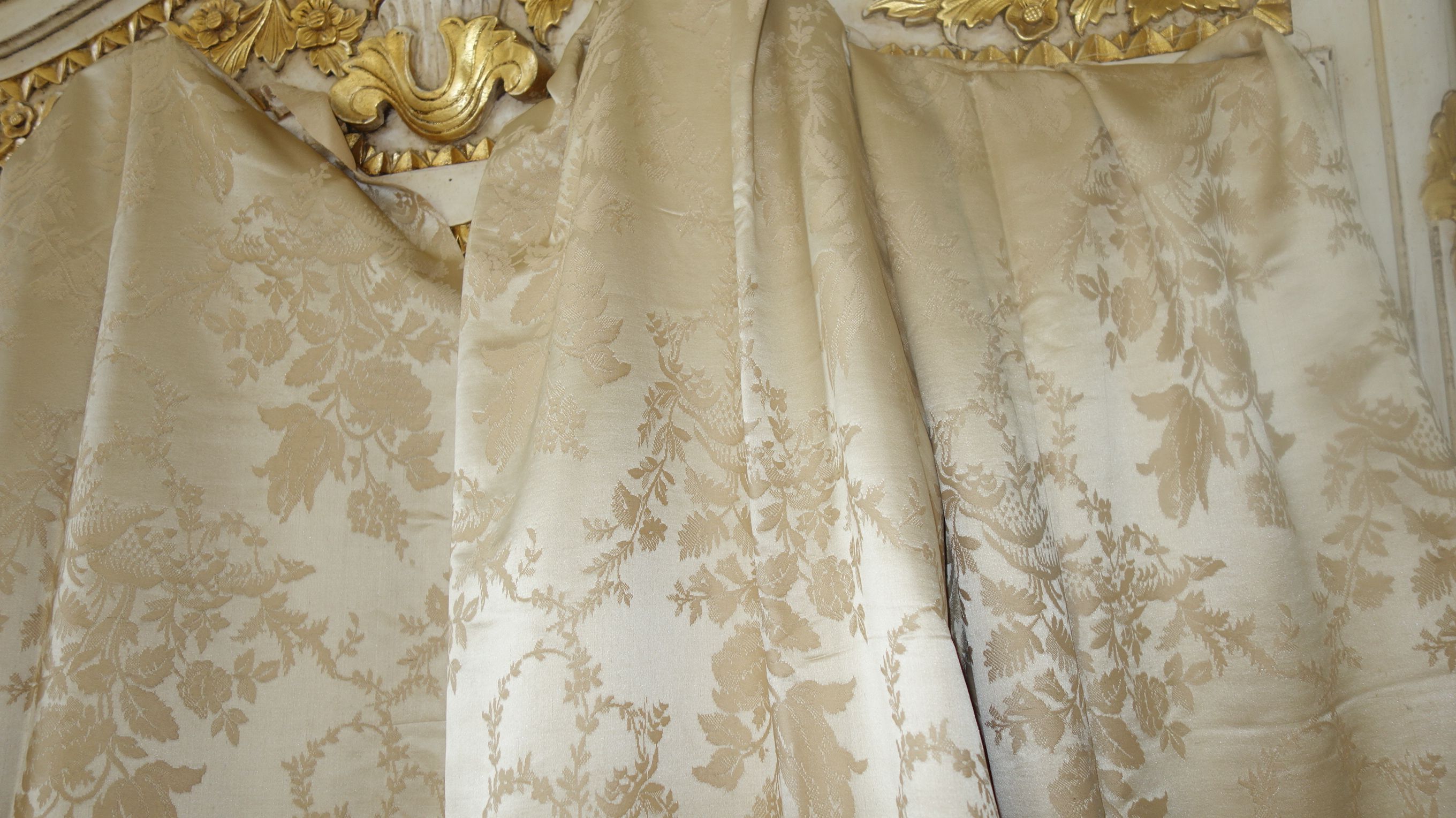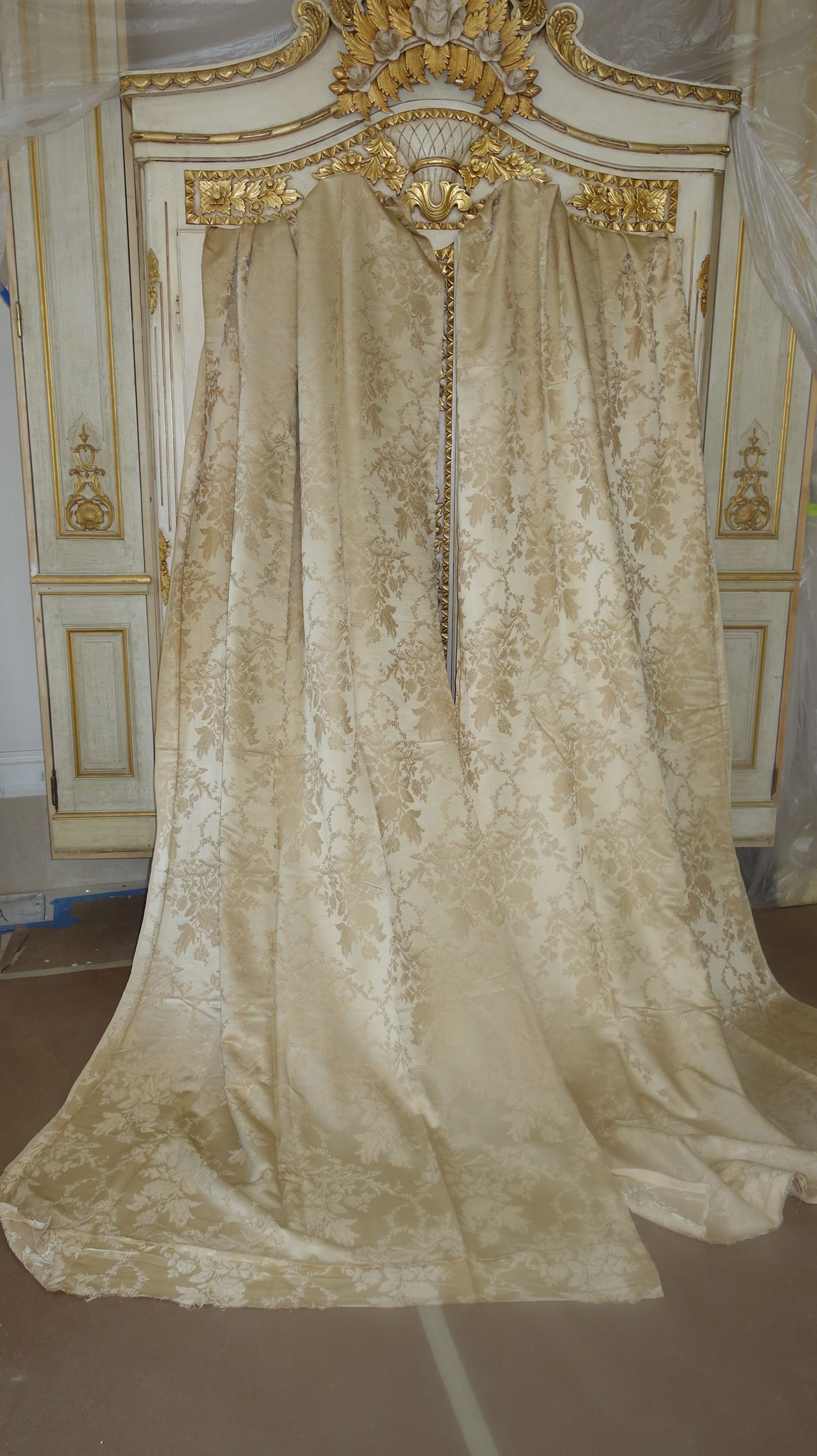 Pg2. Lovely Antique French Silk Brocade Drapes Curtains Panels Fabric. The color and motifs on this French set is gorgeous however it has some issues which are easy to mend. The uppers are straight across and if used for drapes you must add your own rings or gather yourself which is easy. The base hems are removed and where the hems were --there are tears--and soils-- however, you would have to cut this straight across to make even again or repair the holes as shown in photos. There is an addition minor tear at center upper on one of the curtains which can be easily hidden among the folds if used as drapes/curtains. The one curtain has not be cut straight (on the side going from upper to lower) as shown in photos and again would need either to add a small hem on this side or cut straight or add trimmings which would be lovely. Please see my photos as this will explain all I mentioned. There is also a stain near the hem line as shown. & one at upper top. The drapes/curtains/panels remain beautiful in appearance and would certainly adorn any piece or window. You might wish to use as fabric for a fine project. The color is cream and truly shows up magnificent as shown here when hung.