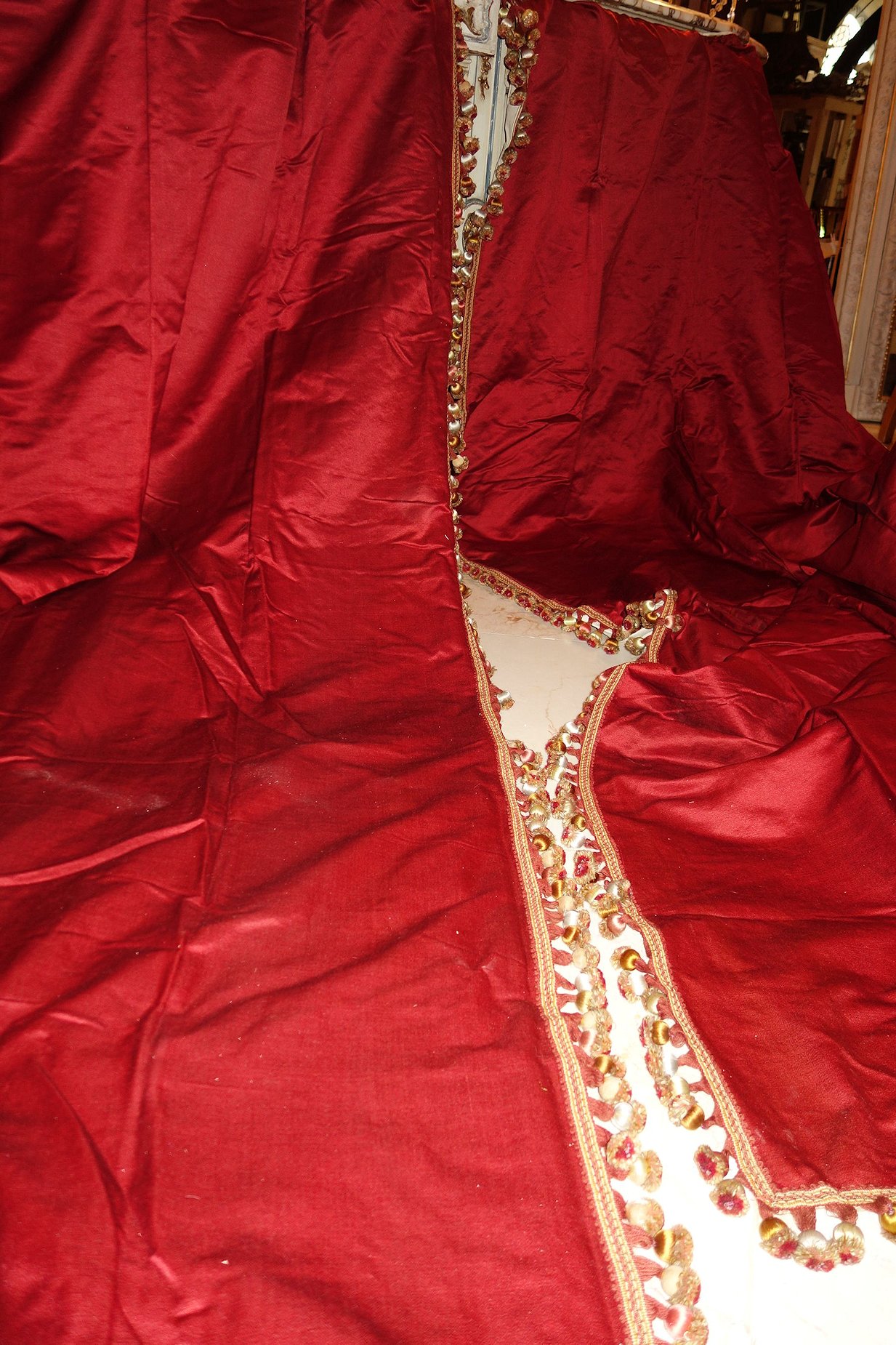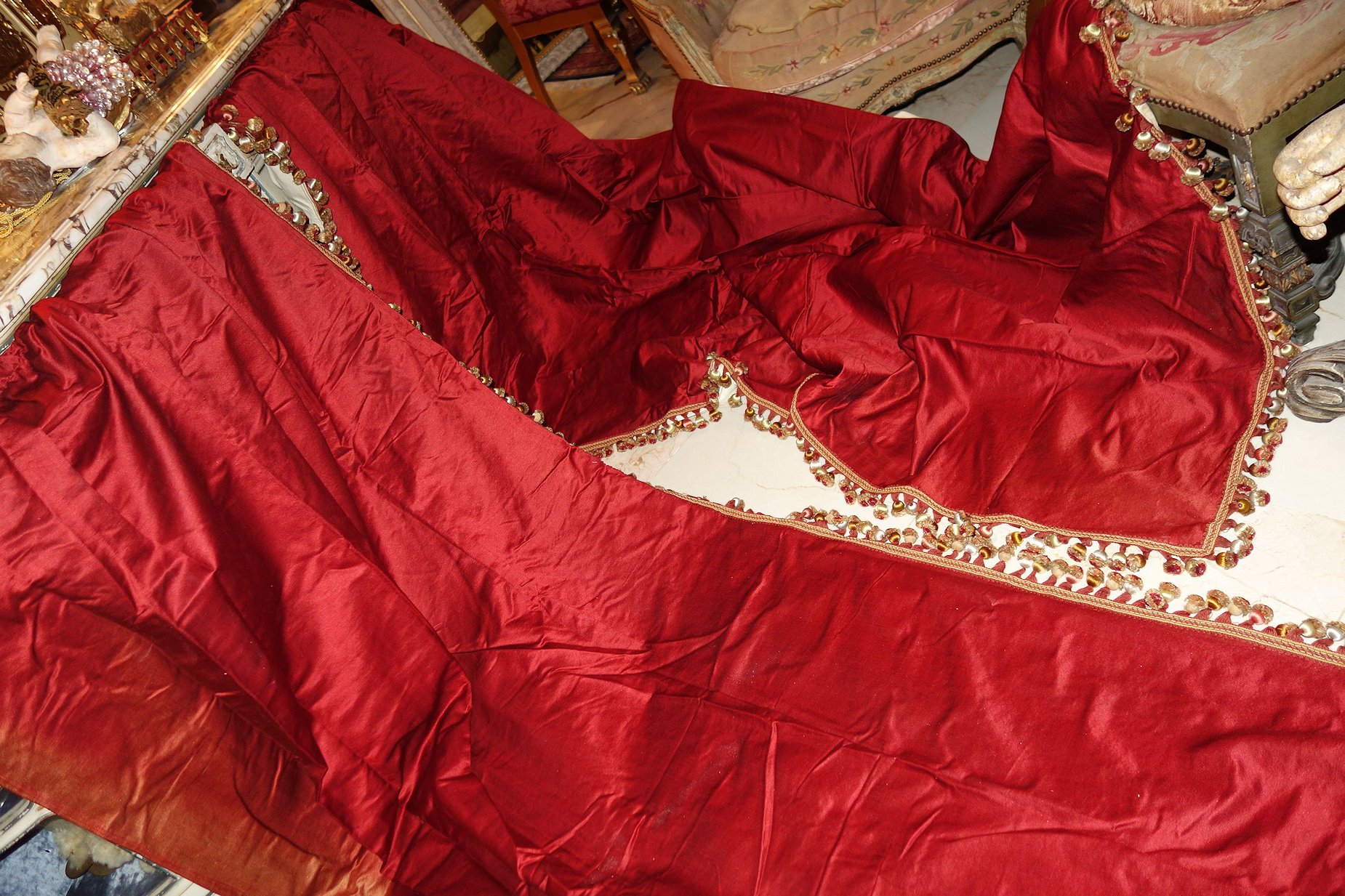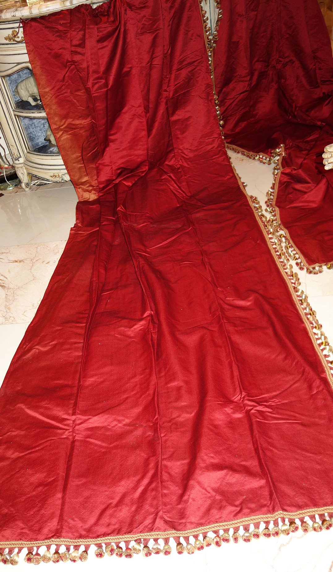 MM70/Pg5/PoppyFrenchDrapes. French Antique Gorgeous Silk Poppy color similar to paprika color drapes with matching two swags and another 2 matching narrow side panels. Stunning rich color of reddish orange from a French Chateau==Poppy/Paprika colour of silk. Note: All the ball trimmings on this set have been removed totally and this comes with no trimmings. The photos were taken prior to removal of trimmings. They remain just as beautiful and one can add your color of trimmings if you prefer.