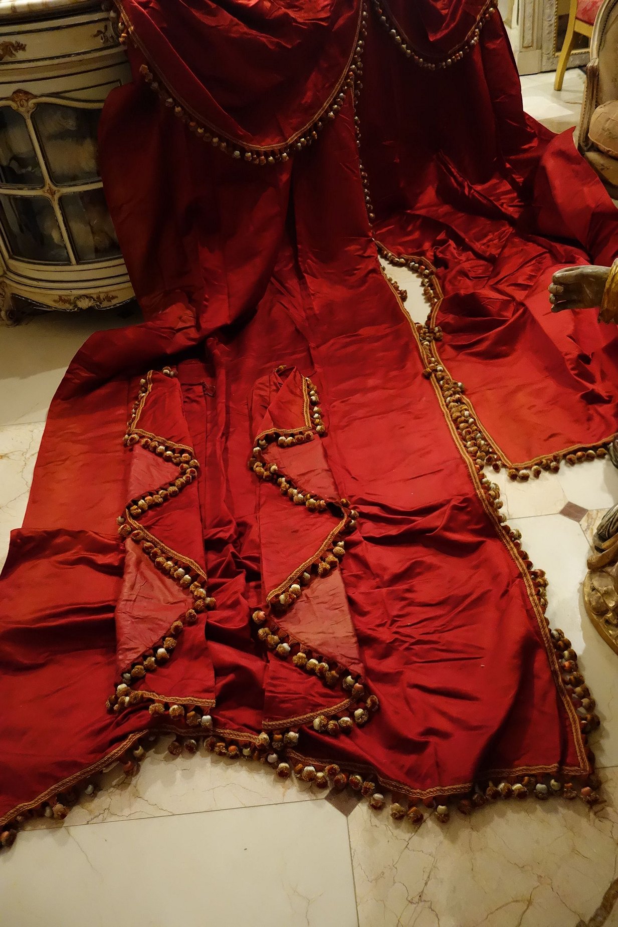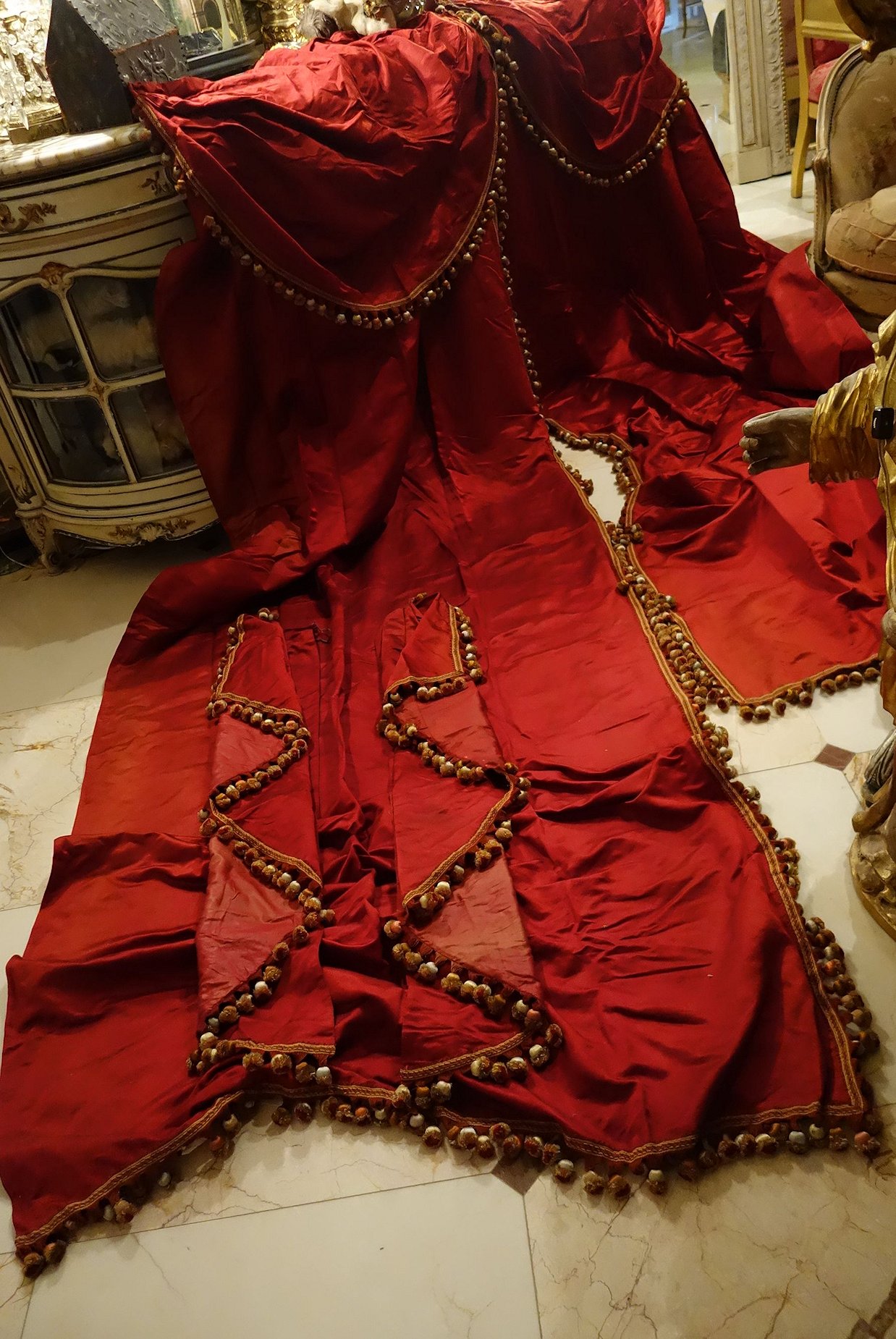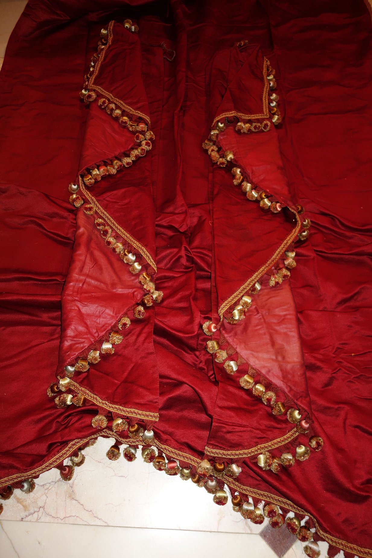 MM70/Pg5/PoppyFrenchDrapes. French Antique Gorgeous Silk Poppy color similar to paprika color drapes with matching two swags and another 2 matching narrow side panels. Stunning rich color of reddish orange from a French Chateau==Poppy/Paprika colour of silk. Note: All the ball trimmings on this set have been removed totally and this comes with no trimmings. The photos were taken prior to removal of trimmings. They remain just as beautiful and one can add your color of trimmings if you prefer.
