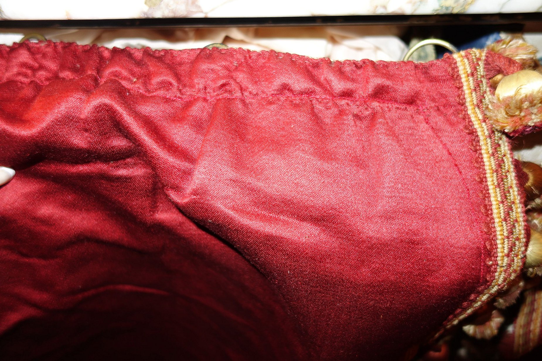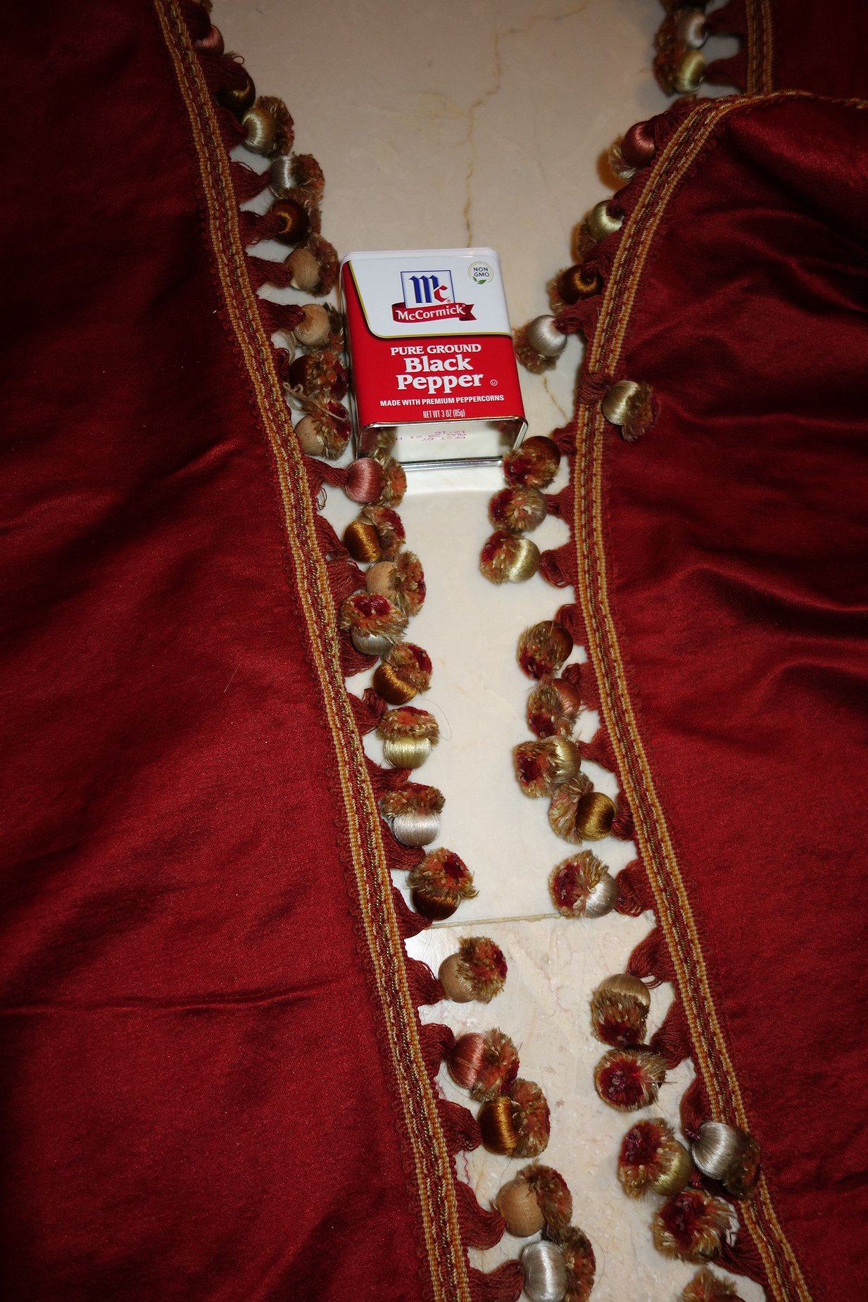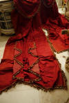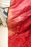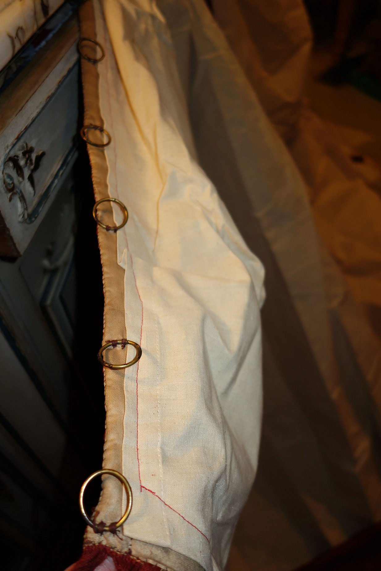 The muslin on the backside is strong and when hung they appear classy to adorn any room. The one panel shown in photo has a fading area from upper to middle on the side and could easily be hidden when they are hung. One panel has some rings still left on and the other panel no rings. I did not have the swags or narrow side panels lined with muslin--I left the original backings on these and fading is left on the backs of these. . I added the pepper container for you to see they are no way near red... they are more like a poppy/paprika colour--it very pretty the color & I hope they might match your decor. Due to age they do have a slight odor however if you hung outside in the breeze it should go away.. Please keep in mind these are very old and remain in their own charming way as shown and most certainly will adorn your window. Total of 6 charming French Antique Drapes--Valances/ Swags pieces.