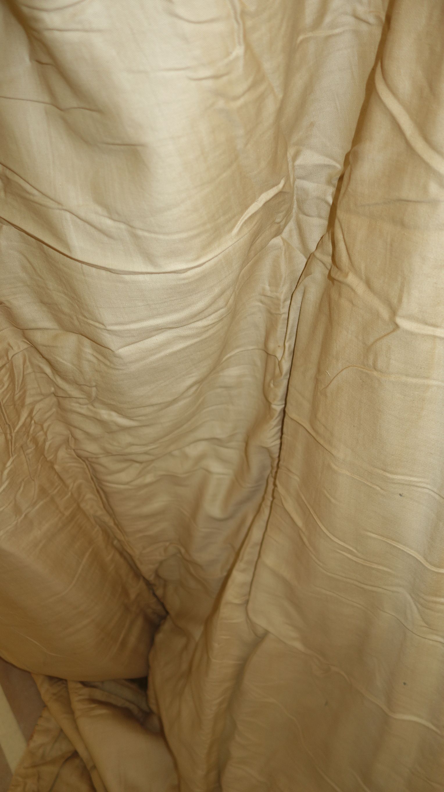 Antique French Large Panel of Drapes Curtains consisting of a set of 4 lovely panels as shown. Two of the panels are extremely long and angles beautifull at the bases as the other two panels are straight across. Stunning appearance and double lined with cotton in between in addition to the backing lining for extra warmth and thickness. More infor. coming as soon as more photos are taken by myself.